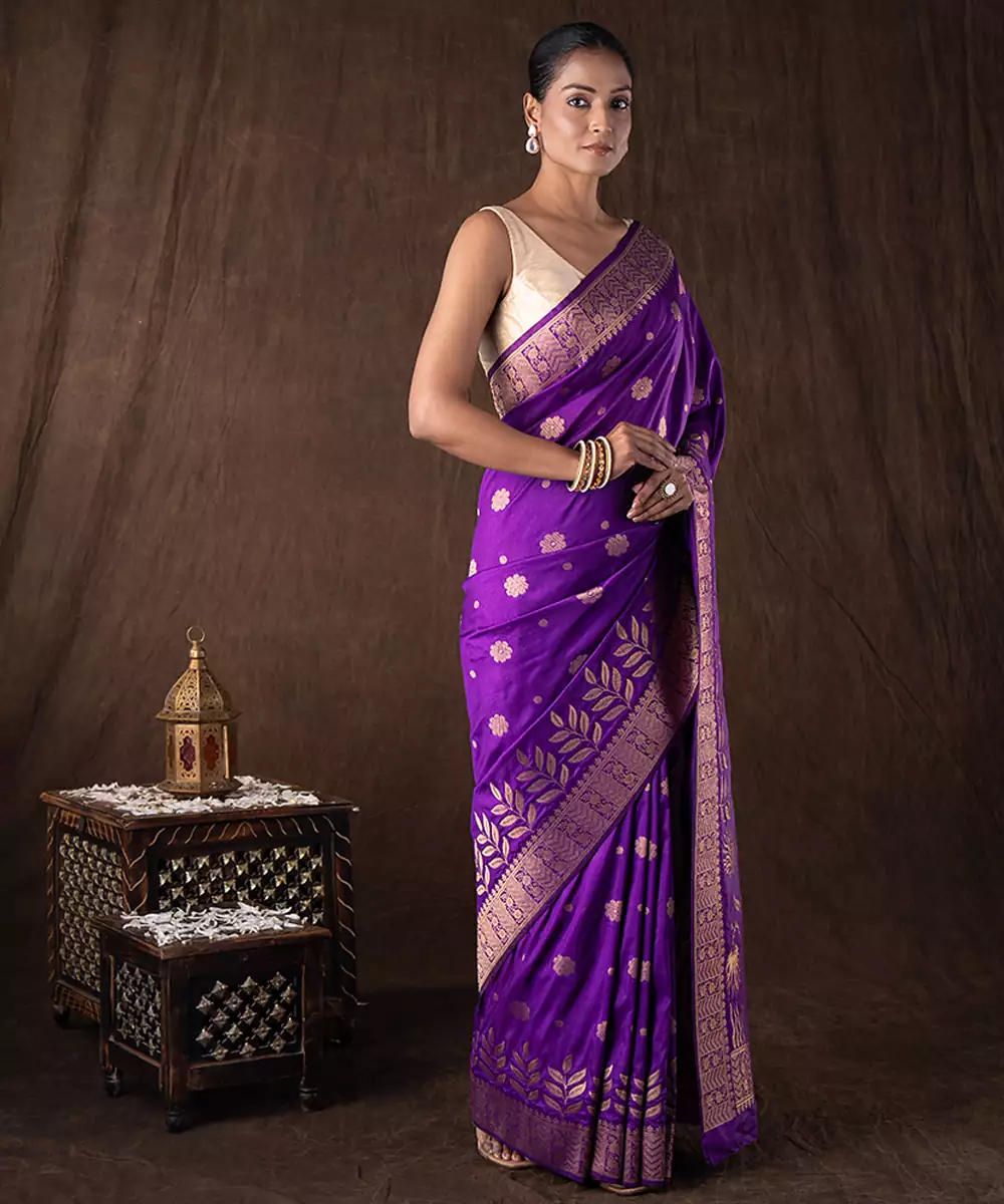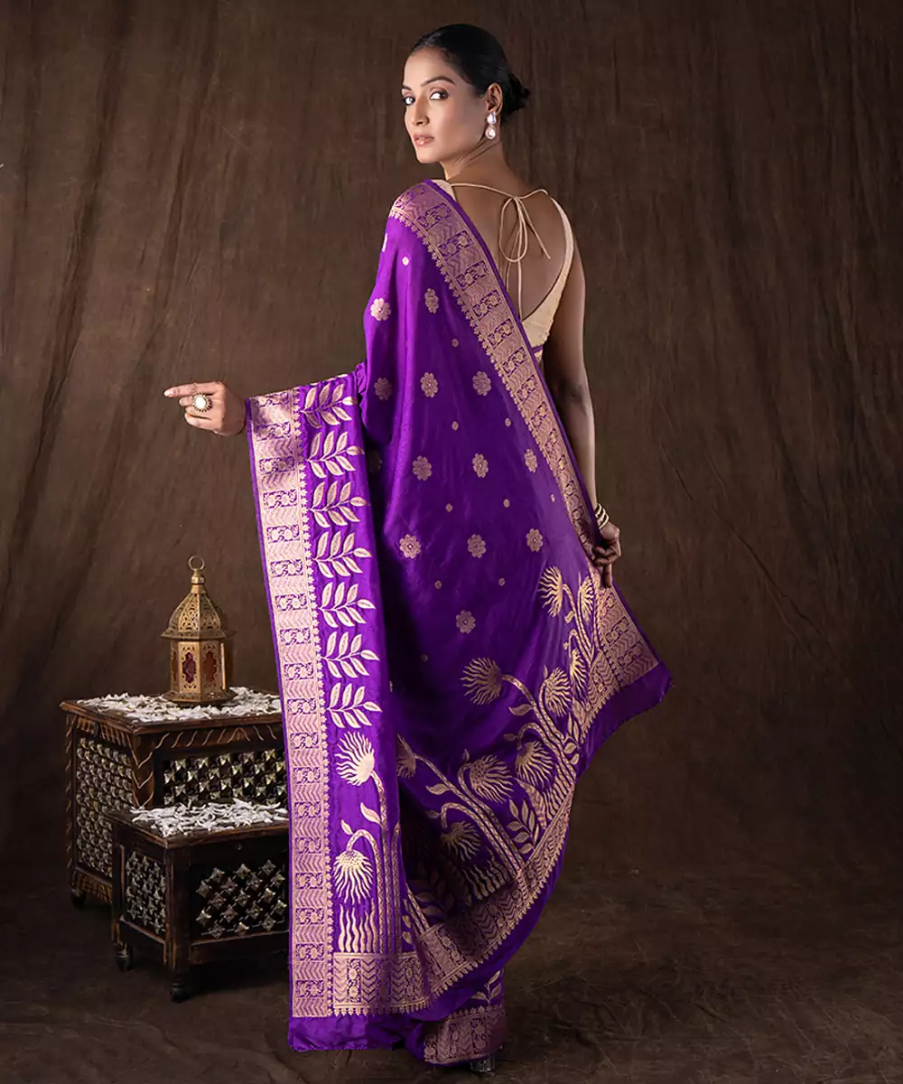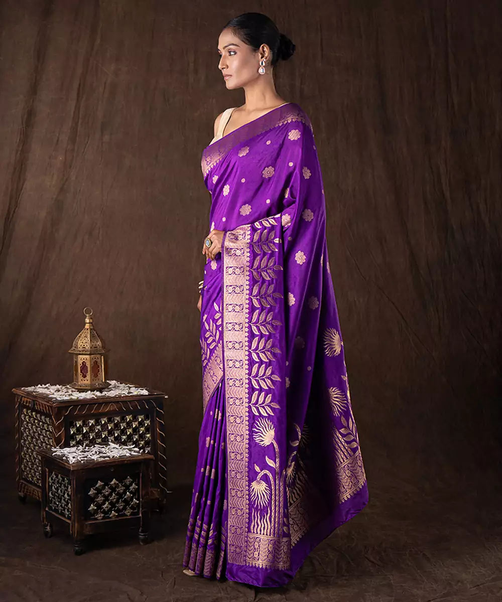 This Purple Banarasi Silk Saree Is Crafted With Intricate Handloom Weaving That Highlights Its Regal Charm. The Rich Color And Luxurious Texture Create A Striking Look, Perfect For Weddings Or Celebrations. Style It With Statement Jewelry To Enhance Its Elegance And Achieve A Classic, Timeless Appearance Effortlessly.