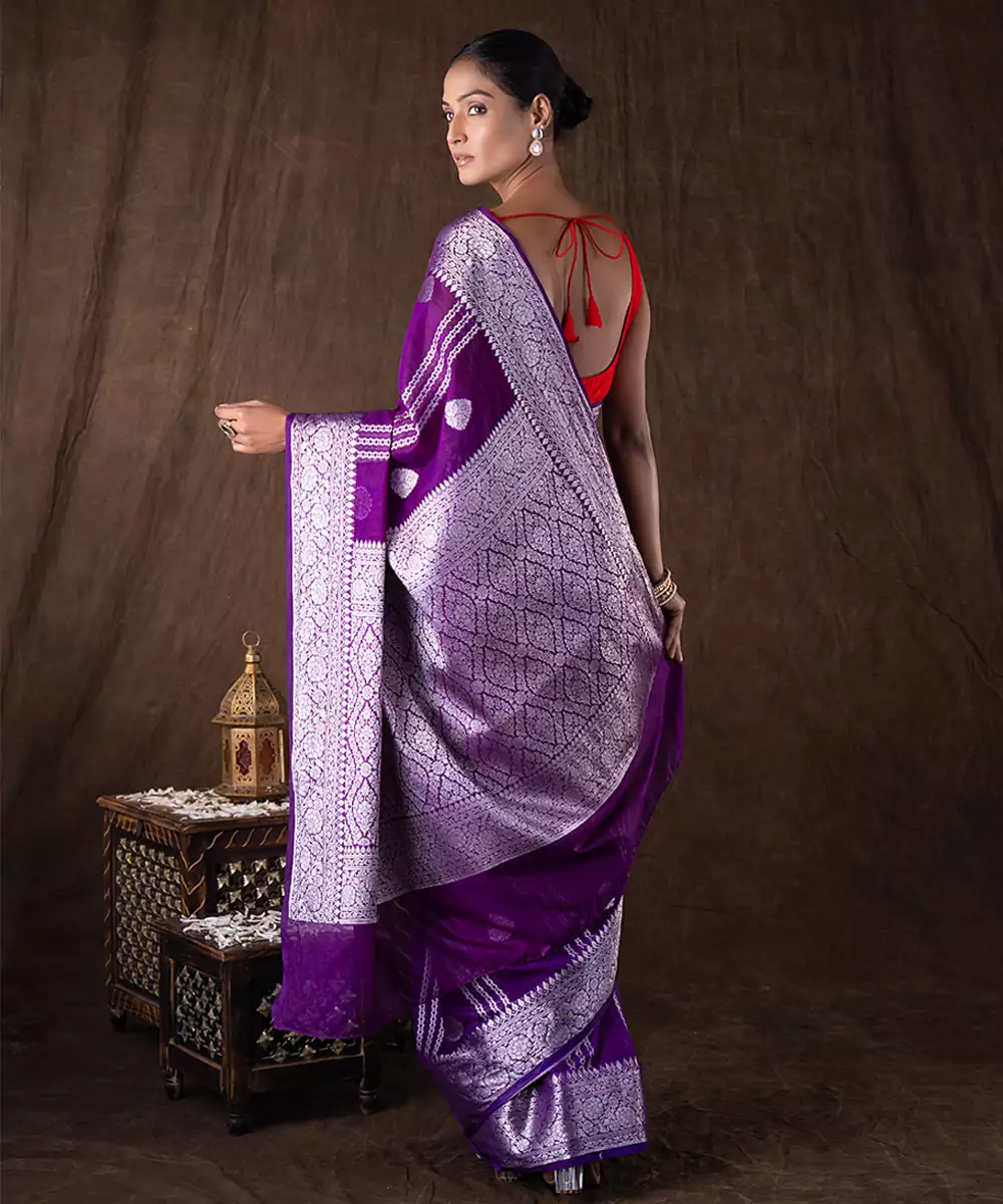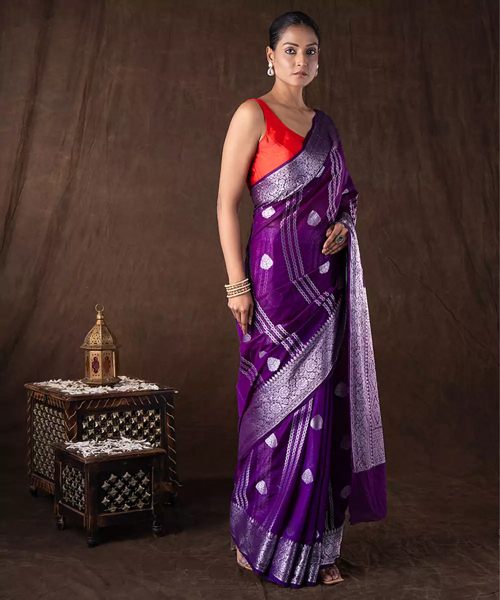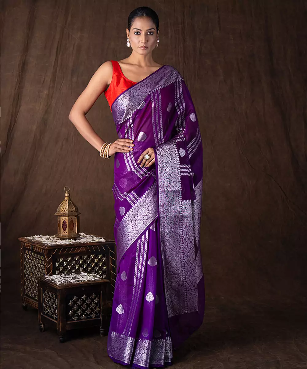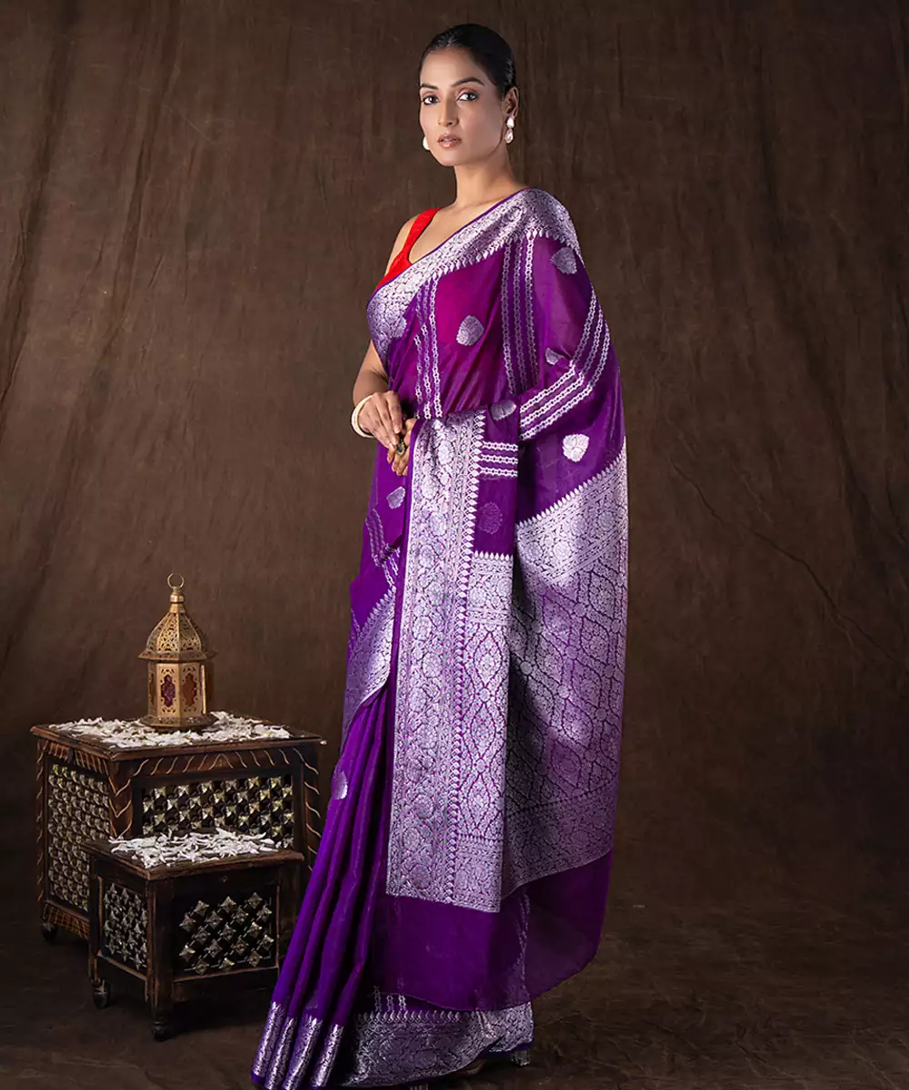 Crafted In Luxurious Pure Silk, This Purple Saree Features A Smooth Texture And Elegant Drape. The Rich Hue Adds A Regal Touch, Making It Ideal For Festive Occasions. Pair It With Statement Accessories For A Refined And Sophisticated Look That Blends Tradition With Modern Elegance.
