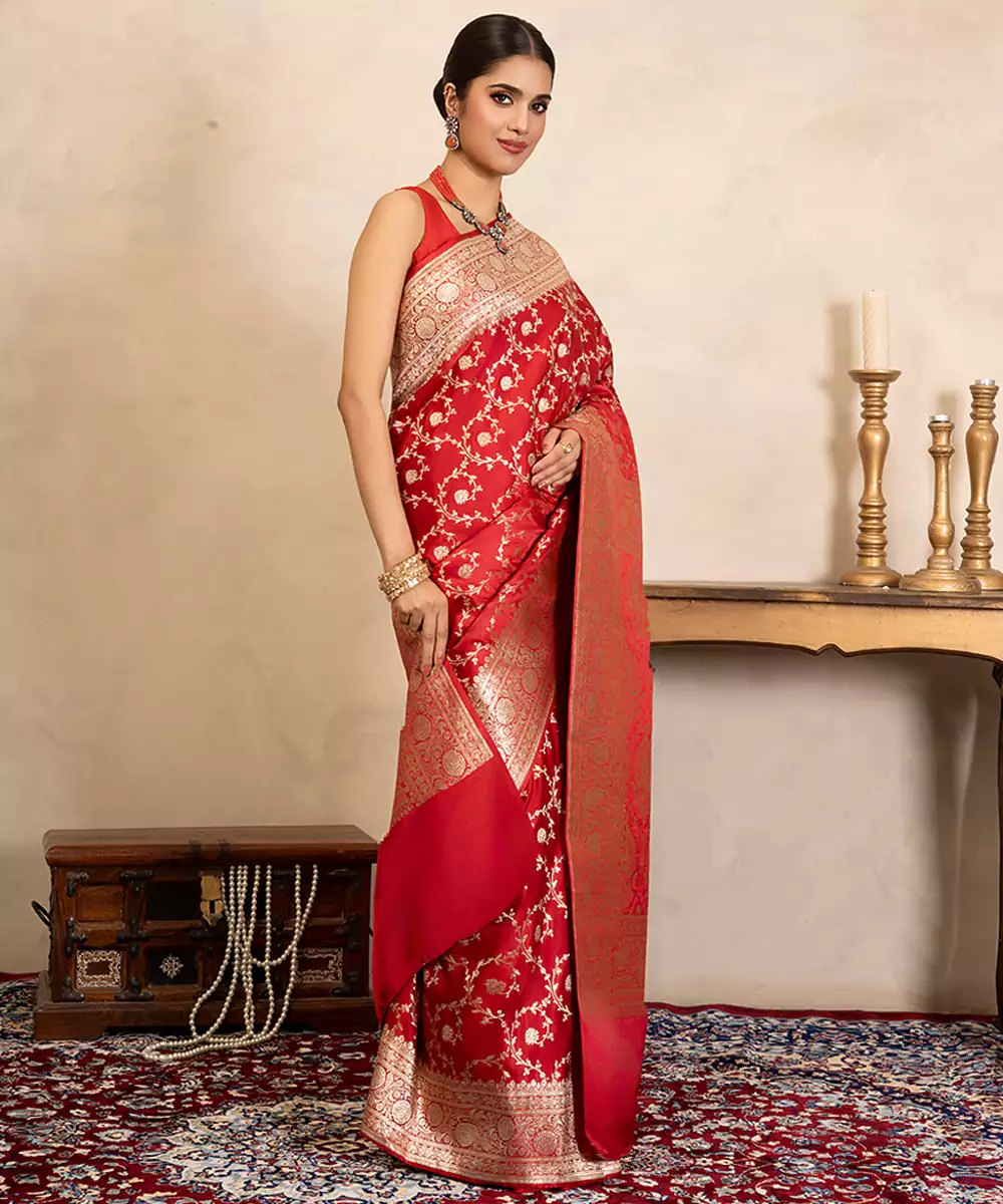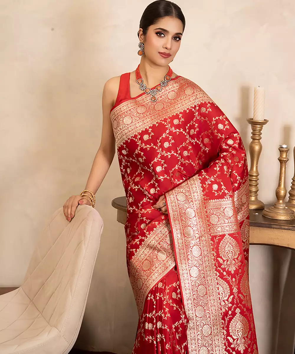 This Red Banarasi Silk Saree Features Intricate Handwoven Patterns That Reflect Heritage Craftsmanship. Its Rich Texture And Vibrant Hue Make It Ideal For Weddings And Celebrations. Style It With Traditional Jewelry For A Regal, Timeless Look Full Of Elegance And Cultural Beauty.