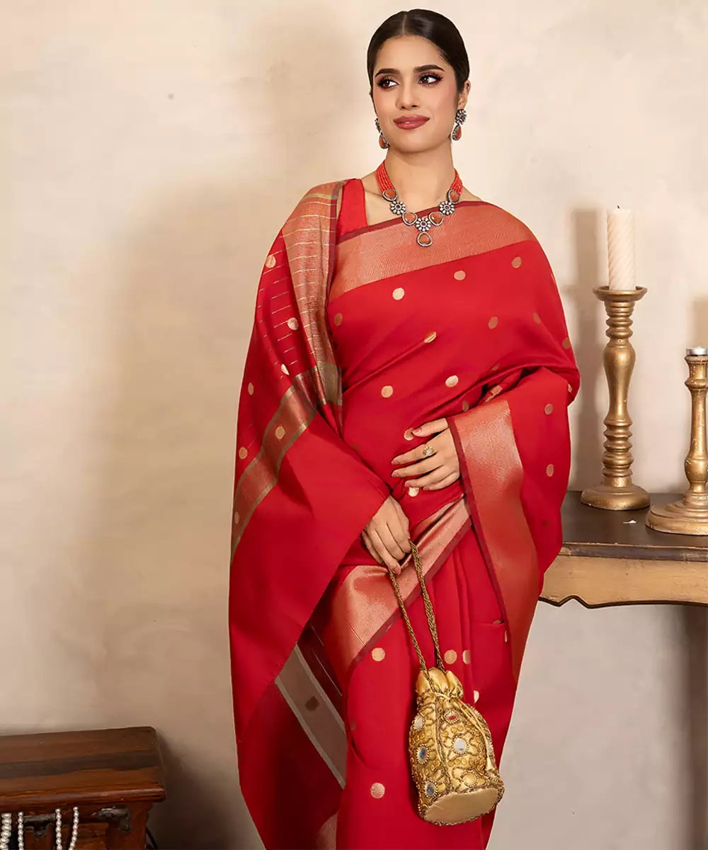 This Red Chiffon Silk Saree Offers A Lightweight And Airy Feel With A Graceful Drape. Crafted With Handloom Finesse, It Combines Comfort With Elegance. Perfect For Festive Or Evening Occasions, It Pairs Beautifully With Statement Accessories For A Refined And Stylish Appearance.