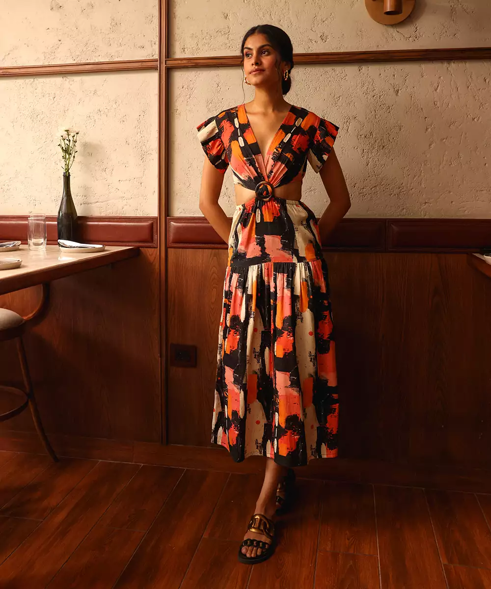 Vienna Dress Featuring Ruffled Sleeves, An Open Waist, And A Chic Buckle Detail. Colour : Multicolor Fabric : Cotton Components : 1 Dress Work : Printed