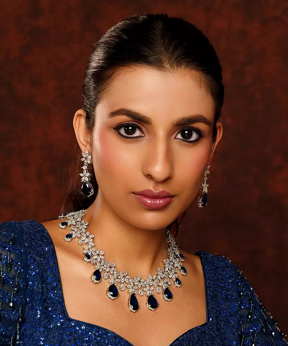 Featuring A Bold Diamond Necklace In White Finish With Blue Stones. It Comes With A Pair Of Matching Earrings. It Gives You A Luxurious And Sophisticated Appeal. It Is A Statement Piece And Will Make You Stand Out In Any Occasion.