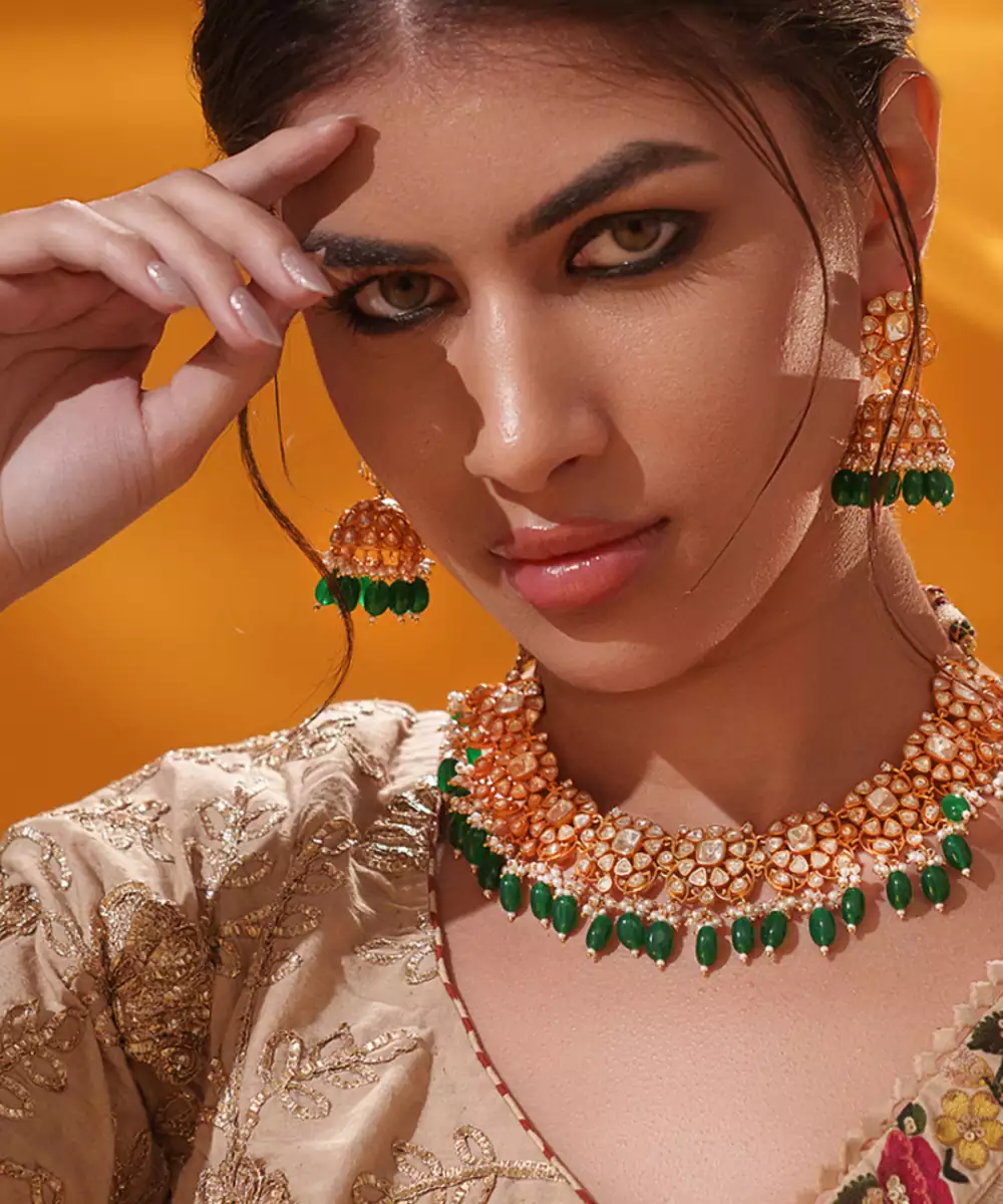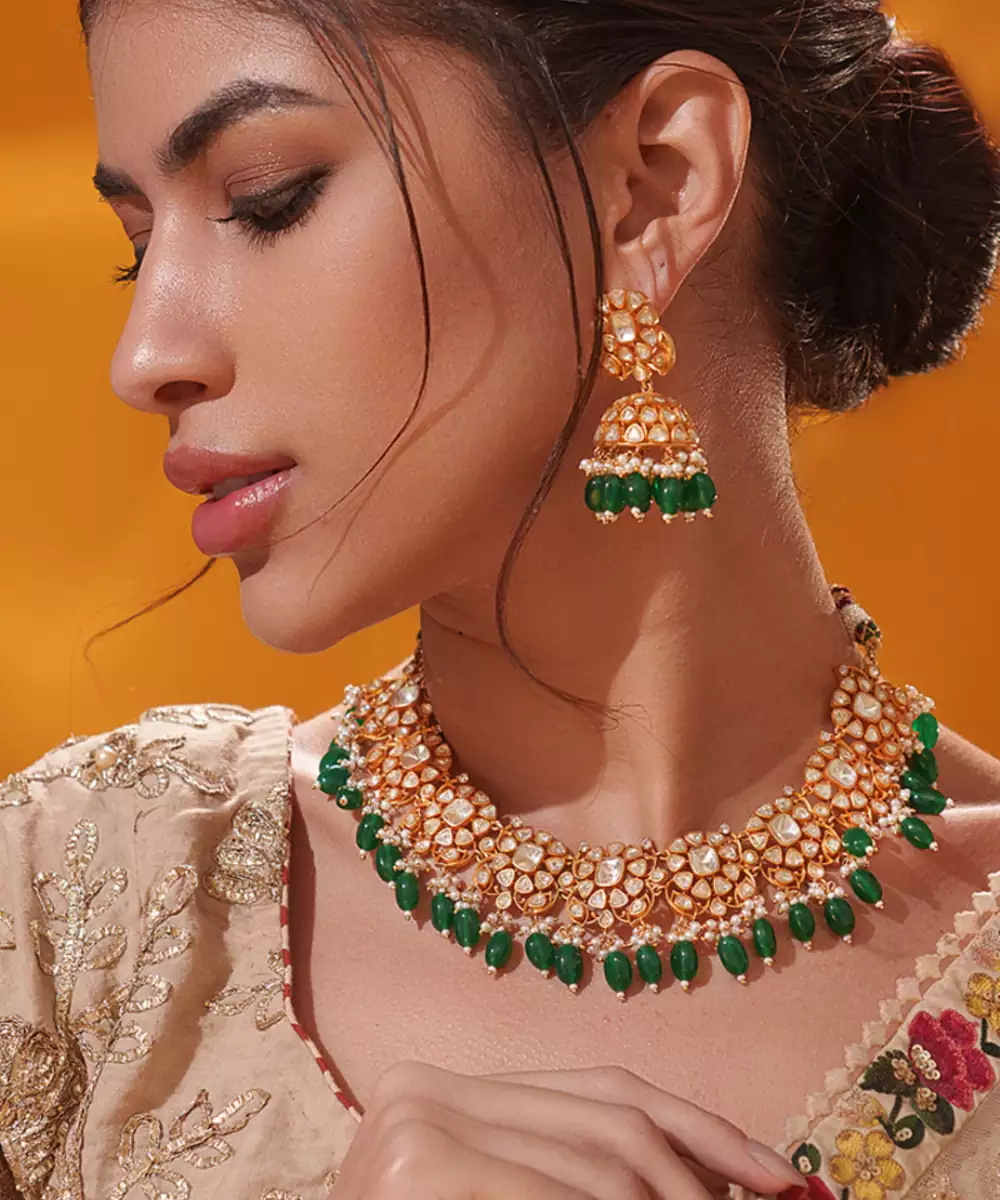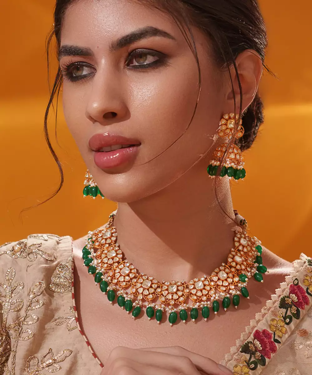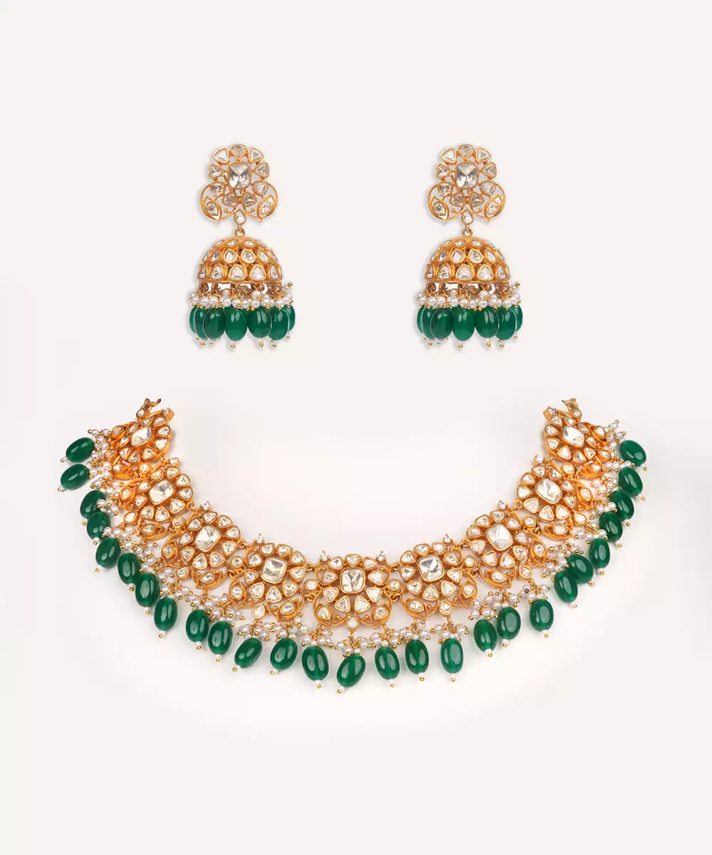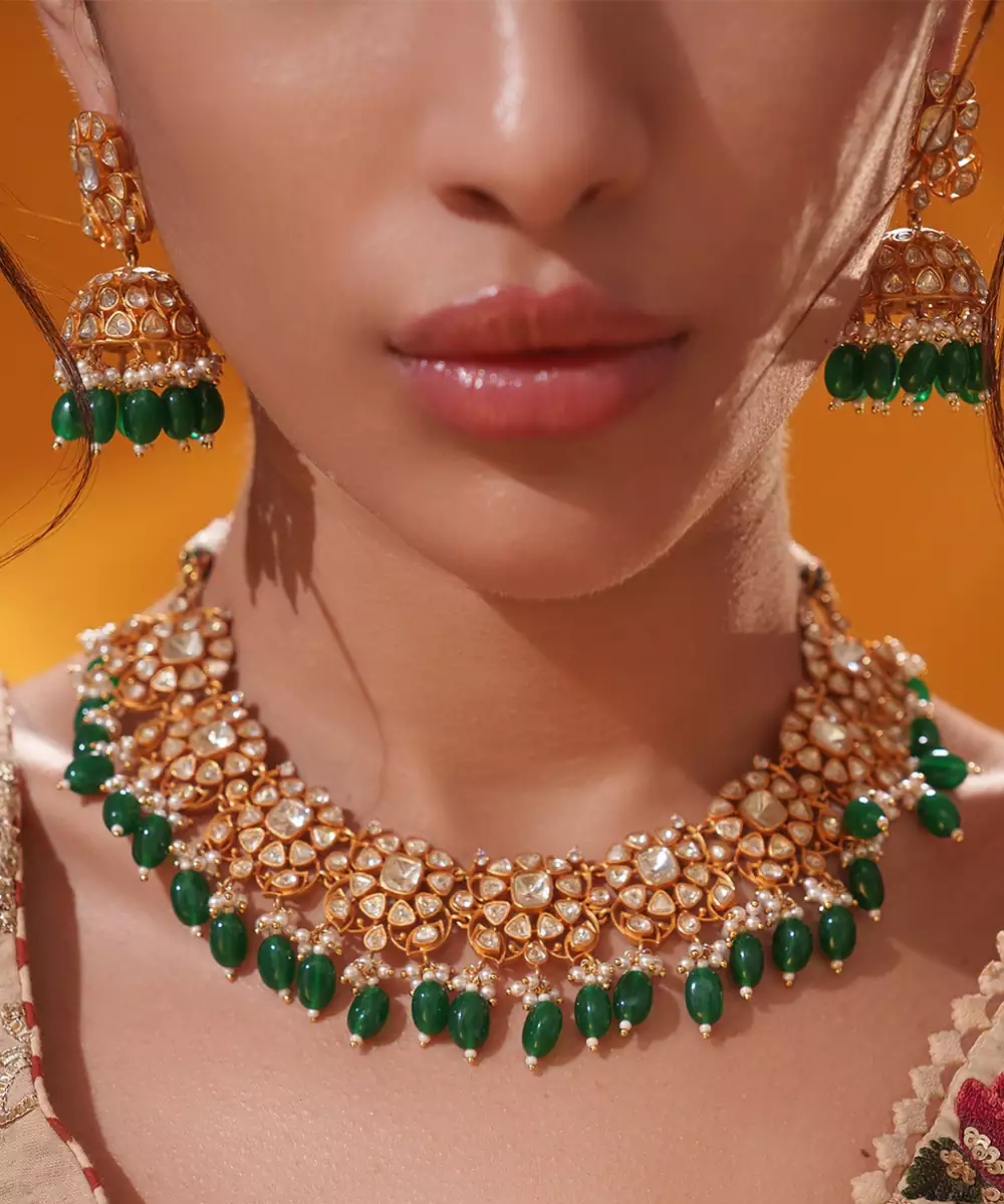 Dramatic Moissanite Set With Green Pearls Along With Matching Jhumki Earrings. Perfect To Make A Statement At Any Occasion.