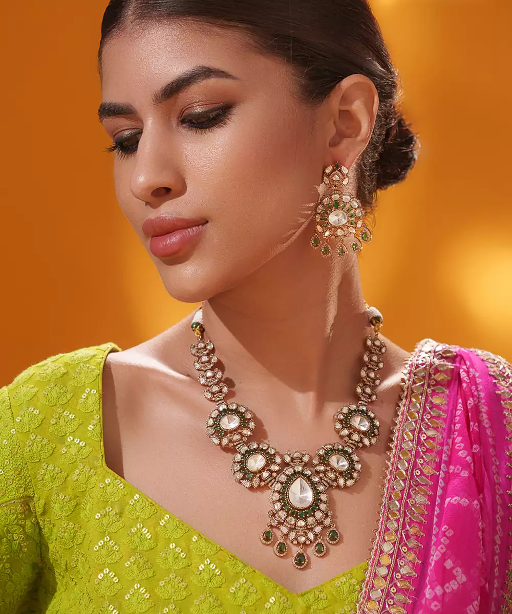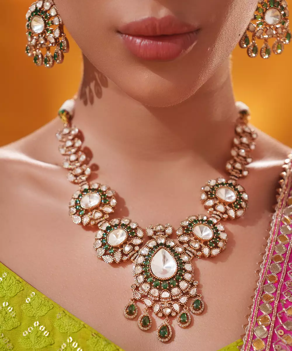 Featuring A Majestic Polki Long Necklace Set That Embodies Grandeur And Timeless Beauty, This Design Is Crafted With Bold Uncut Stones, Deep Green Accents, And Intricate Detailing. Paired With Matching Earrings, It's A Showstopping Piece Perfect For Bridal Or Festive Celebrations.