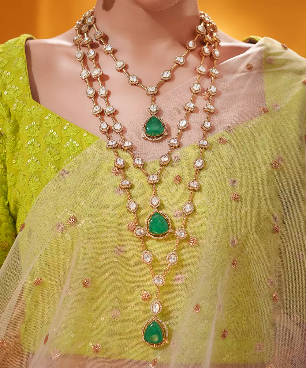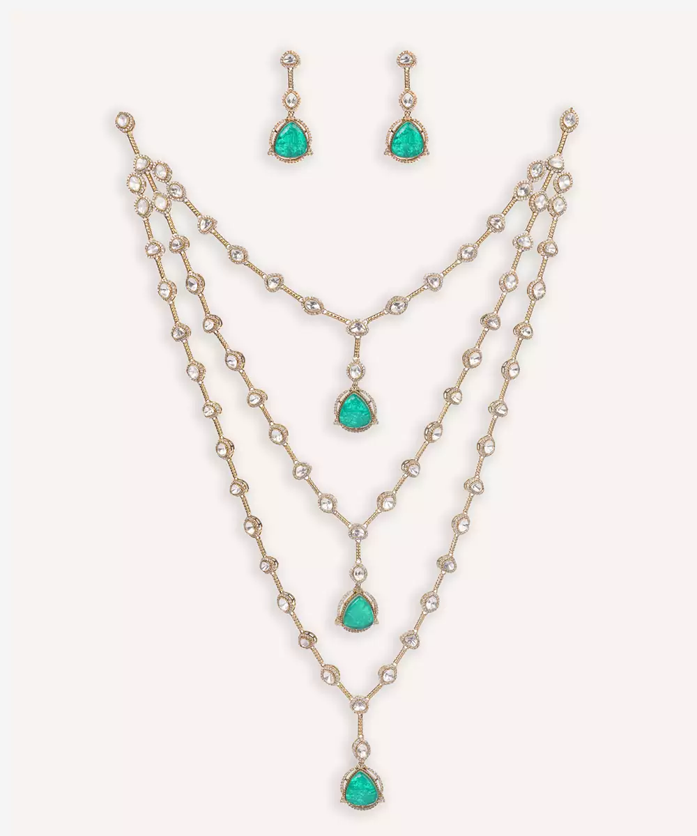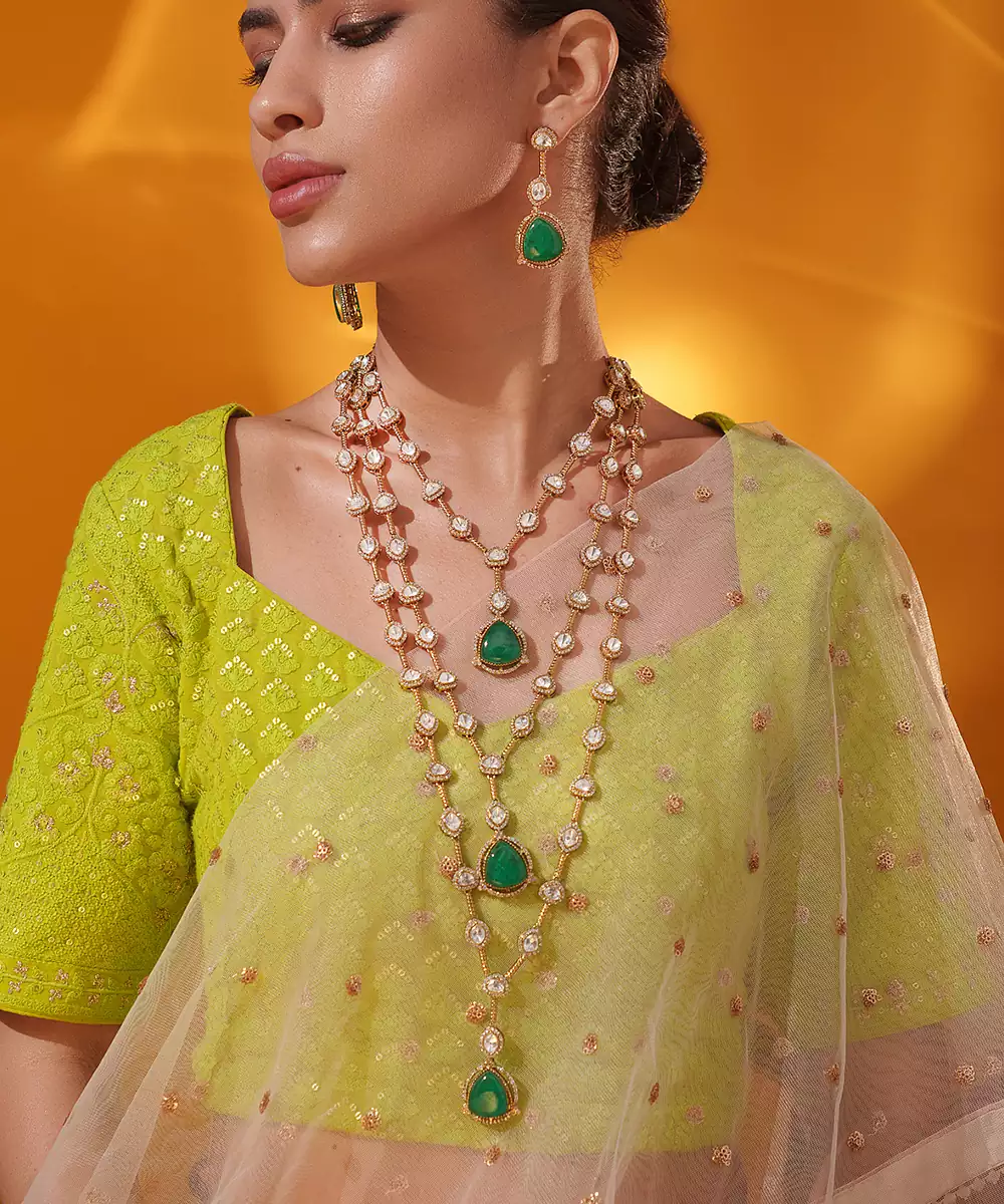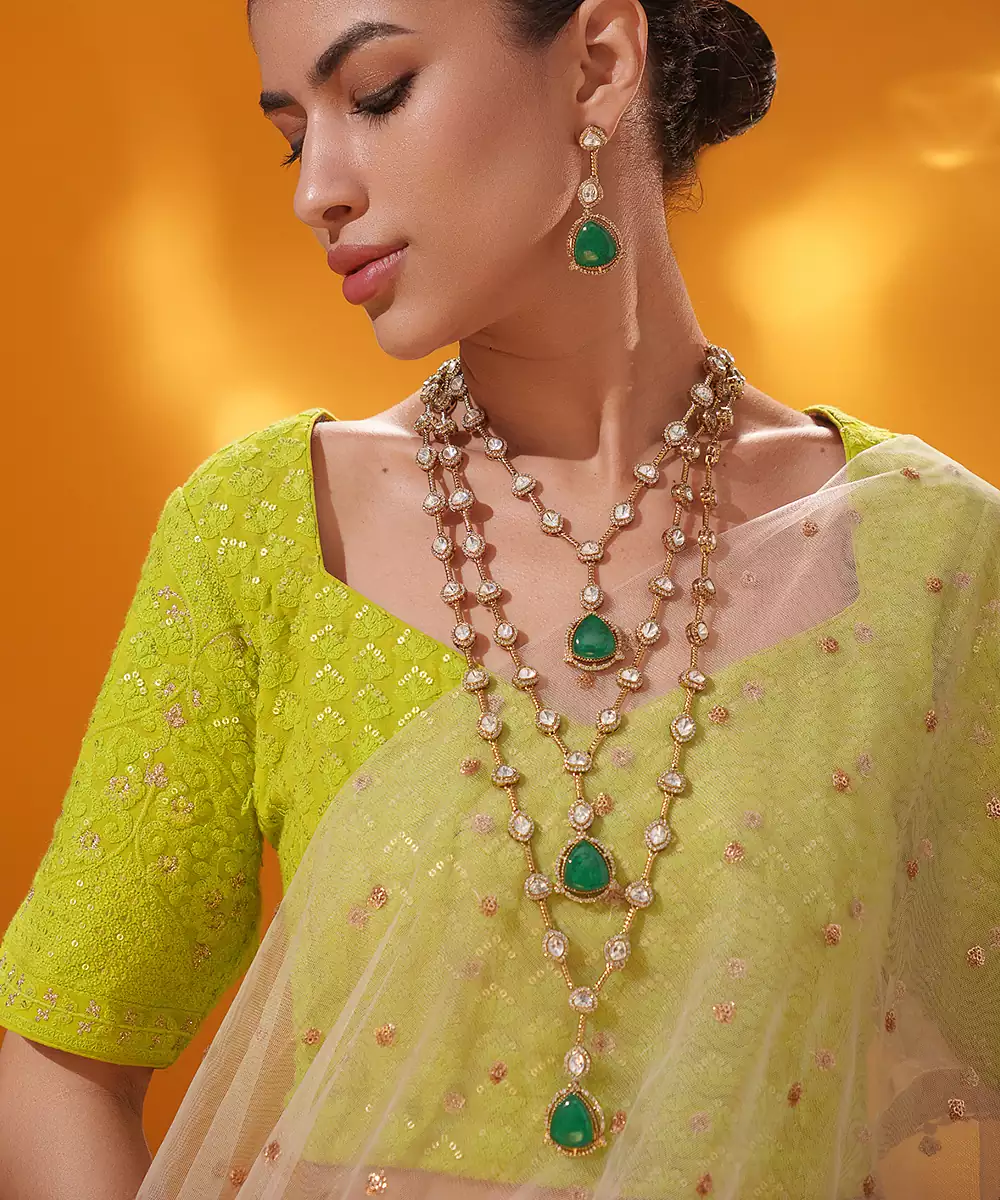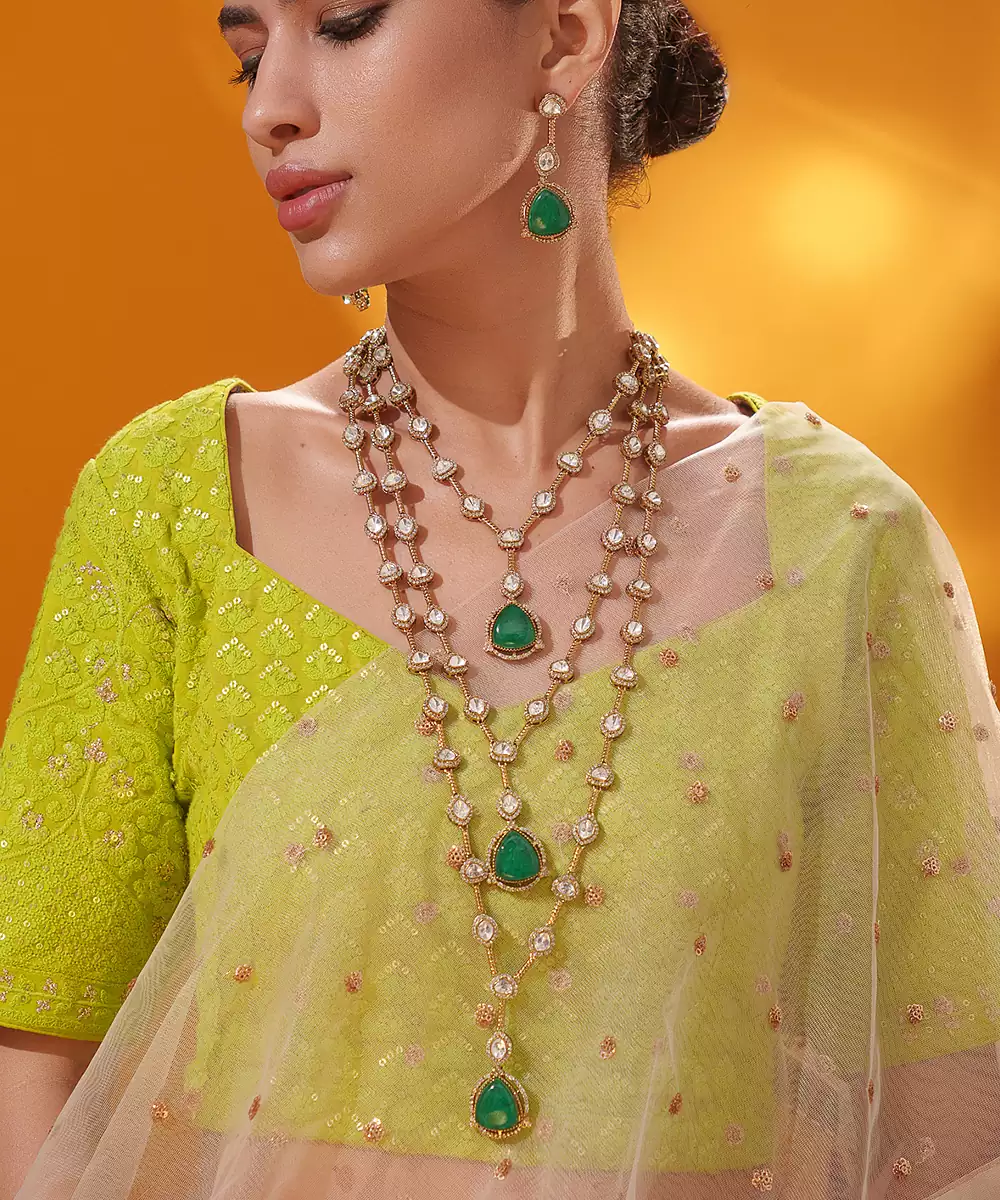 Featuring A Grand Four Layered Design In Two Tone Finish, This Necklace Set Is Adorned With Dazzling Kundan Work Beautifully Paired With Striking Green Stones At The Center Of Each Layer. The Elongated Silhouette Exudes Regal Charm, Making It Perfect For Bridal Or Festive Occasions. Complemented With Matching Earrings, This Piece Reflects A Perfect Balance Of Opulence And Timeless Grace.