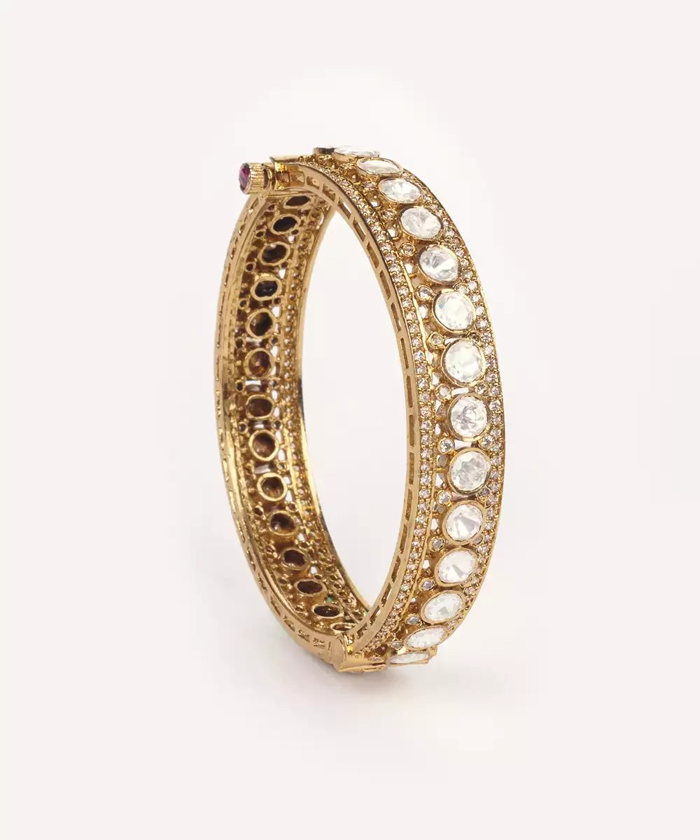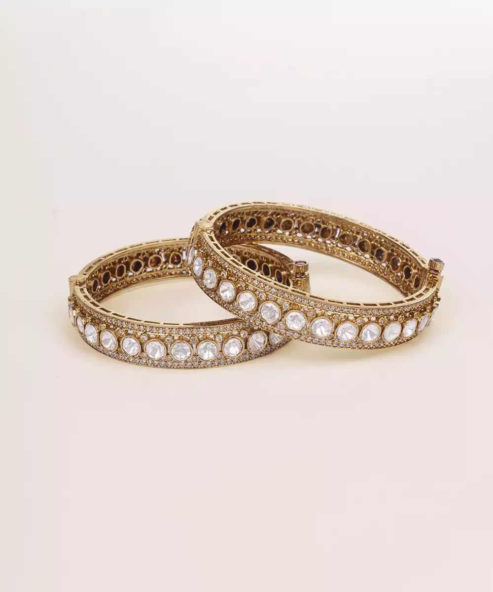 A Pair Of Elegant Bangles Adorned With Polki In Two Tone Finish. The Intricate Design Give The Bangles A Festive And Luxurious Appeal. They Look Ravishing With Every Outfit.