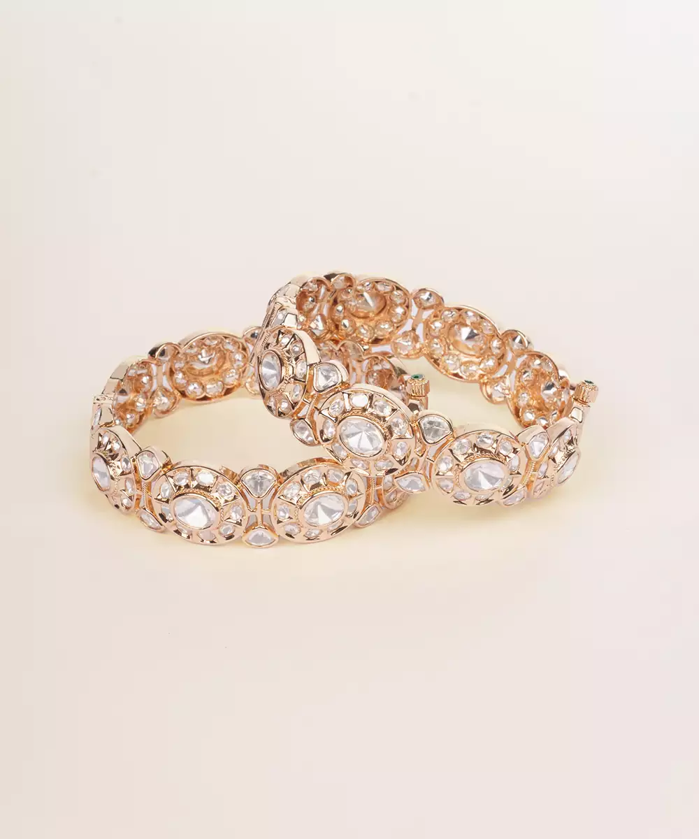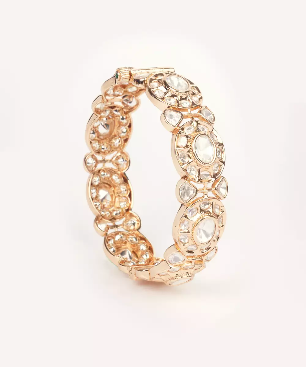 Traditional Yet Dramatic Pair Of Bangles With Bold Gold Finish And Differently Set Kundan Stones. Perfect For Weddings And Festive Occasions, They Add A Touch Of Heritage Charm To Any Traditional Attire.
