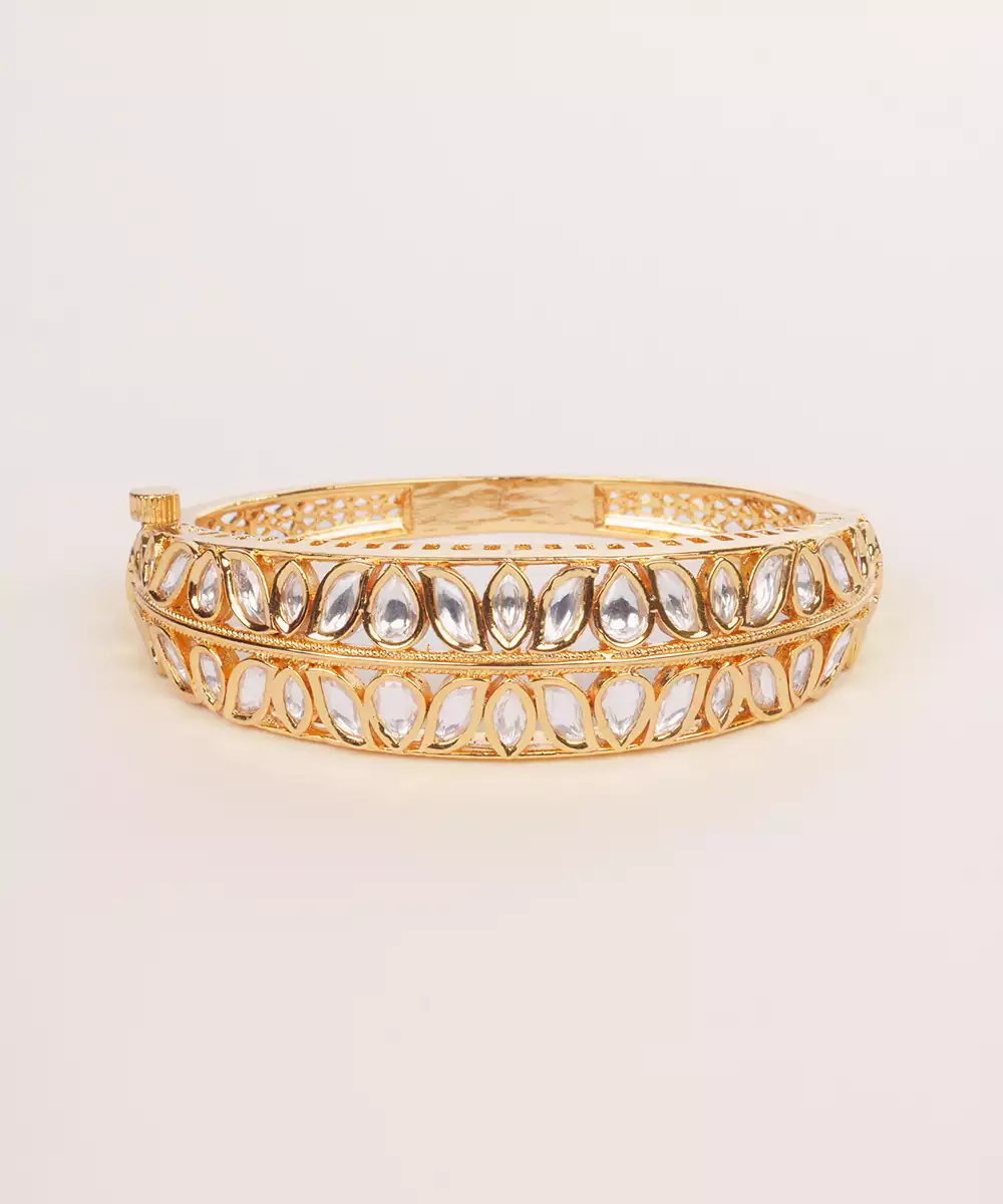 Elegant Openable Bangle Featuring A Graceful Arrangement Of Kundan Stones In Gold Finish. Adding A Touch Of Artisanal Charm, It Is Ideal For Weddings And Grand Celebrations.