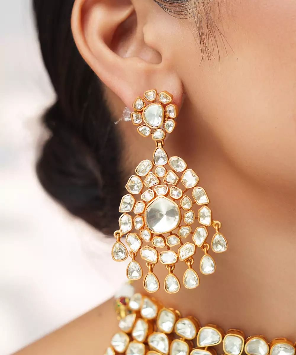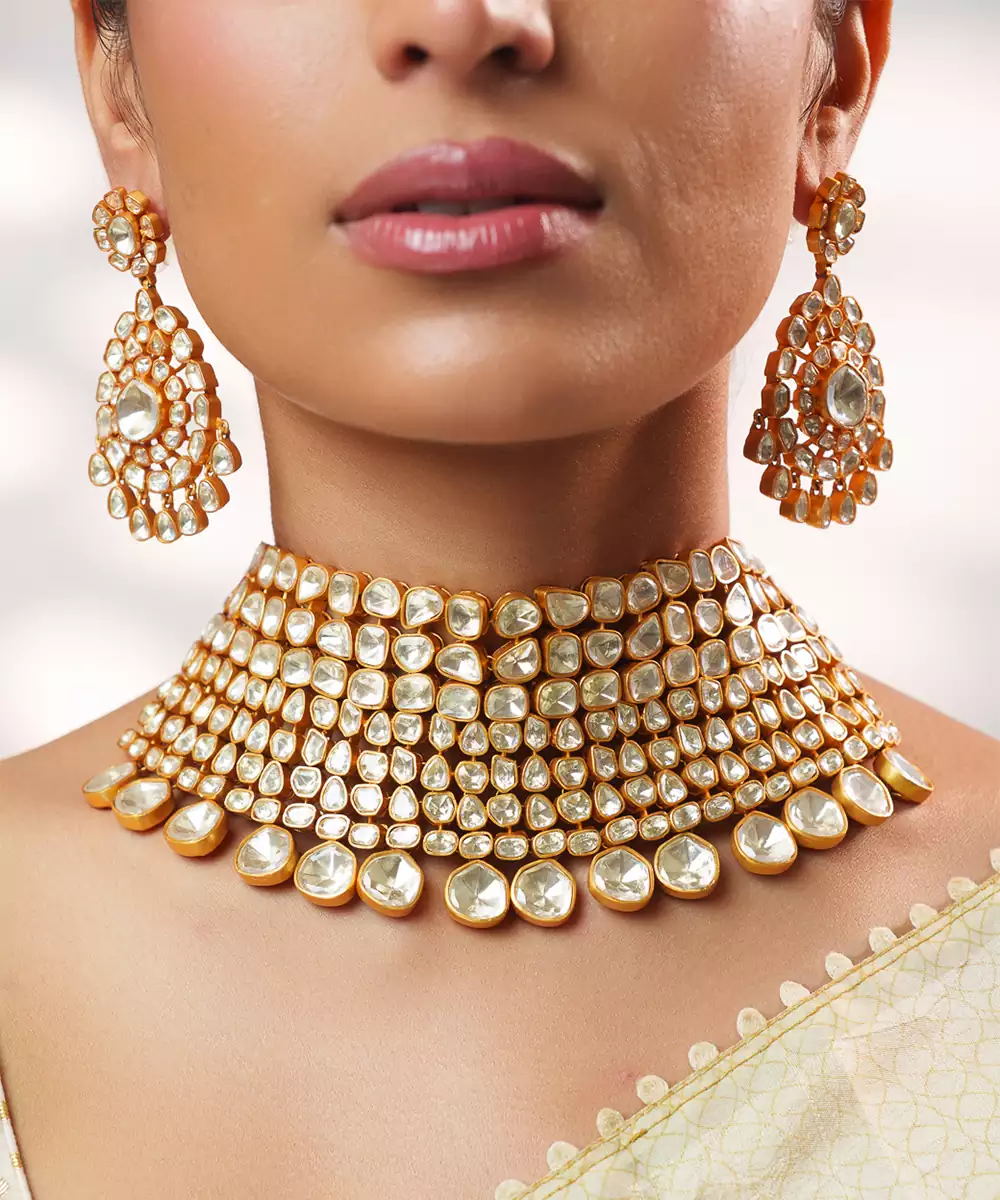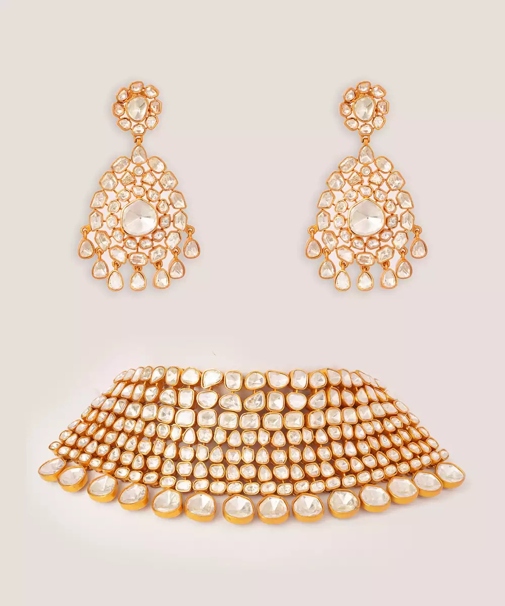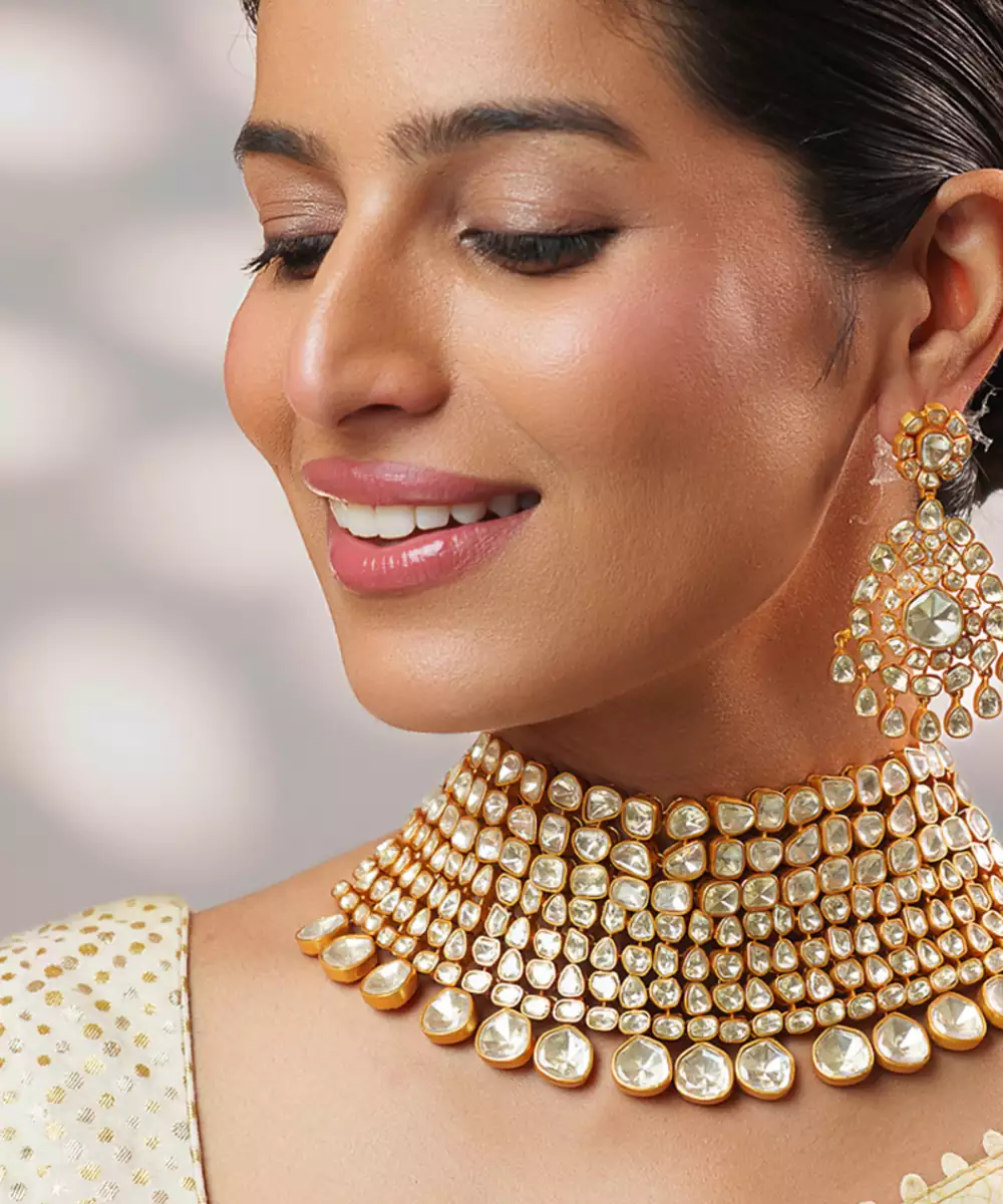 This Gold Plated Kundan Choker Necklace Set Embodies Regal Elegance And Timeless Craftsmanship. Featuring Intricately Set Kundan Stones And A Radiant Gold Finish, It Offers A Bold, Statement Appeal. Perfect For Weddings, Festive Occasions, Or Celebrations, It Beautifully Enhances Traditional Ensembles With Luxurious Charm And Refined Sophistication.
