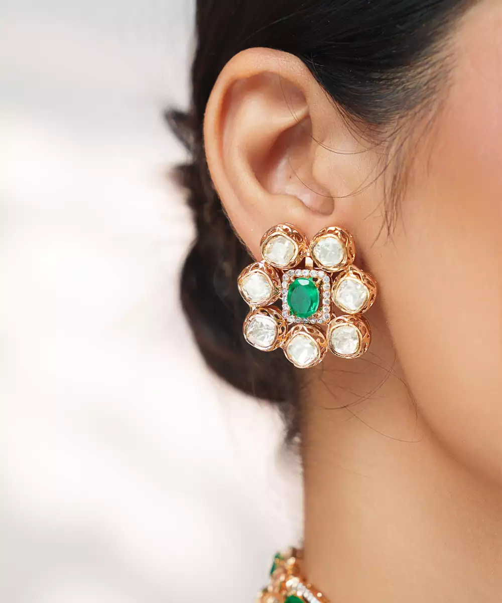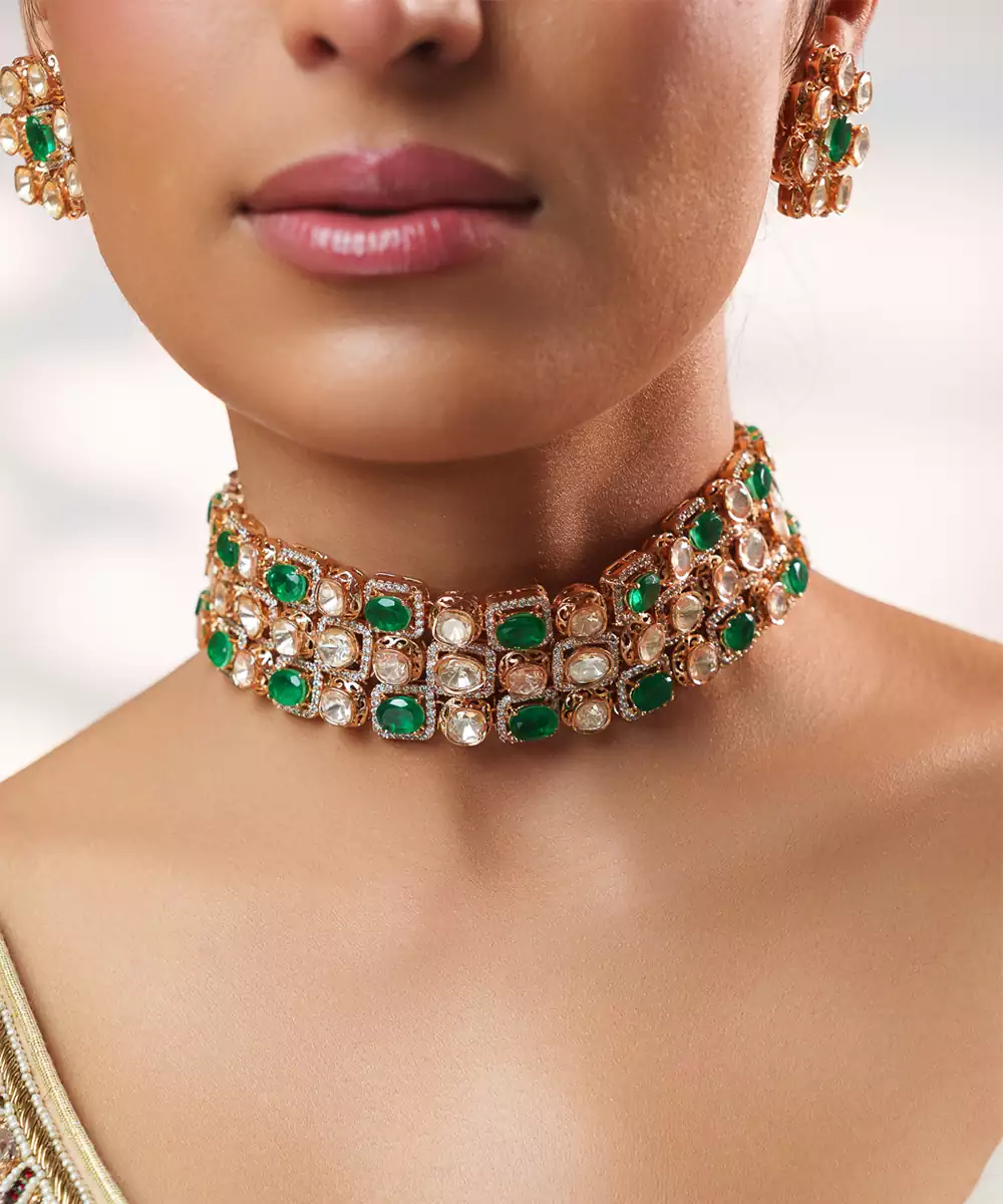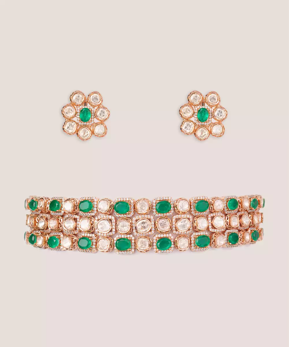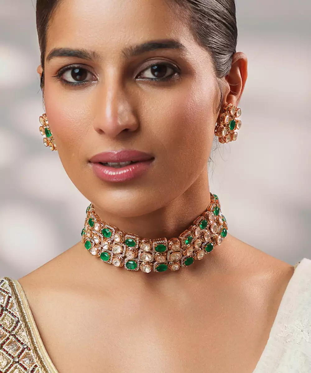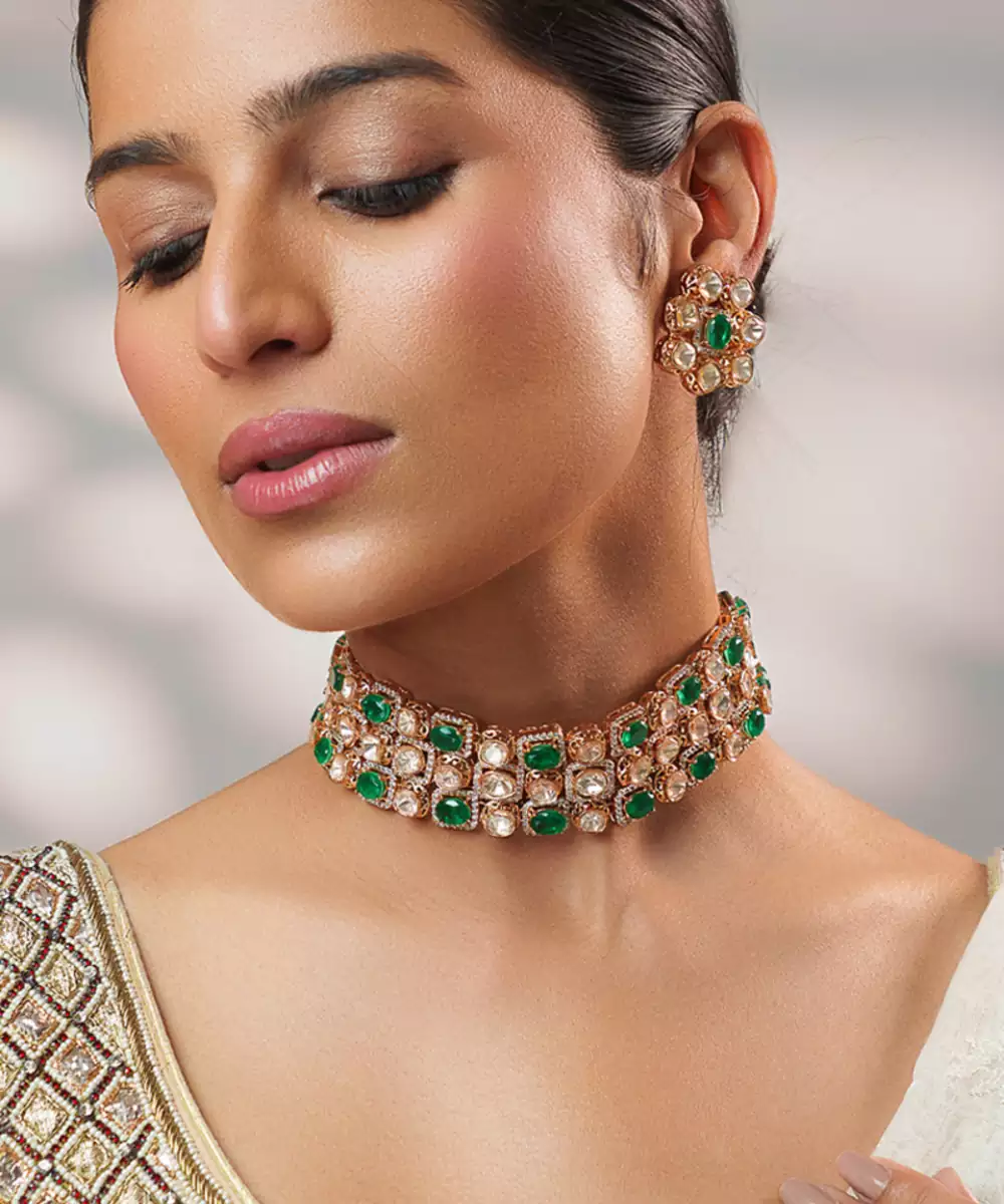 This Gold Plated Kundan Green Stone Choker Necklace Set Radiates Regal Elegance And Timeless Charm. Adorned With Beautifully Set Green Stones, It Showcases Intricate Craftsmanship And A Luminous Finish. Perfect For Weddings, Festive Celebrations, Or Special Occasions, It Adds A Rich Pop Of Color And Refined Sophistication To Any Traditional Ensemble.