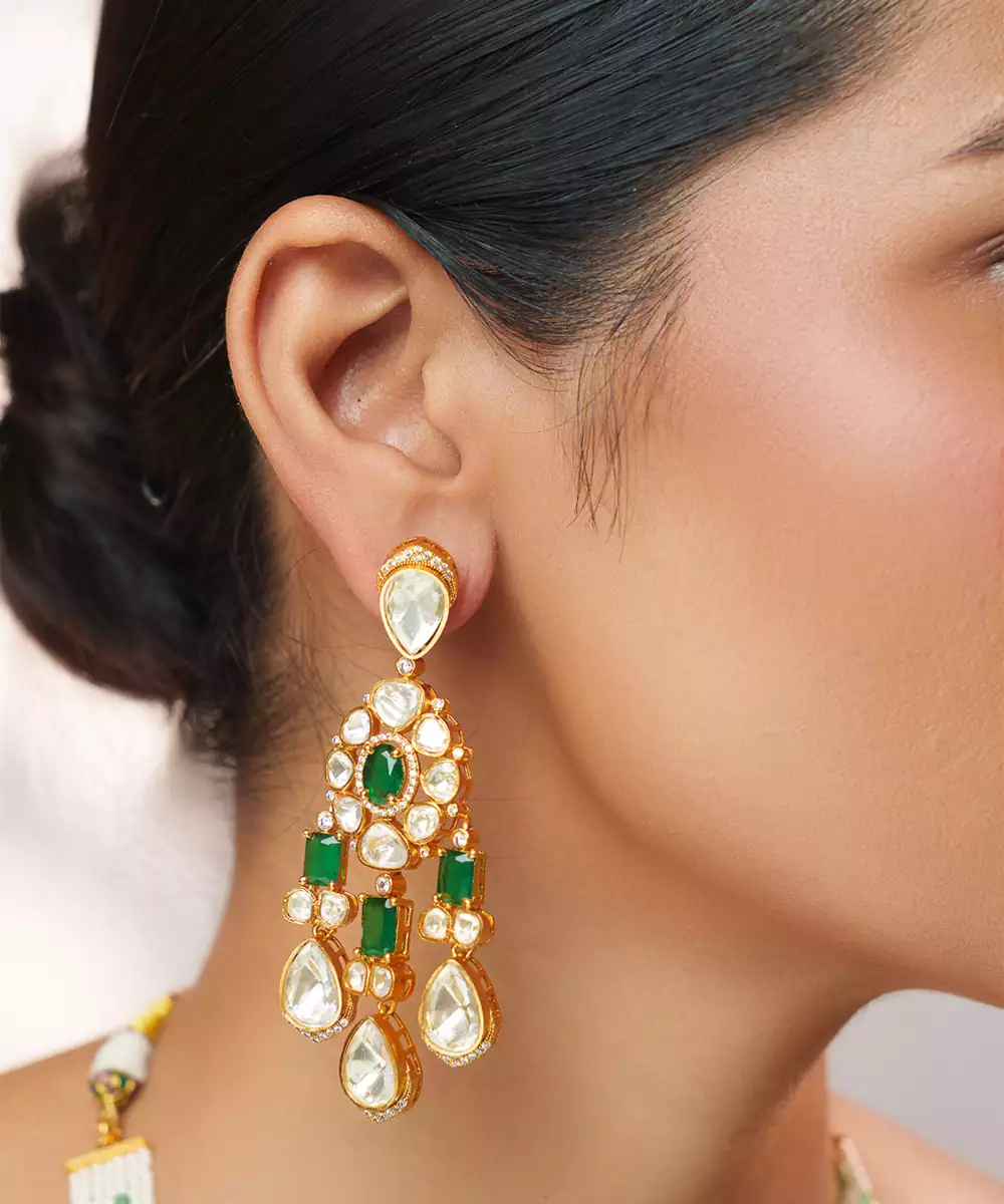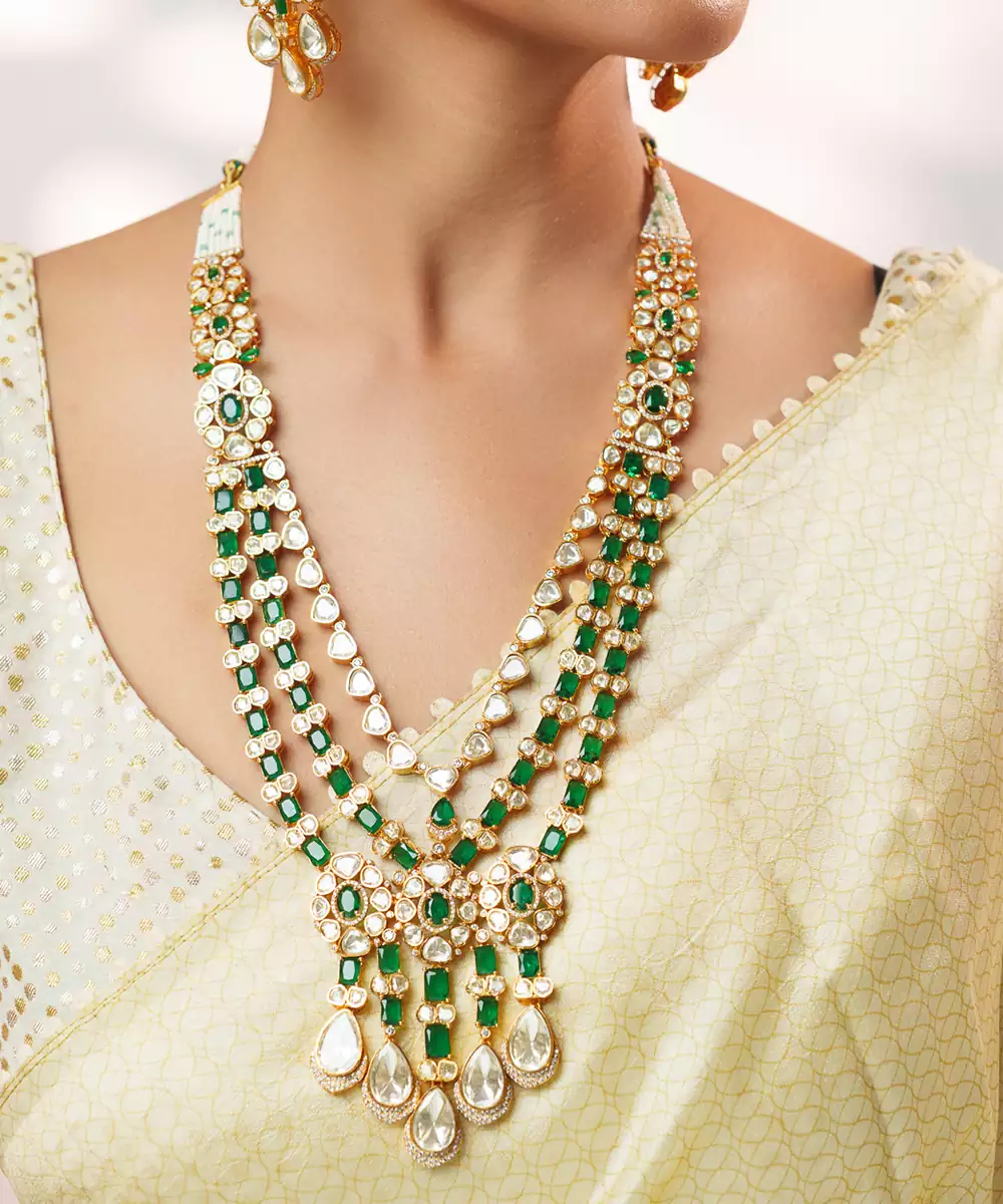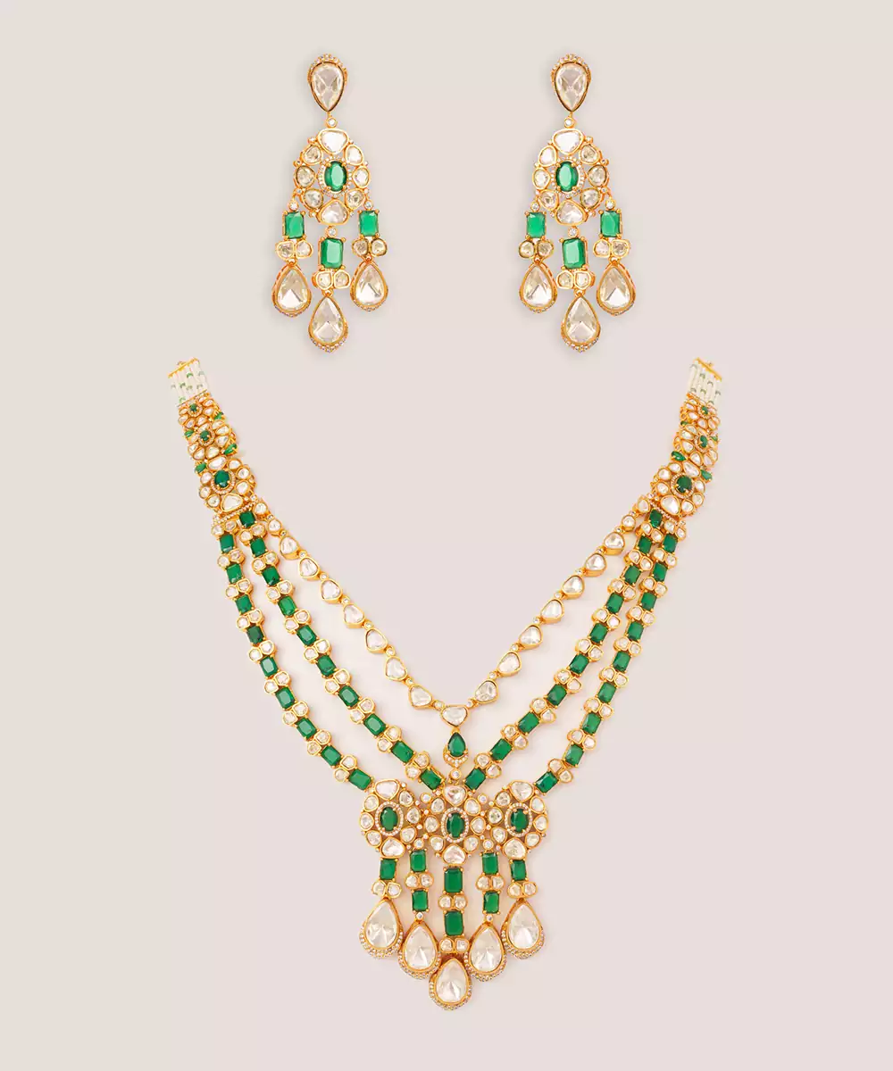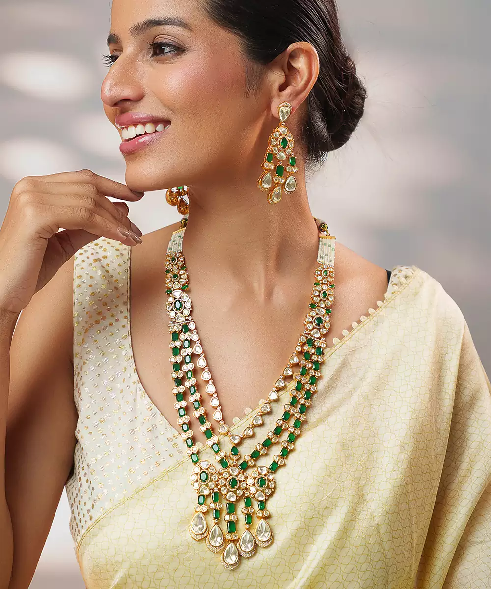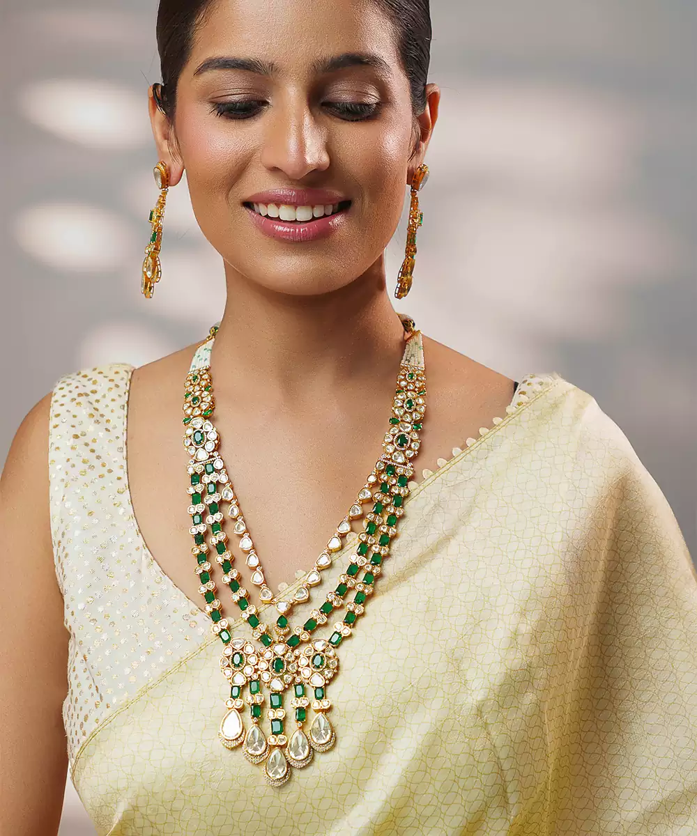This Gold Plated Kundan Green Stone Layered Necklace Set Showcases Regal Elegance And Traditional Artistry. Featuring Beautifully Layered Strands Adorned With Vibrant Green Stones, It Reflects Intricate Craftsmanship And A Radiant Finish. Perfect For Weddings, Festive Occasions, Or Celebrations, It Adds Rich Color, Luxurious Depth, And Timeless Sophistication To Ethnic Ensembles.