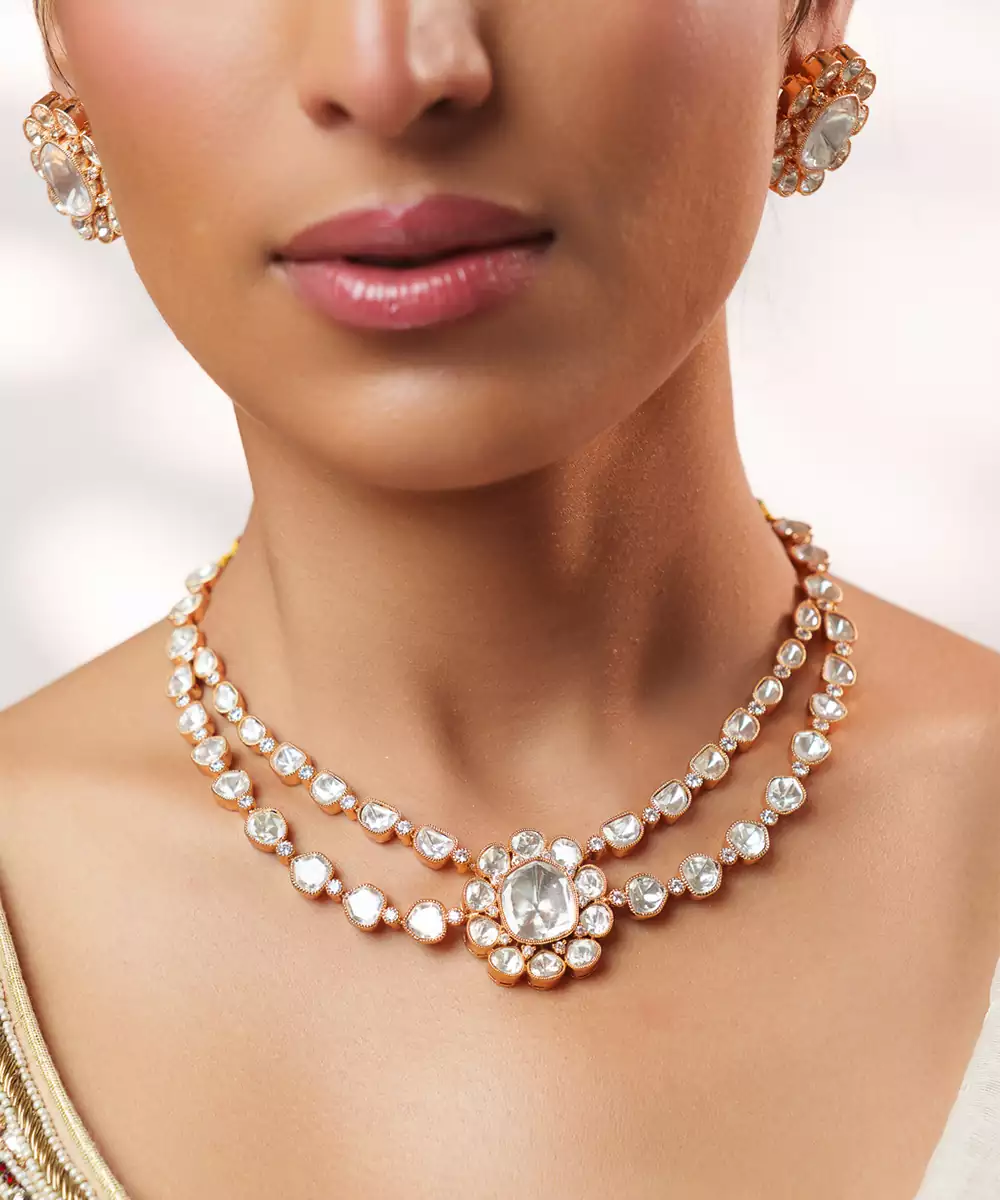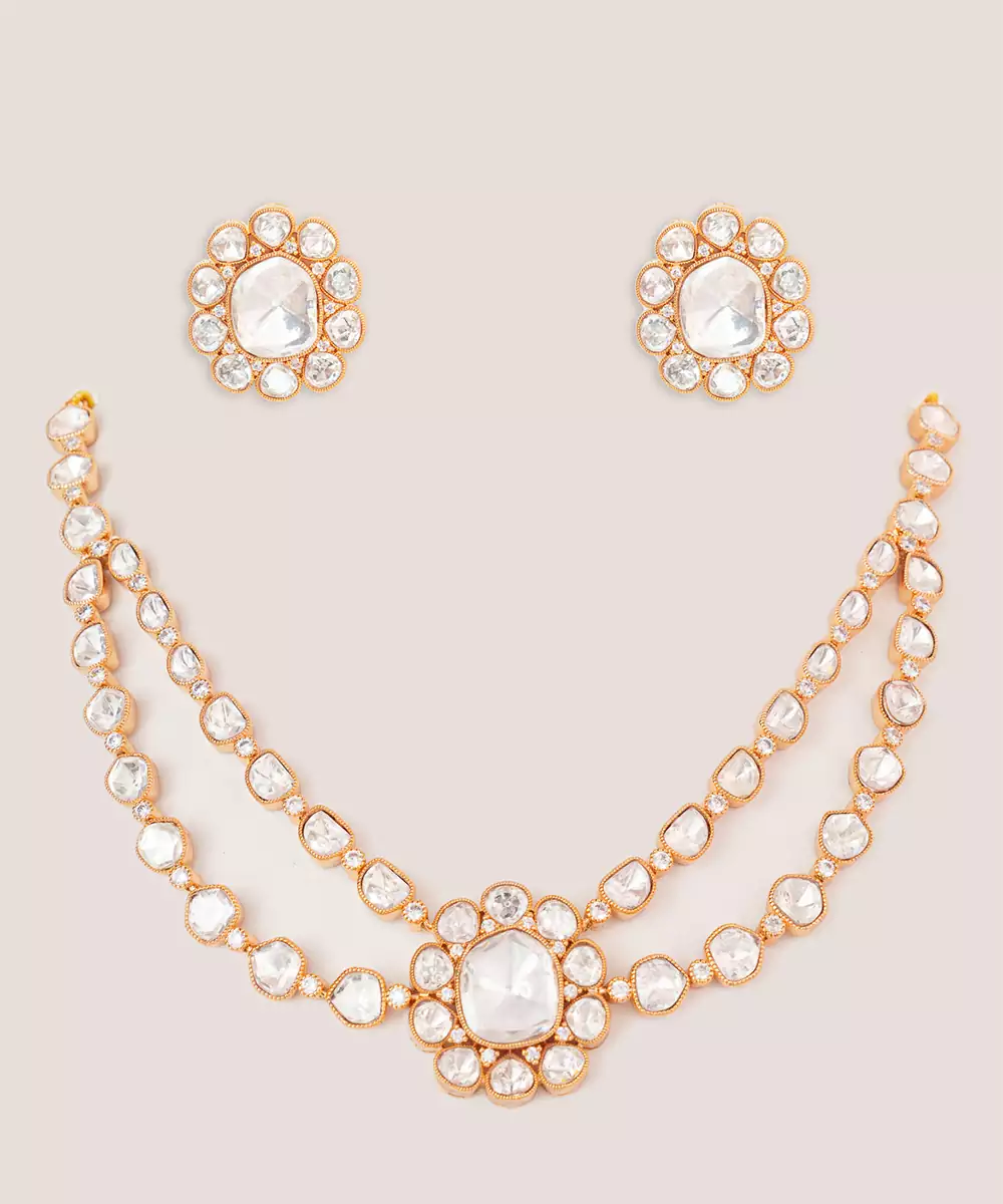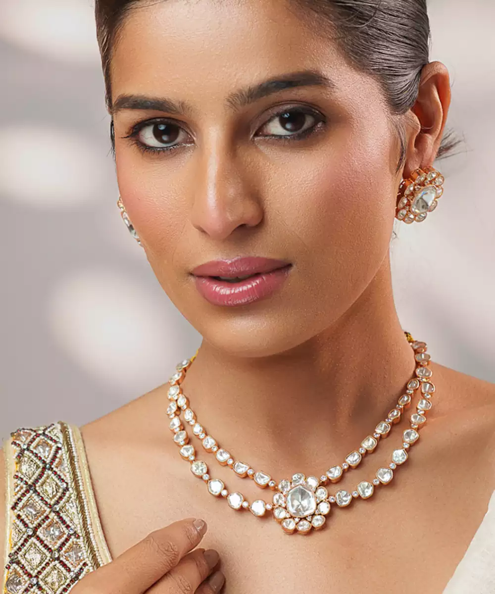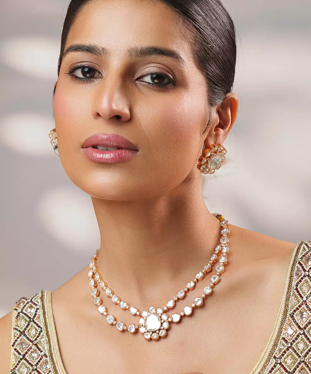 This Gold Plated Kundan Layered Necklace Set Exudes Regal Elegance And Timeless Sophistication. Featuring Multiple Intricately Crafted Layers Adorned With Classic Kundan Stones, It Offers A Luxurious, Statement Appeal. Perfect For Weddings, Festive Occasions, Or Special Celebrations, It Enhances Traditional Ensembles With Grandeur, Refined Craftsmanship, And Enduring Charm.