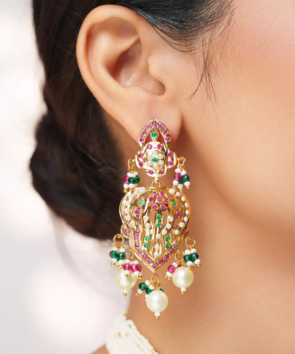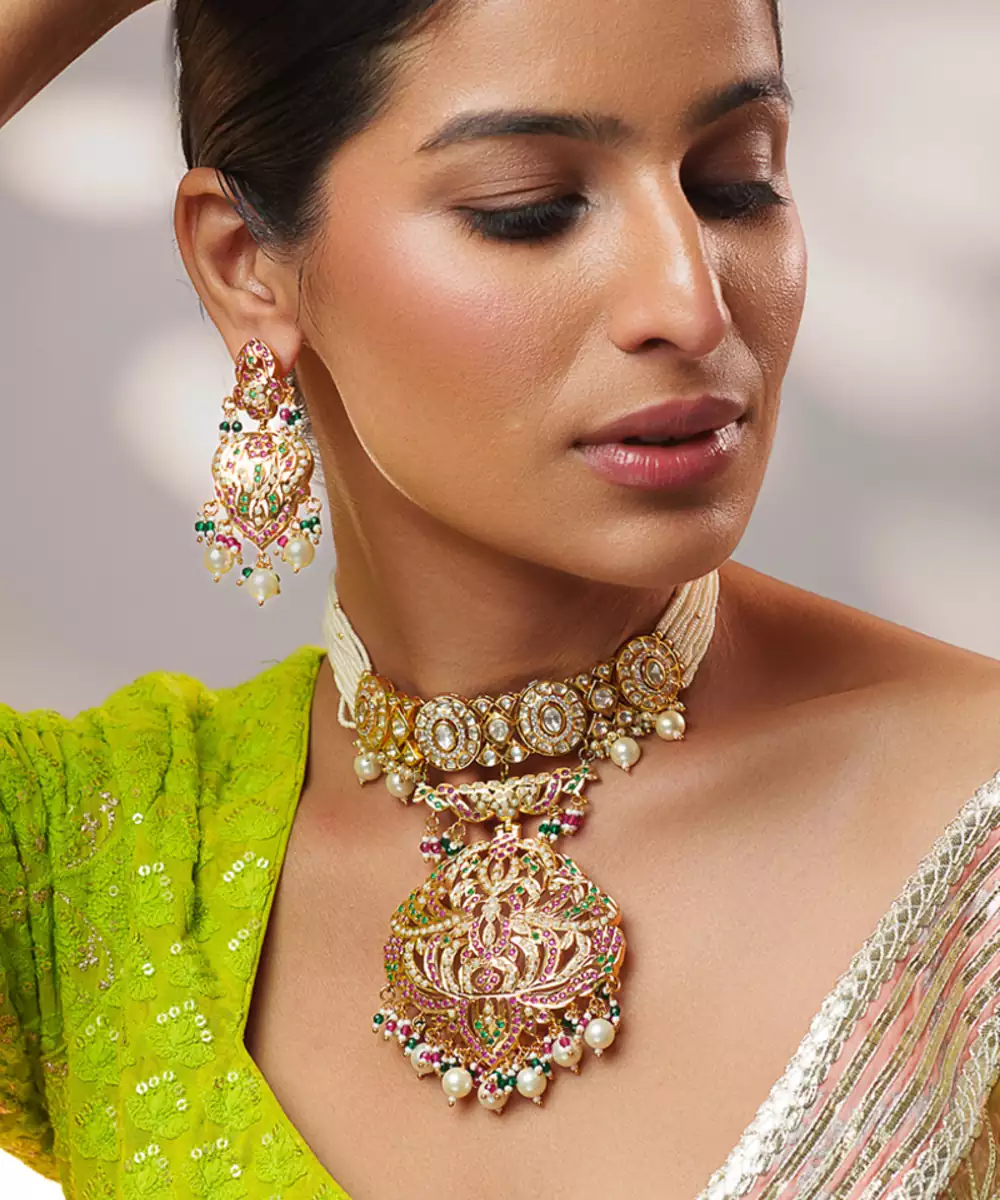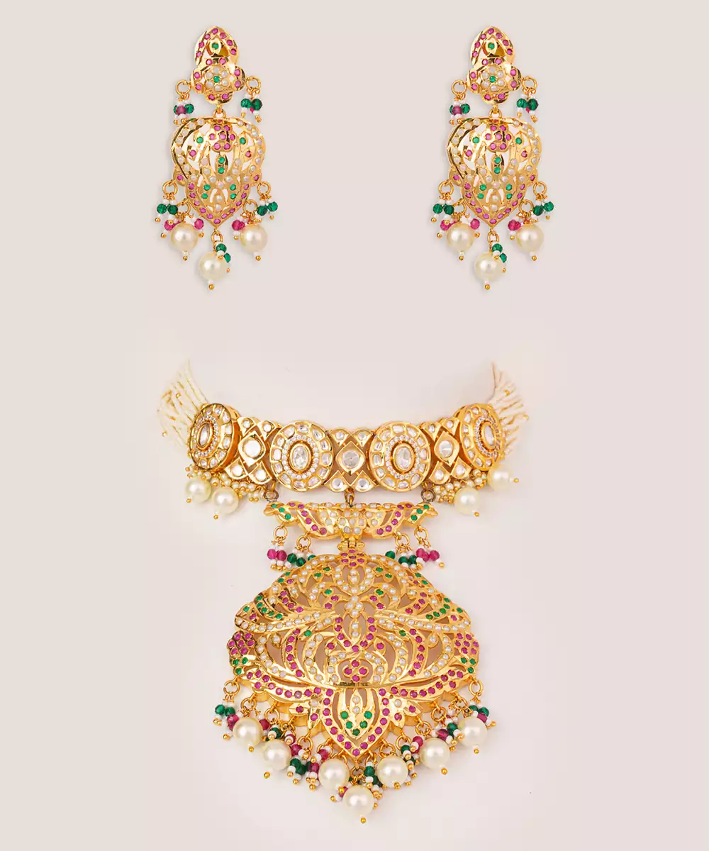 This Gold Plated Kundan Multicolor Stone Choker Necklace Set Exudes Vibrant Elegance And Regal Charm. Adorned With Intricately Set Multicolor Stones, It Showcases Exquisite Craftsmanship And A Radiant Finish. Perfect For Weddings, Festive Occasions, Or Special Celebrations, It Adds A Luxurious, Eye Catching Touch To Any Traditional Ensemble.