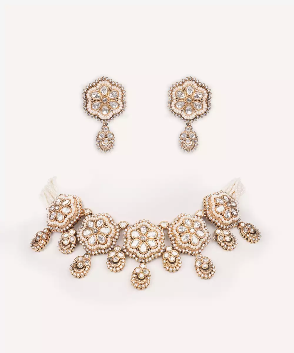 Featuring A Two Tone Finish Studded Kundan Choker Necklace. It Comes With A Pair Of Earrings. Perfect For The Weddings And Festive Season.