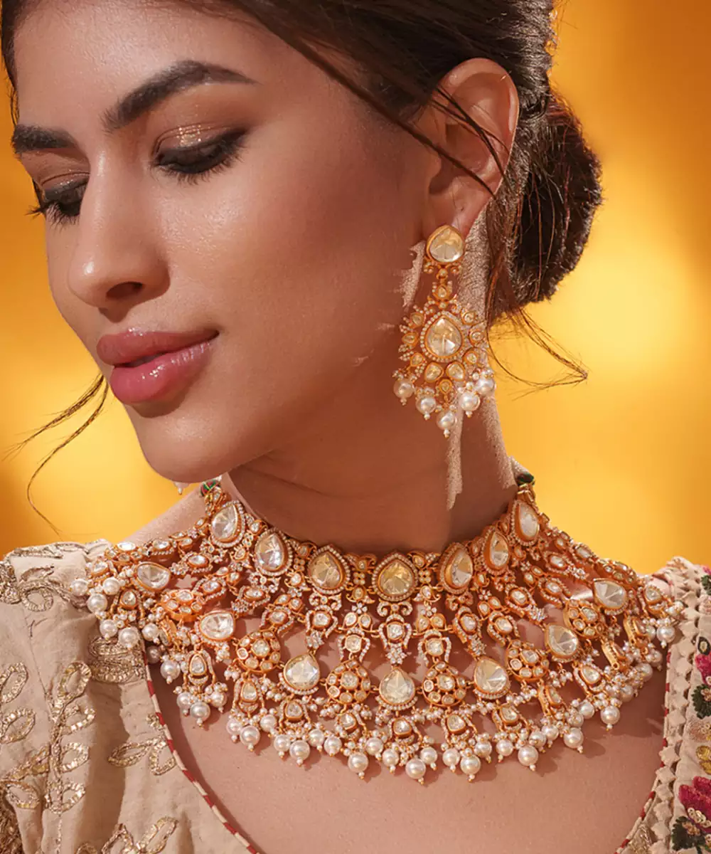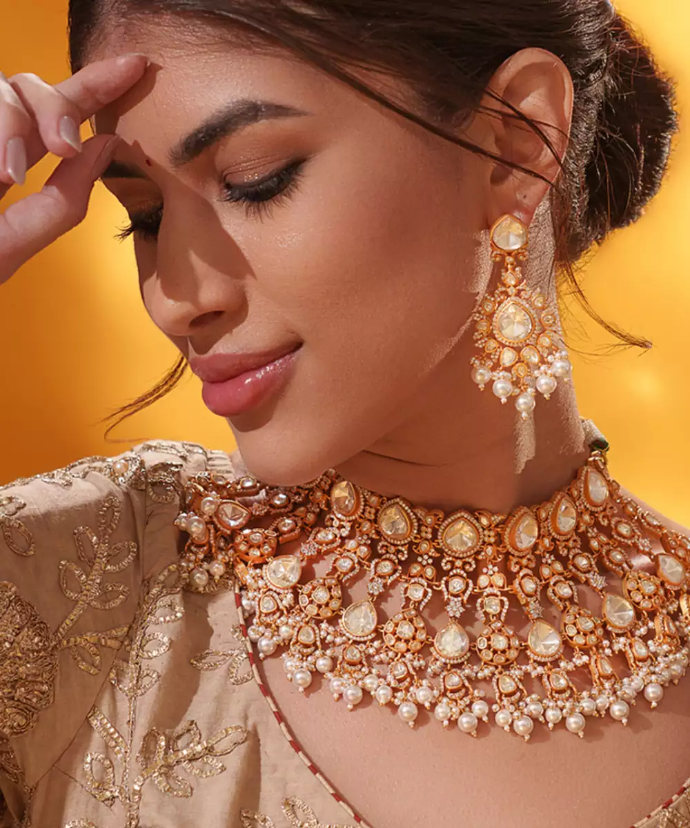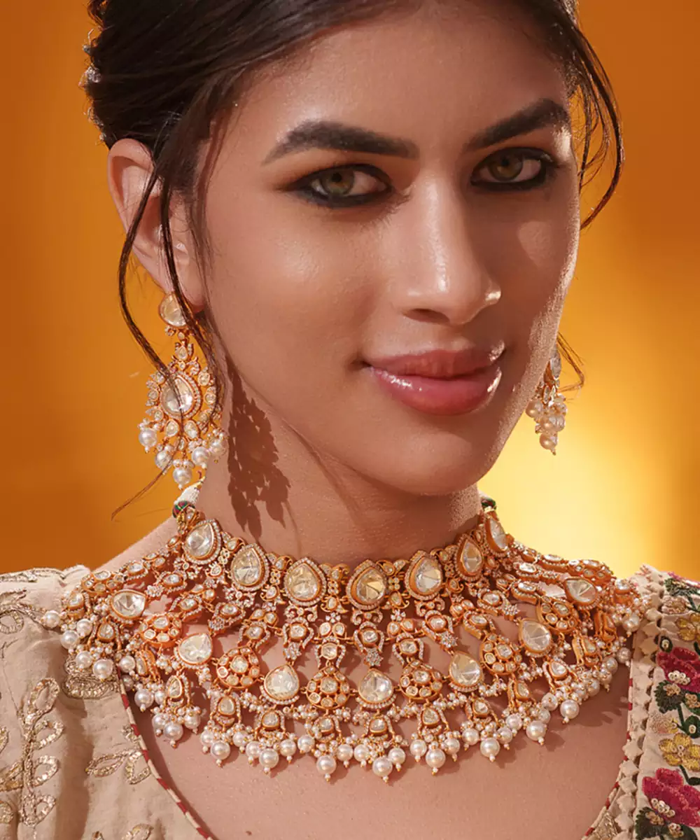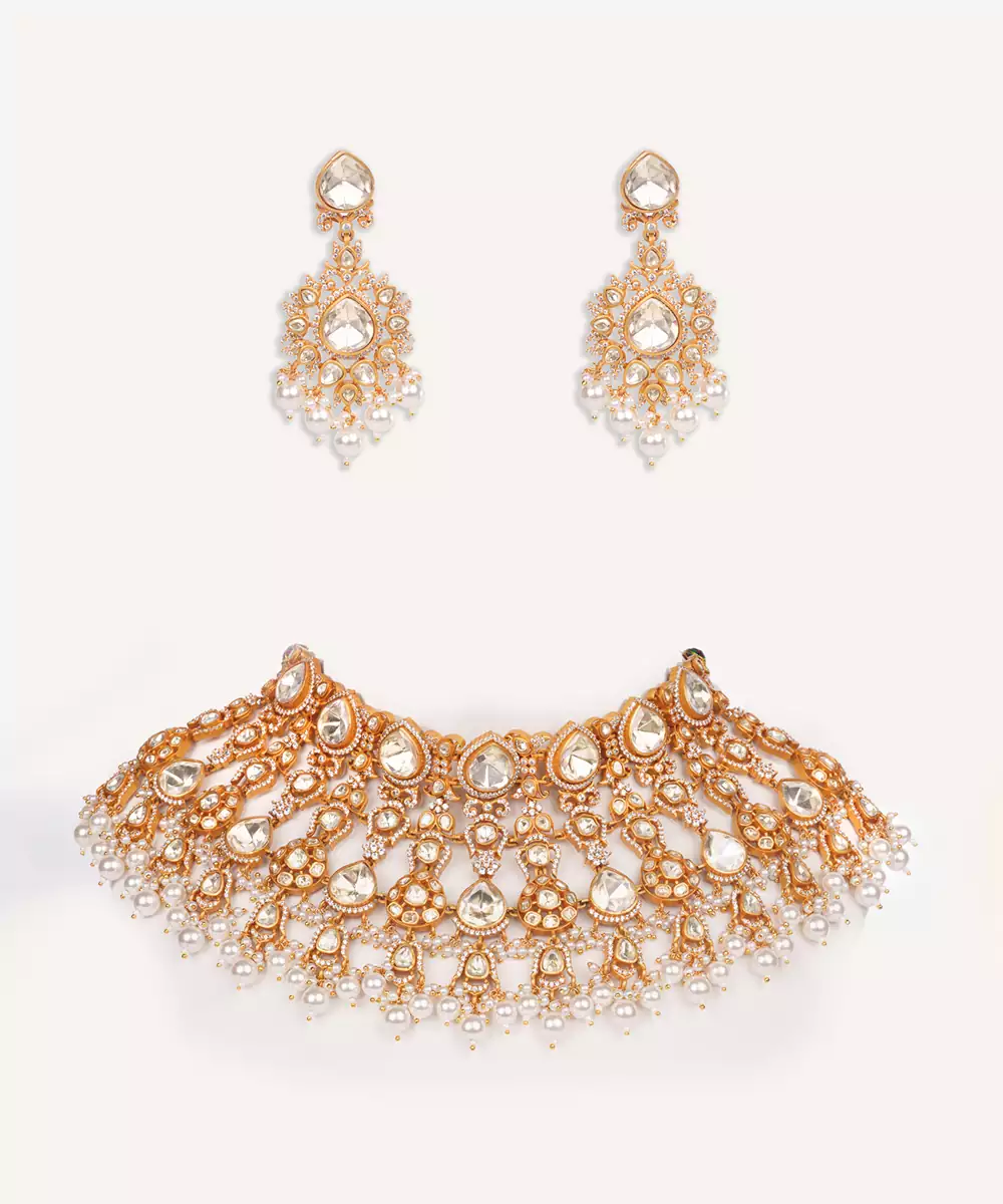 A Masterpiece Of Refined Elegance, Featuring Brilliant Moissanite Stones And Pearl Drops Set In An Intricate, Regal Design. It Comes With A Pair Of Matching Earrings. Perfect For Grand Occasions, It Adds A Touch Of Timeless Sophistication To Any Ensemble.