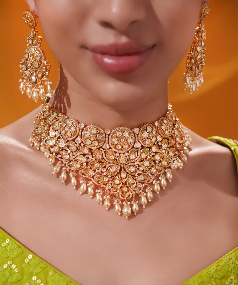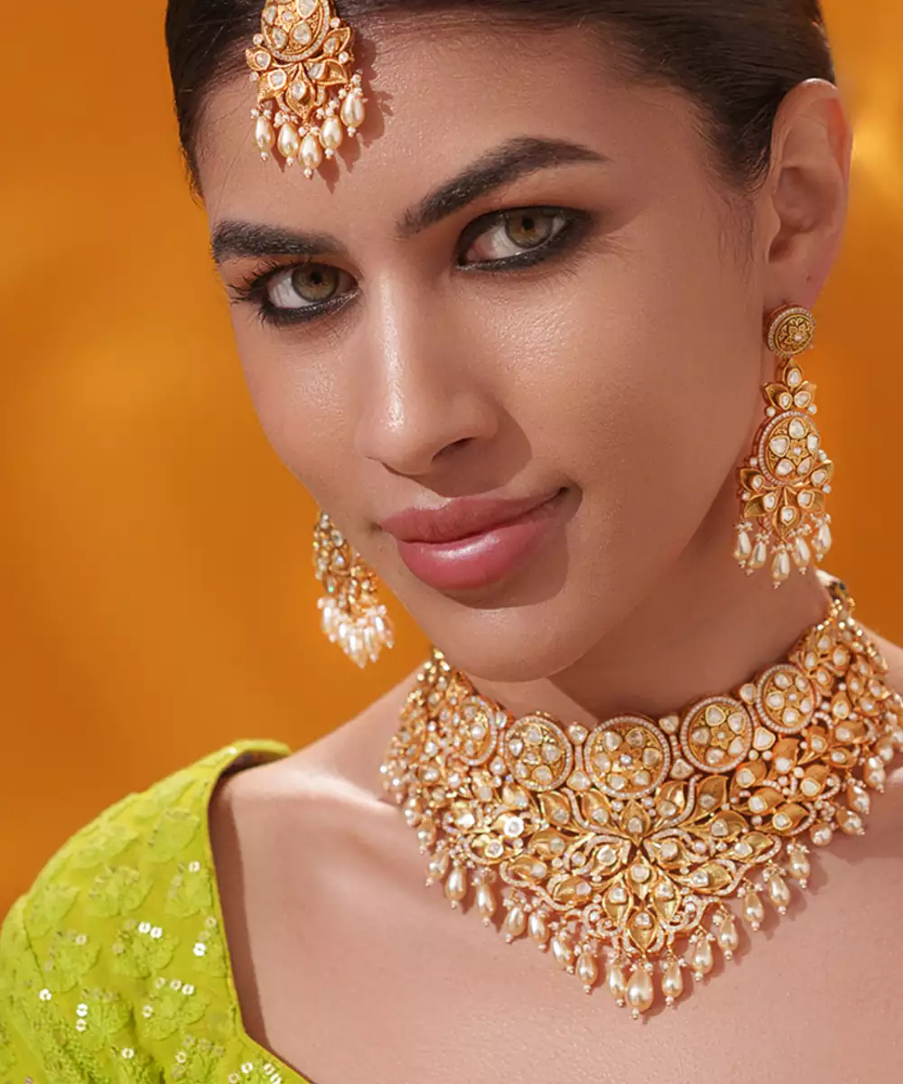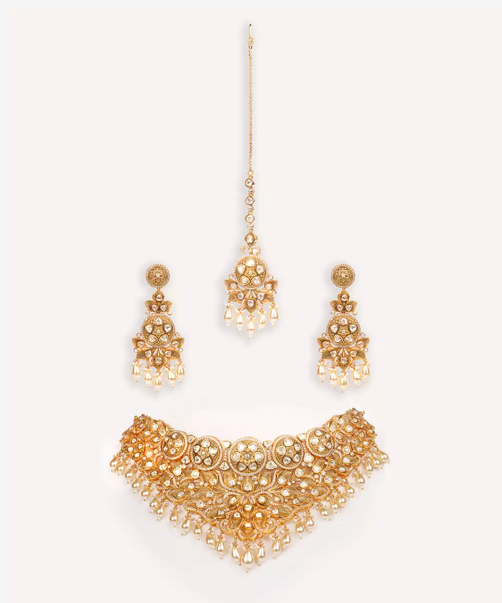 A Regal Masterpiece, This Heavily Embellished Bridal Set Features Intricate Kundan Craftsmanship In A Luxurious Lattice Pattern, Adorned With Radiant Stones And Delicate Pearl Drops. The Grand Design Is Paired With Matching Earrings And A Maangtika, Making It A Show Stopping Ensemble For Bridal Or Festive Occasions. With Its Opulent Finish And Timeless Appeal, This Set Captures The Essence Of Traditional Elegance And Royal Charm.