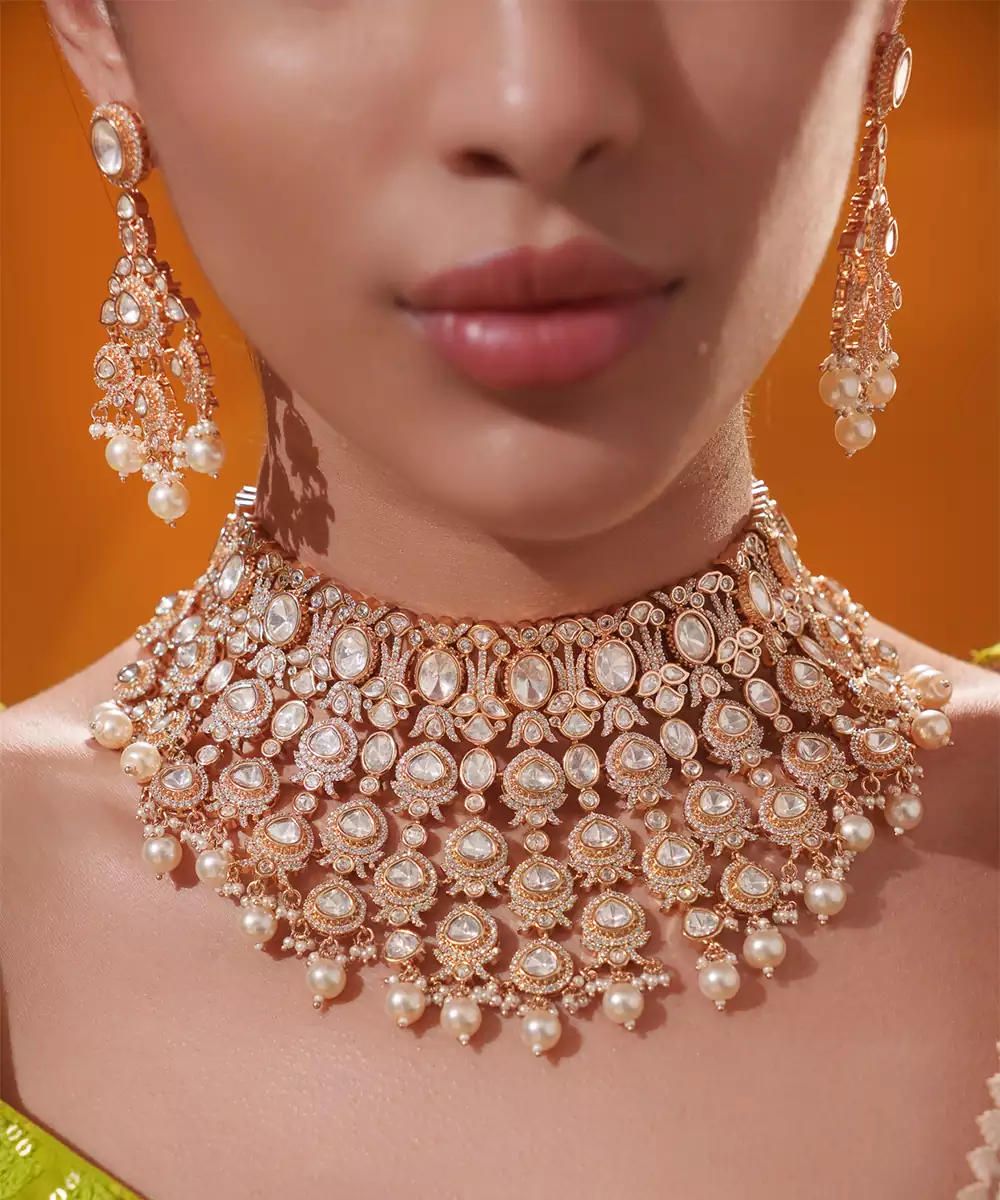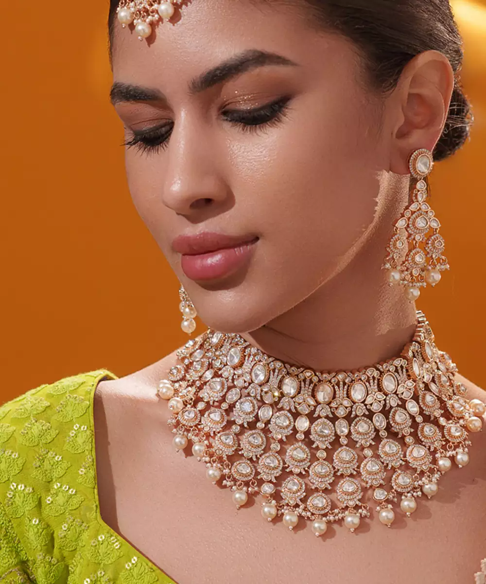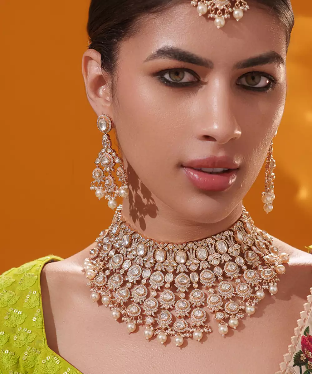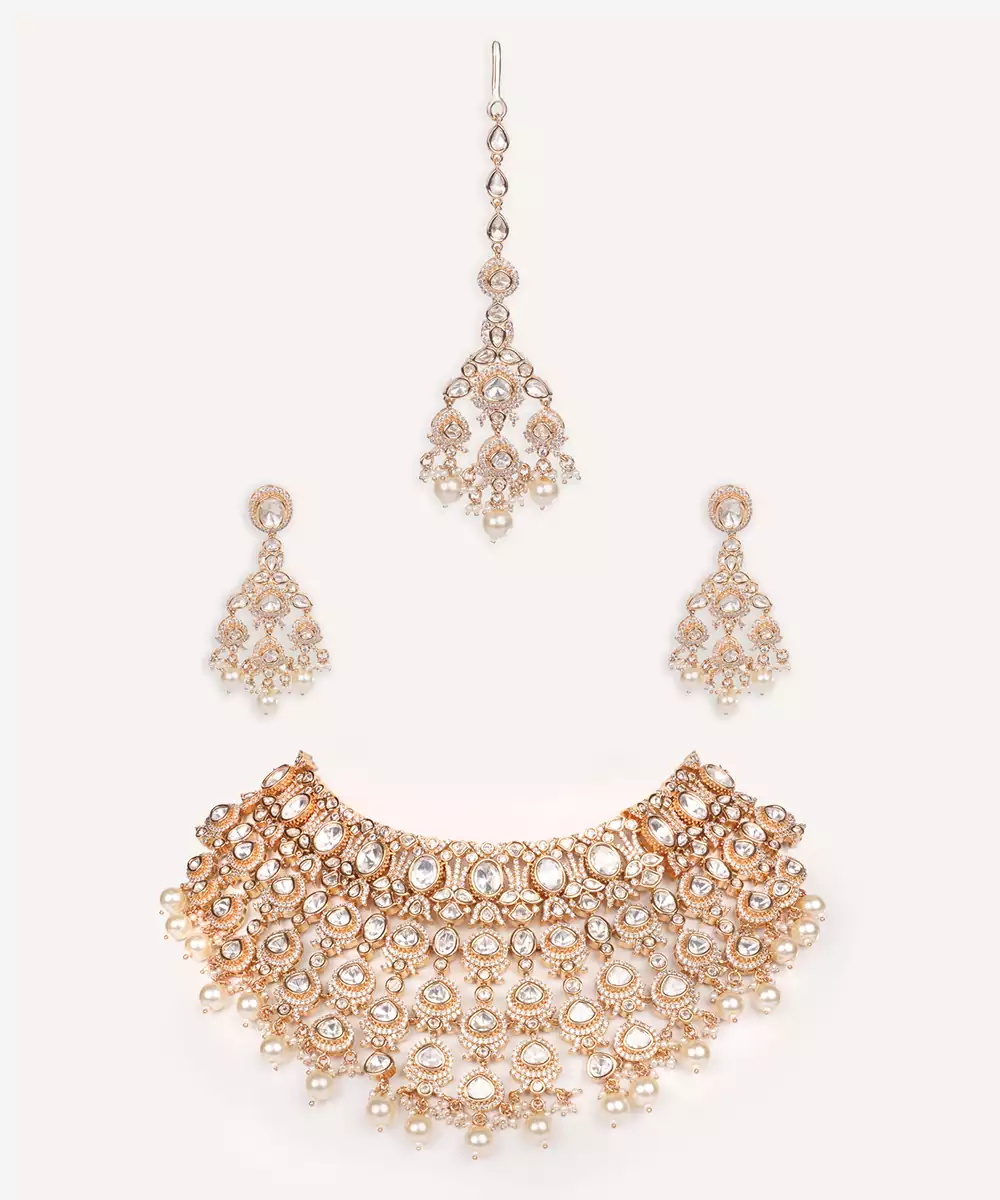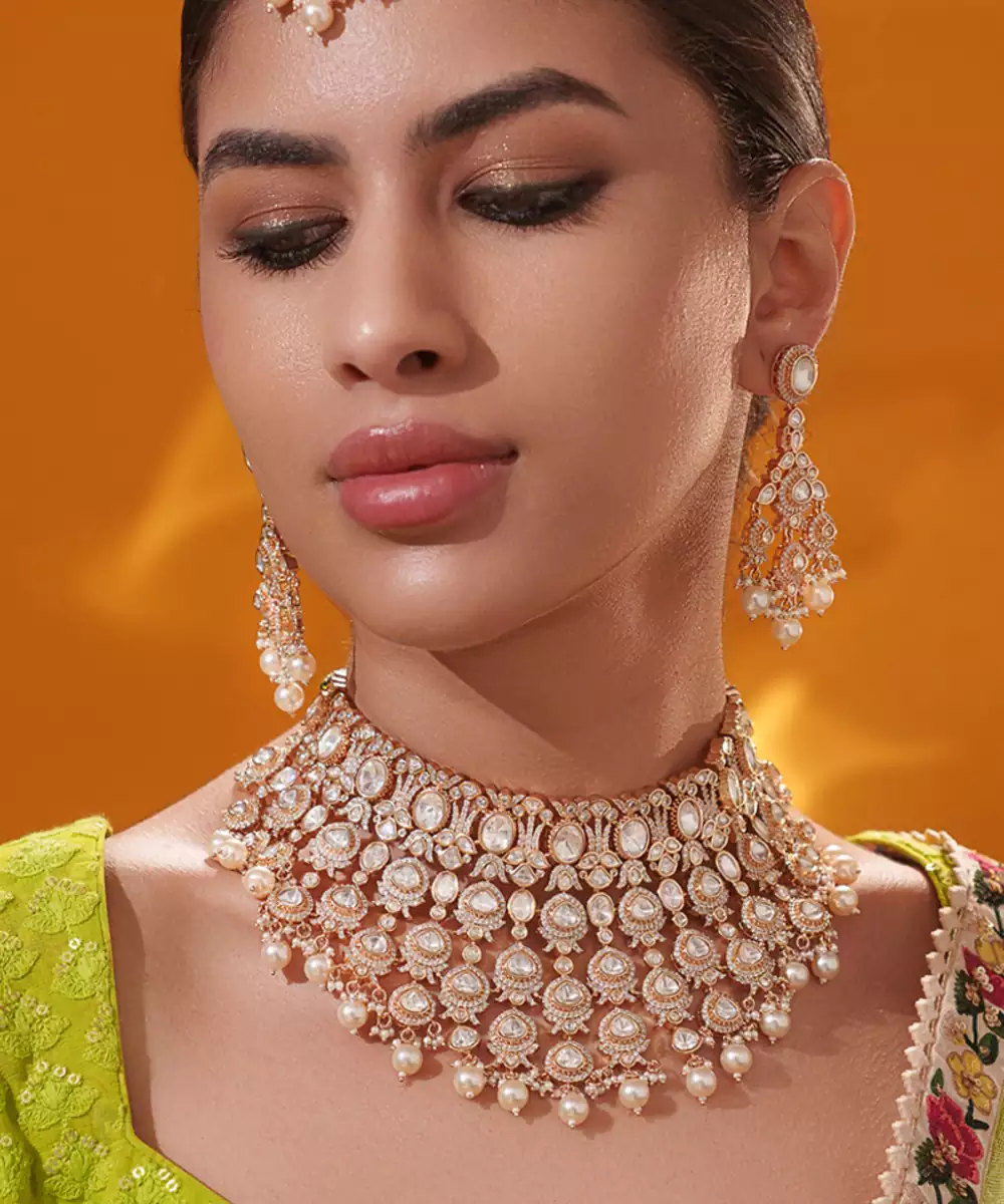 A Regal Masterpiece, This Heavily Embellished Bridal Set Features Intricate Kundan Craftsmanship In A Luxurious Lattice Pattern, Adorned With Radiant Stones And Delicate Pearl Drops. The Grand Design Is Paired With Matching Earrings And A Maangtika, Making It A Show Stopping Ensemble For Bridal Or Festive Occasions. With Its Opulent Finish And Timeless Appeal, This Set Captures The Essence Of Traditional Elegance And Royal Charm.