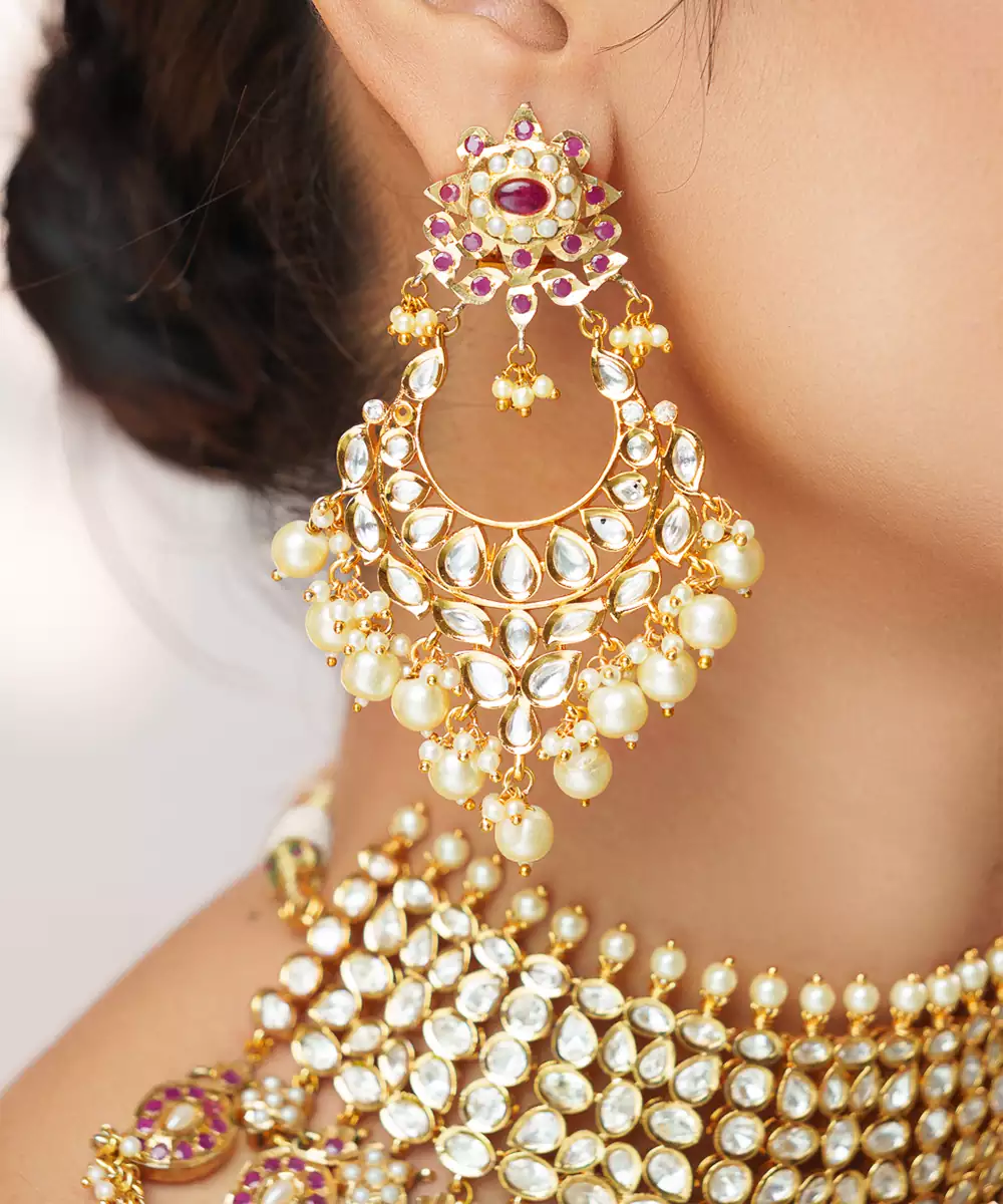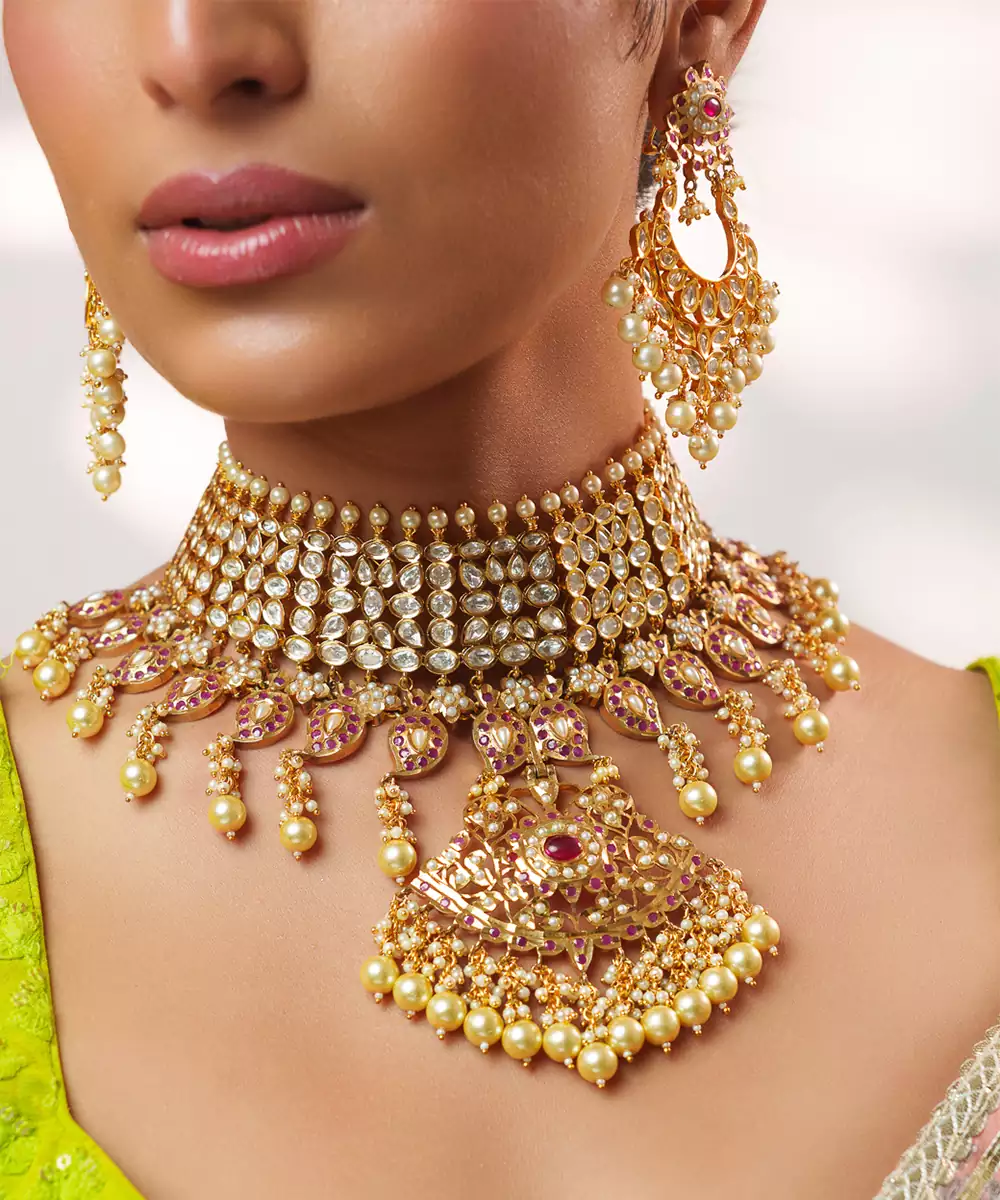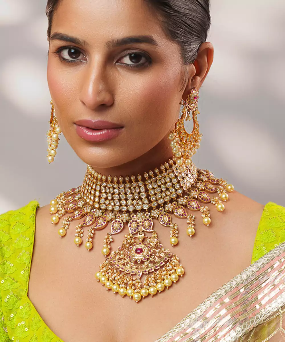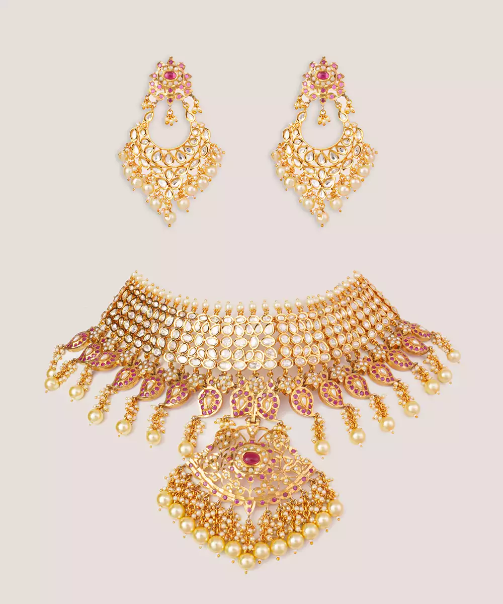 This Gold Plated Kundan Necklace Set Embodies Timeless Elegance And Regal Craftsmanship. Intricately Designed With Classic Kundan Detailing And A Radiant Gold Finish, It Offers A Luxurious Statement Appeal. Perfect For Weddings, Festive Occasions, Or Celebrations, It Beautifully Enhances Traditional Ensembles With Sophistication, Grace, And Enduring Charm.