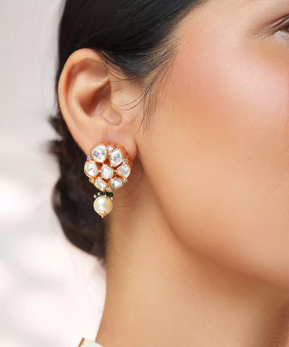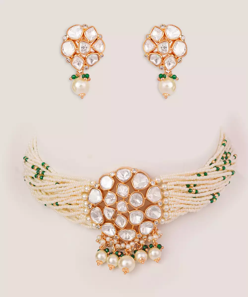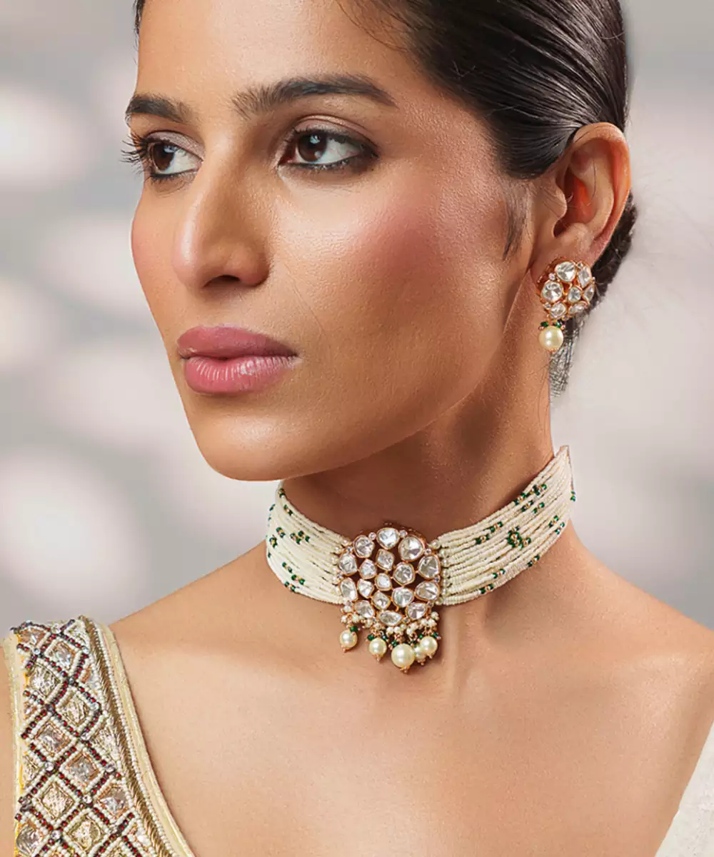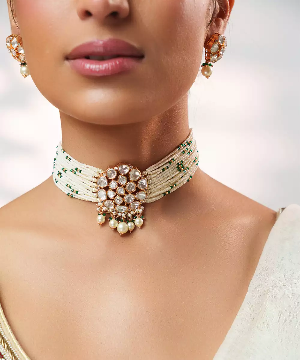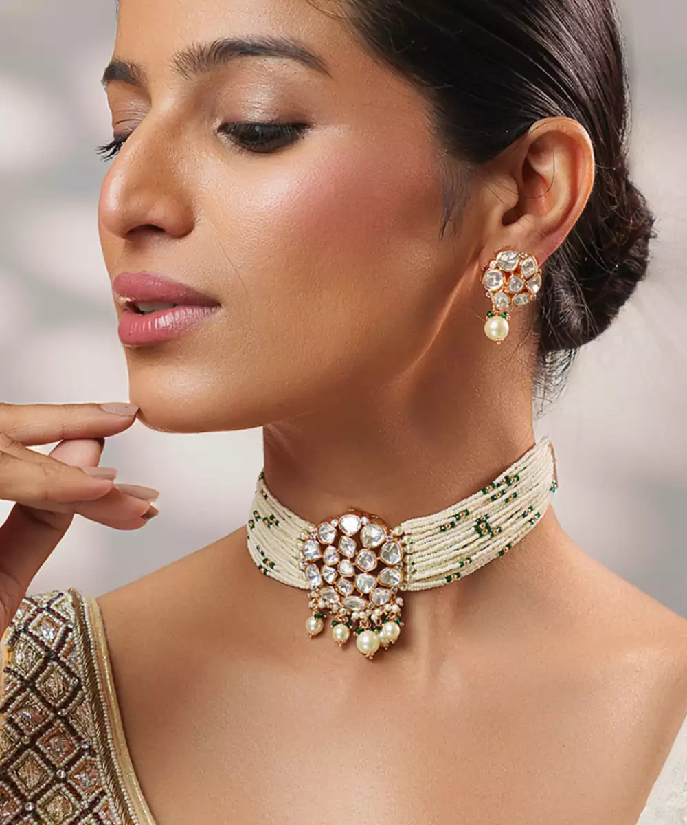 This Gold Plated Kundan Pearl Choker Necklace Set Exudes Timeless Elegance And Refined Sophistication. Adorned With Lustrous Pearls And Intricately Set Kundan Stones, It Showcases Exquisite Craftsmanship And A Radiant Finish. Perfect For Weddings, Festive Occasions, Or Special Celebrations, It Adds A Luxurious, Graceful Touch To Any Traditional Ensemble.