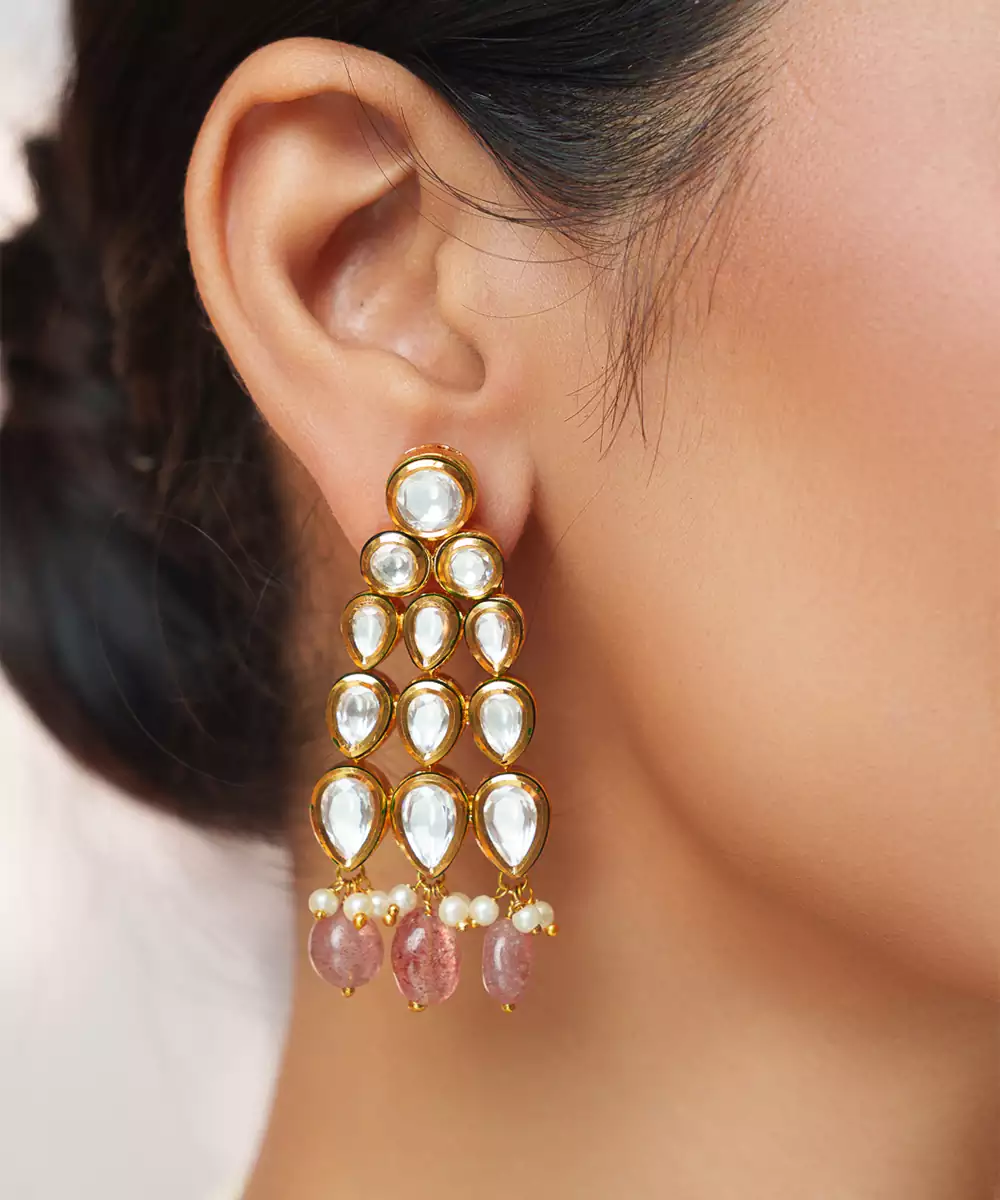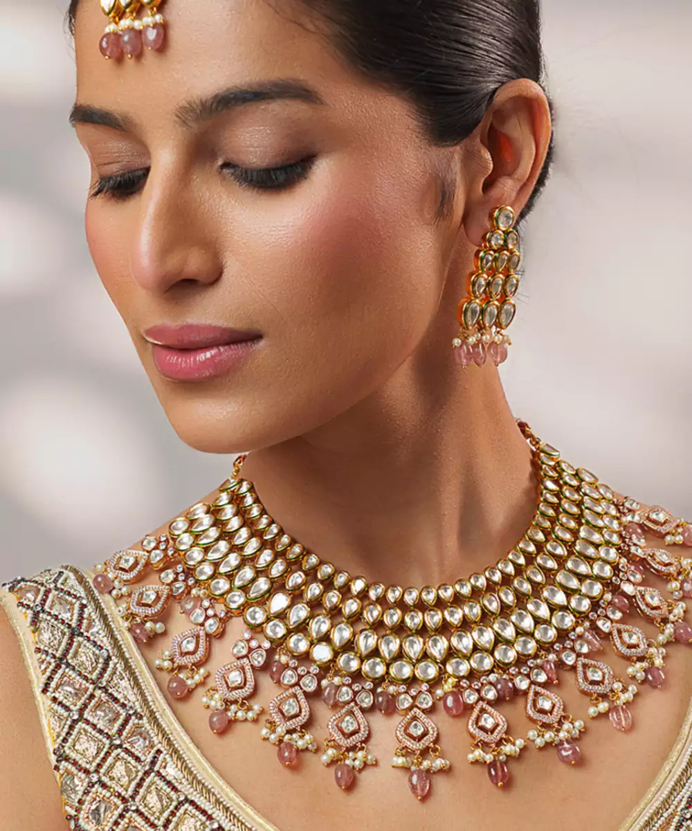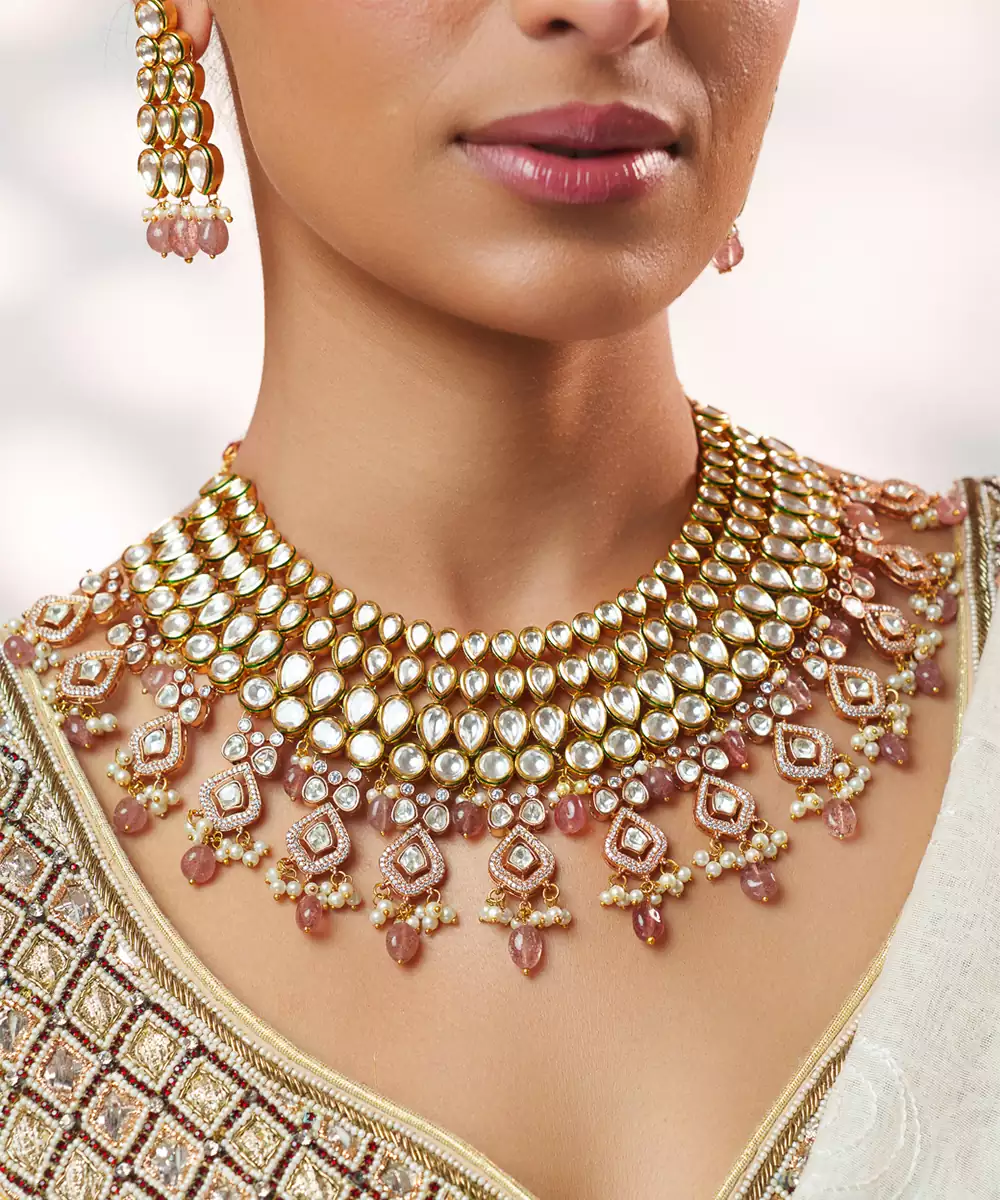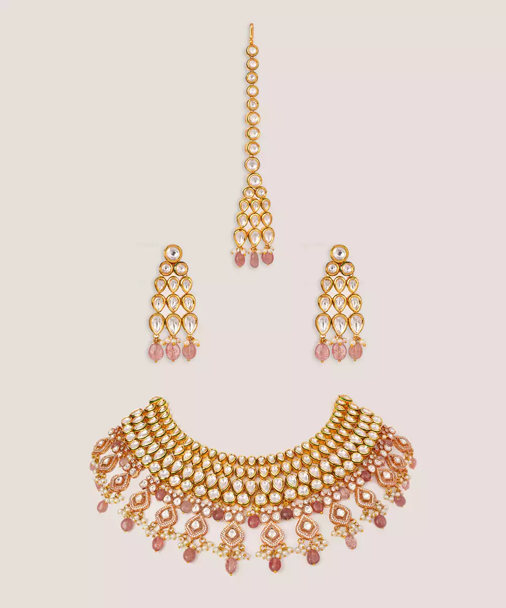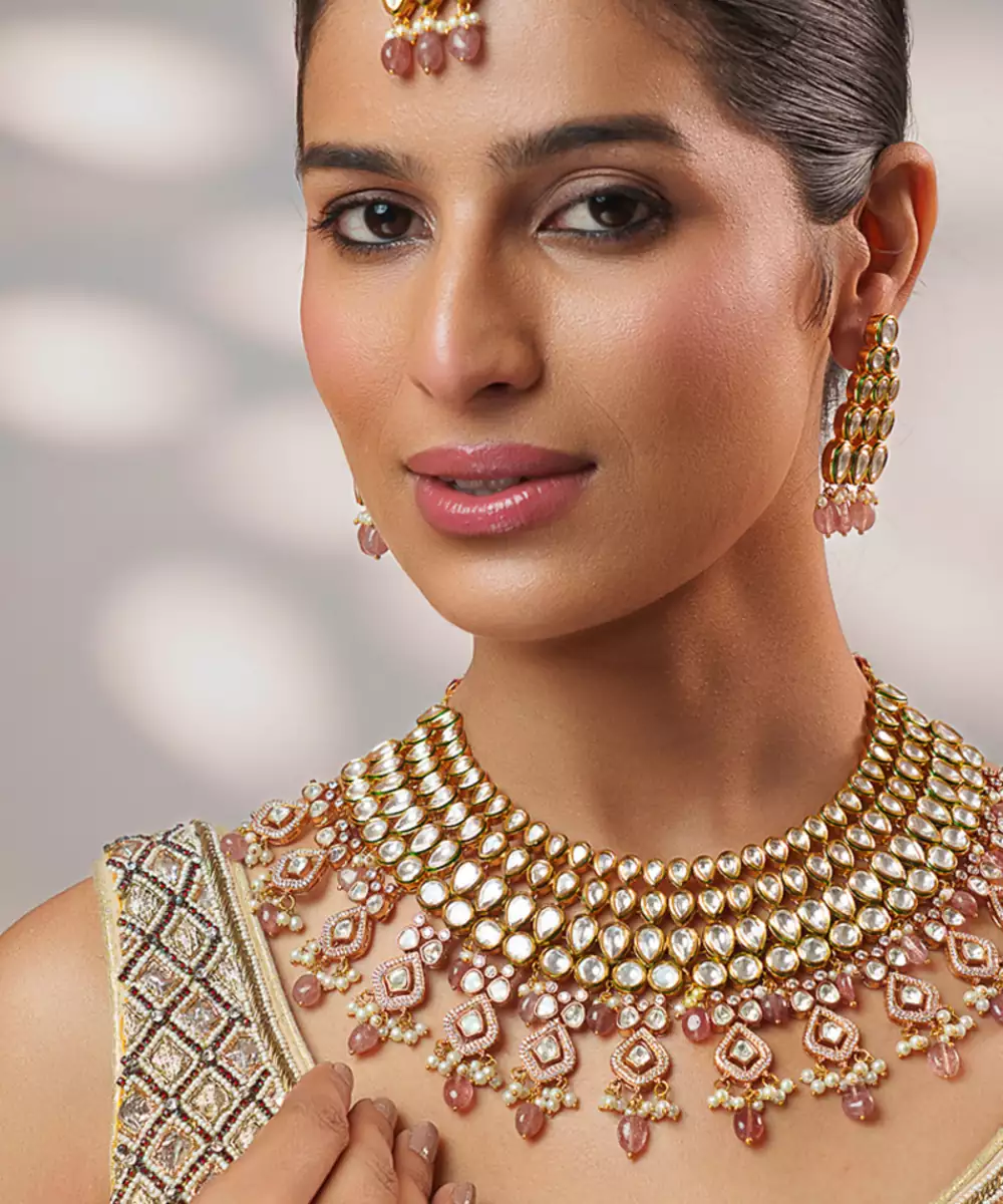 This Gold Plated Kundan Pink Stone Necklace Set Radiates Feminine Elegance And Timeless Charm. Adorned With Delicately Set Pink Stones, It Features Intricate Craftsmanship And A Luminous Finish. Perfect For Weddings, Festive Occasions, Or Special Celebrations, It Adds A Soft Pop Of Color And Luxurious Sophistication To Any Traditional Ensemble.