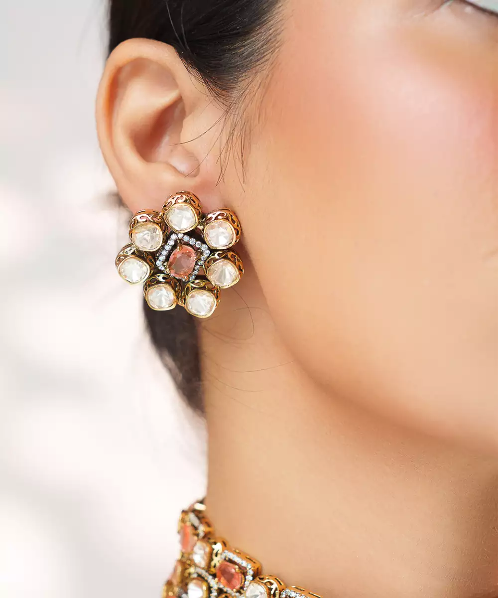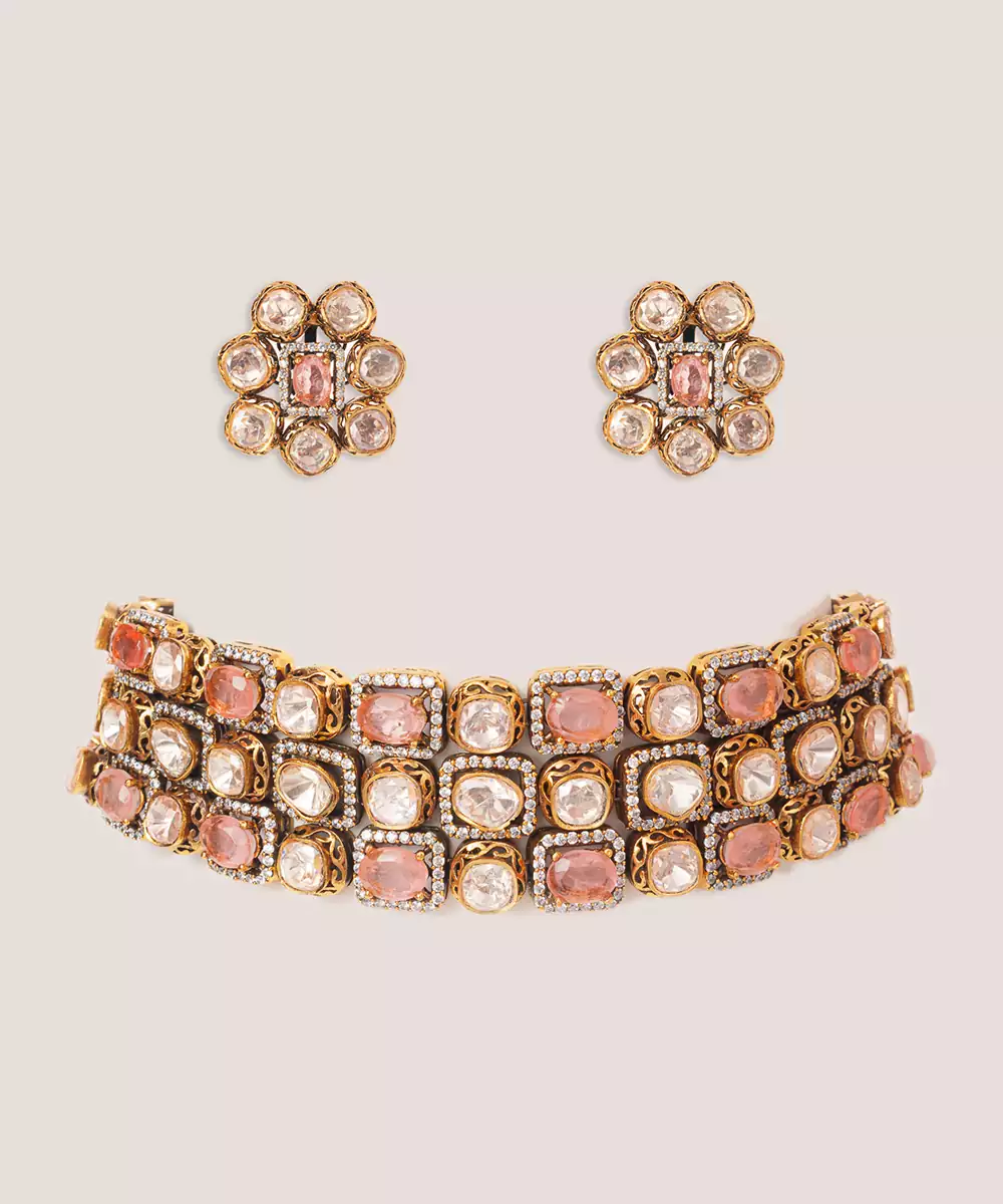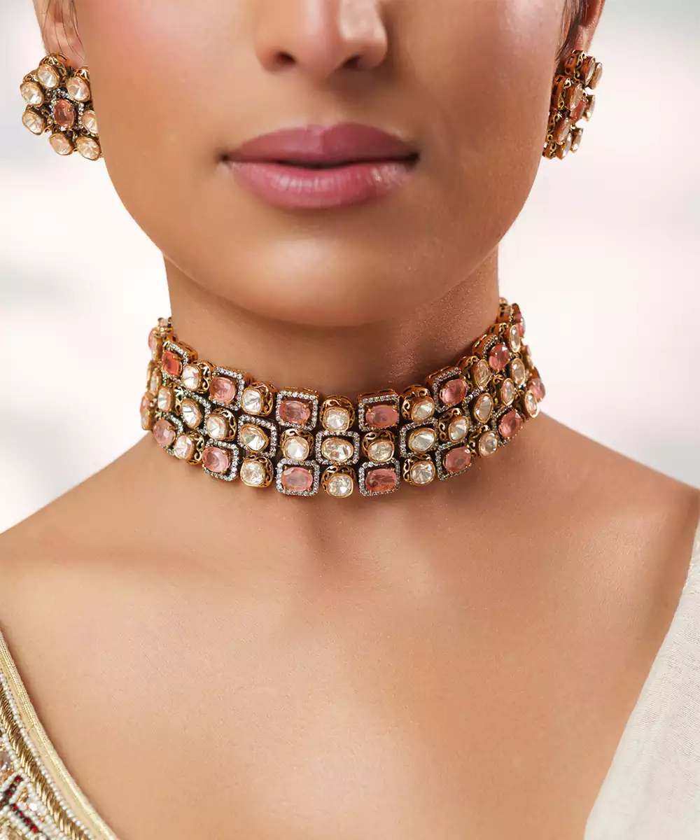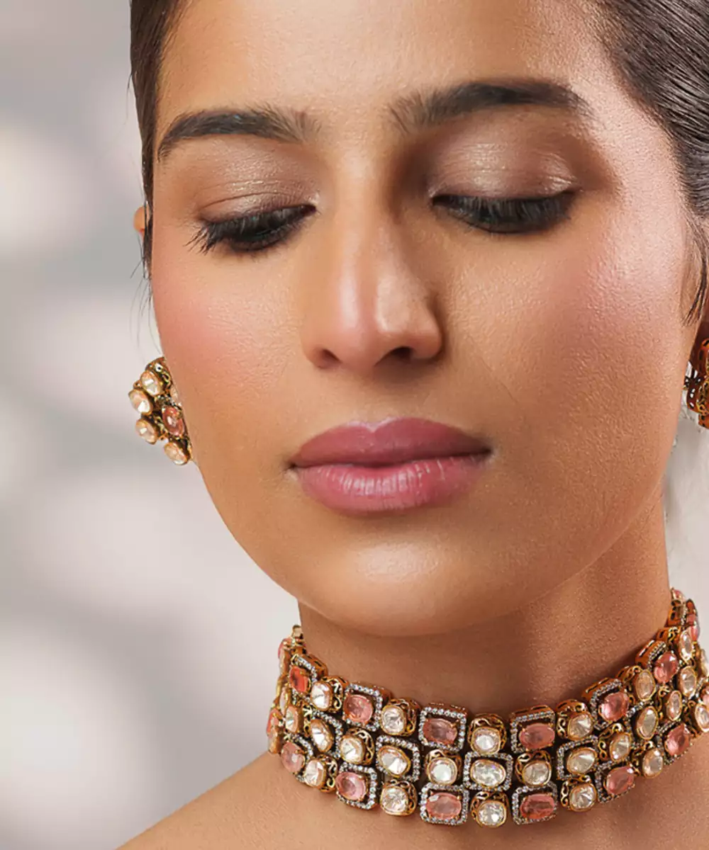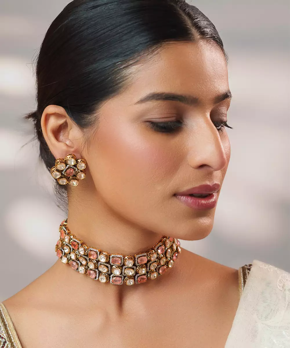 This Gold Plated Kundan Pink Stone Choker Necklace Set Radiates Regal Elegance And Timeless Charm. Adorned With Beautifully Set Green Stones, It Showcases Intricate Craftsmanship And A Luminous Finish. Perfect For Weddings, Festive Celebrations, Or Special Occasions, It Adds A Rich Pop Of Color And Refined Sophistication To Any Traditional Ensemble.