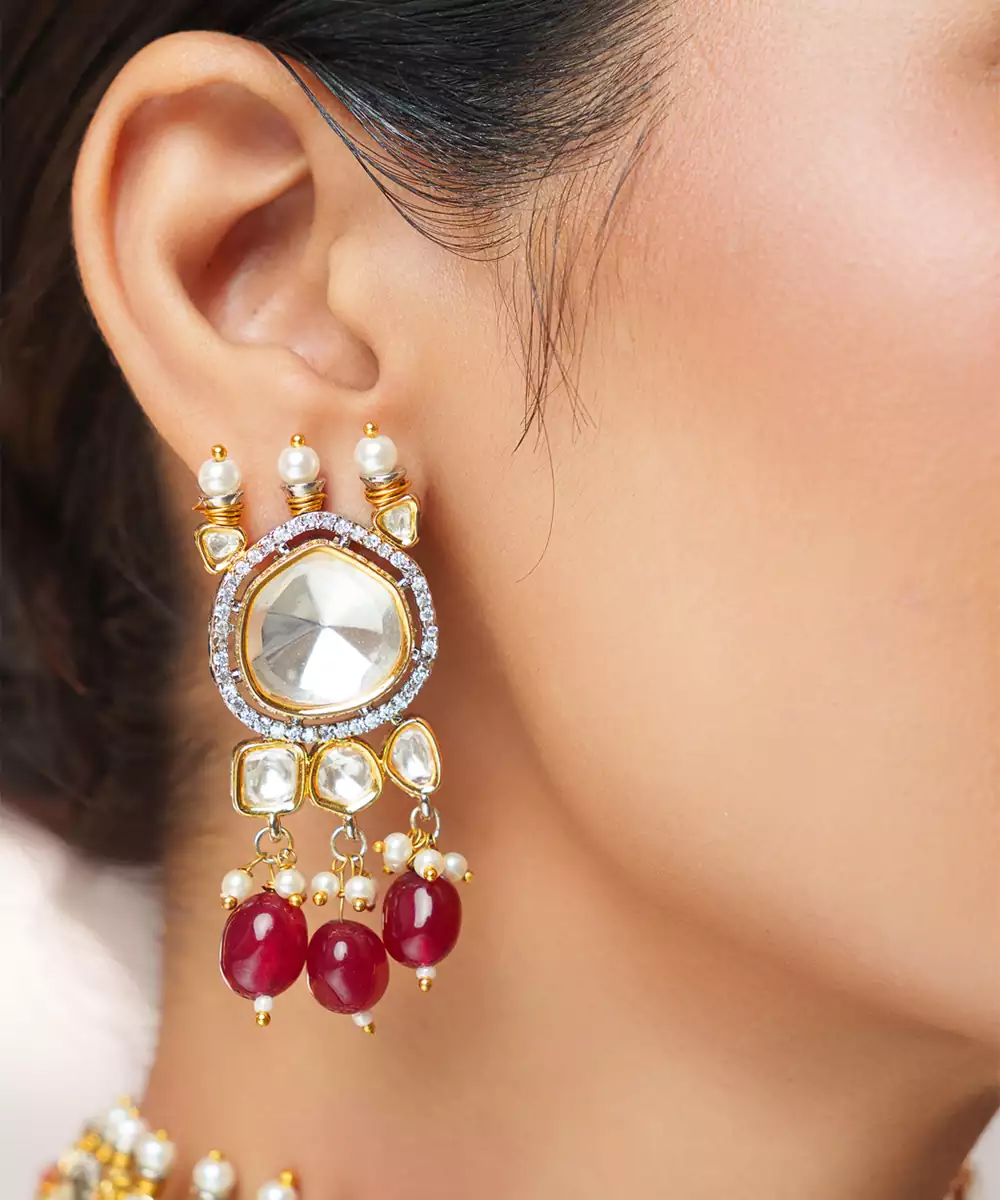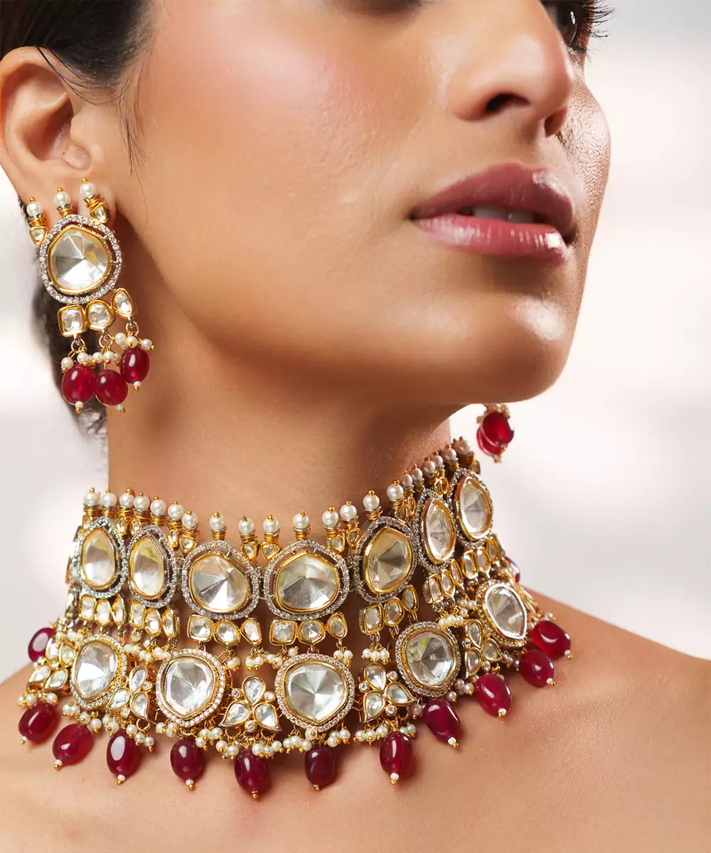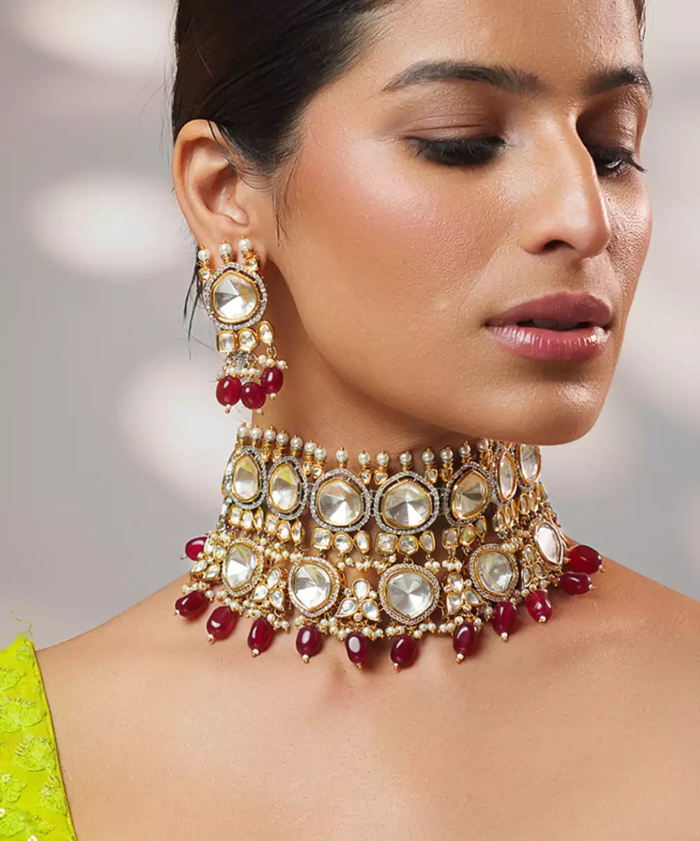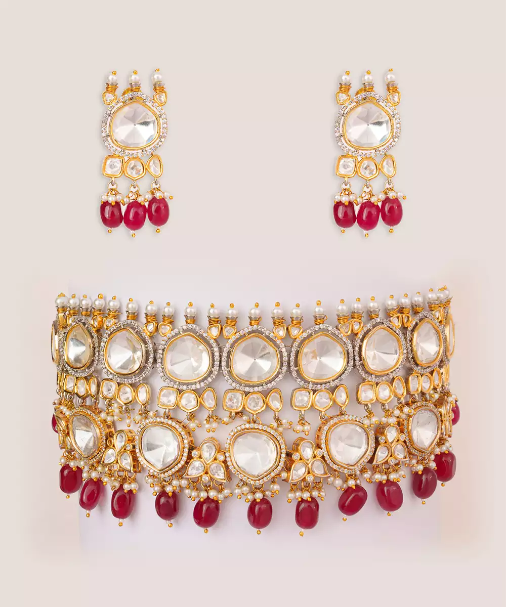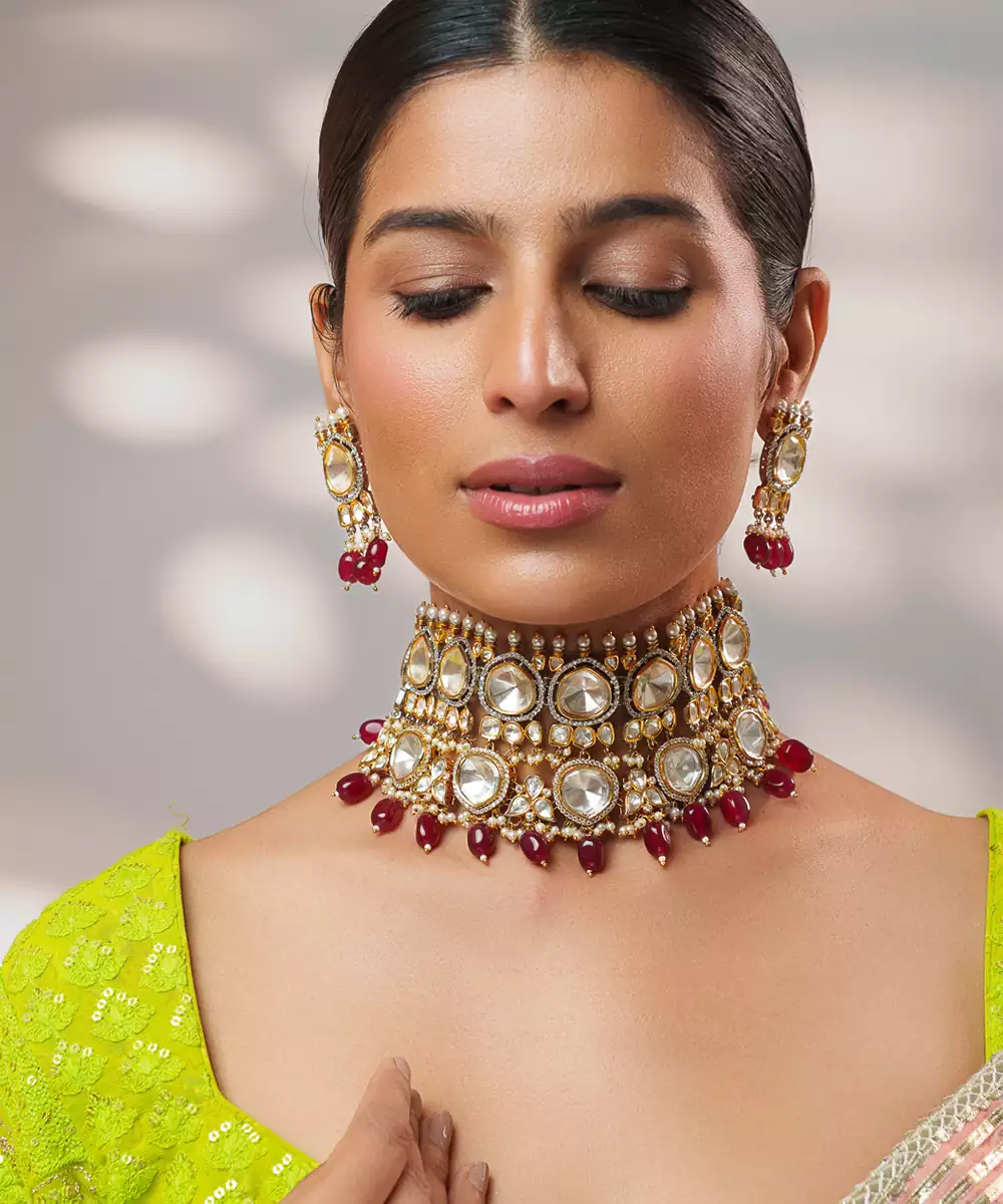 This Gold Plated Kundan Red Stone Choker Necklace Set Radiates Regal Elegance And Timeless Charm. Adorned With Intricately Set Red Stones, It Showcases Exquisite Craftsmanship And A Radiant Finish. Perfect For Weddings, Festive Occasions, Or Special Celebrations, It Adds A Bold, Sophisticated Touch To Any Traditional Ensemble.