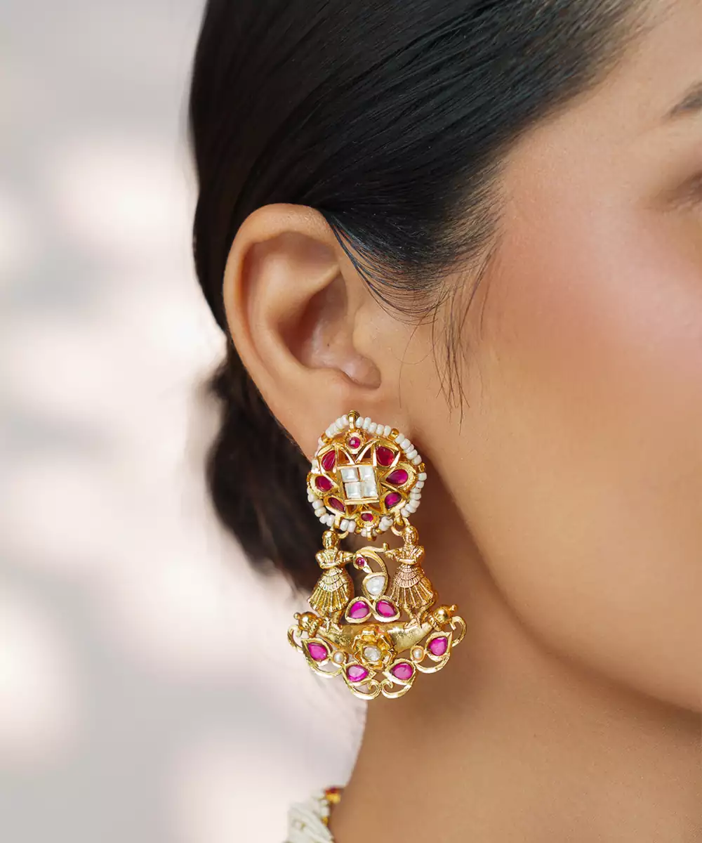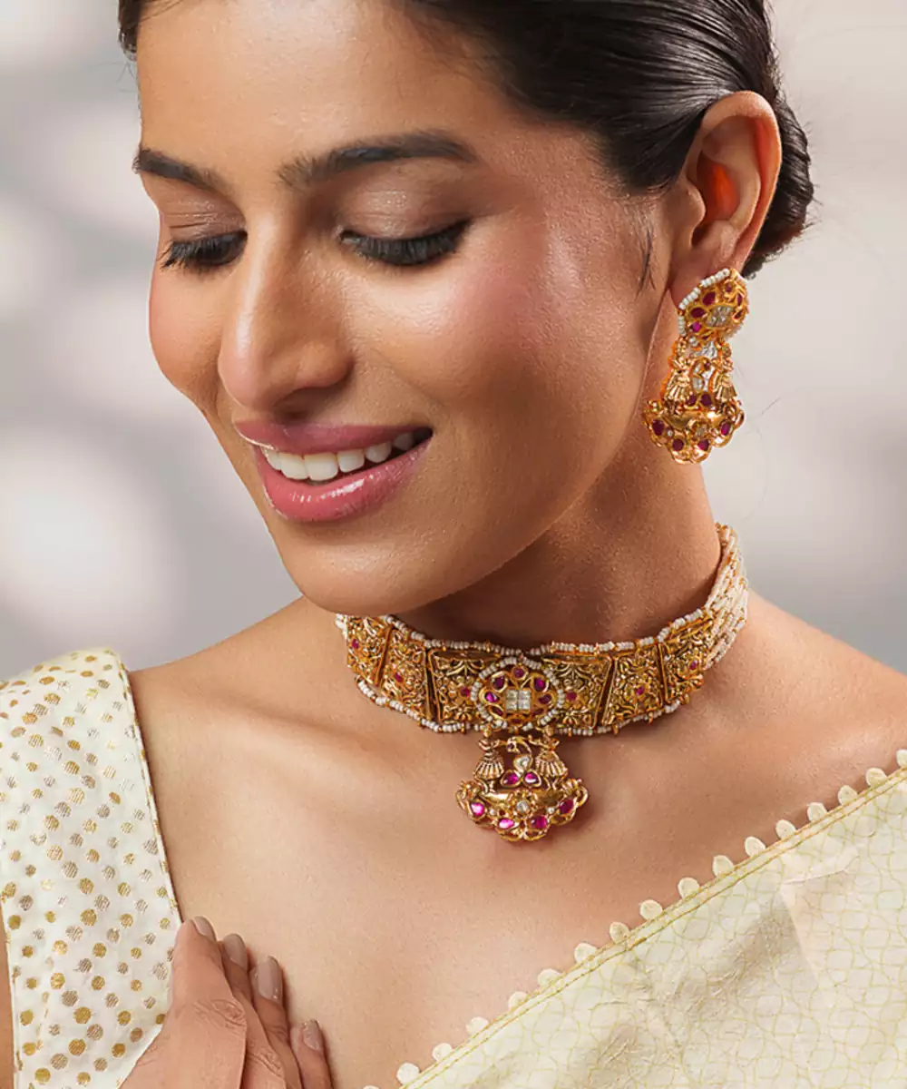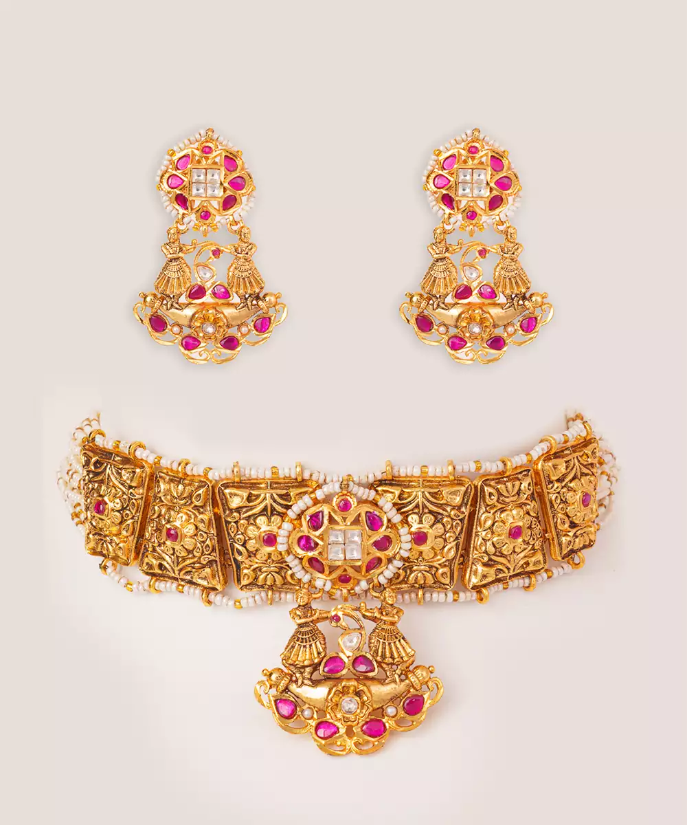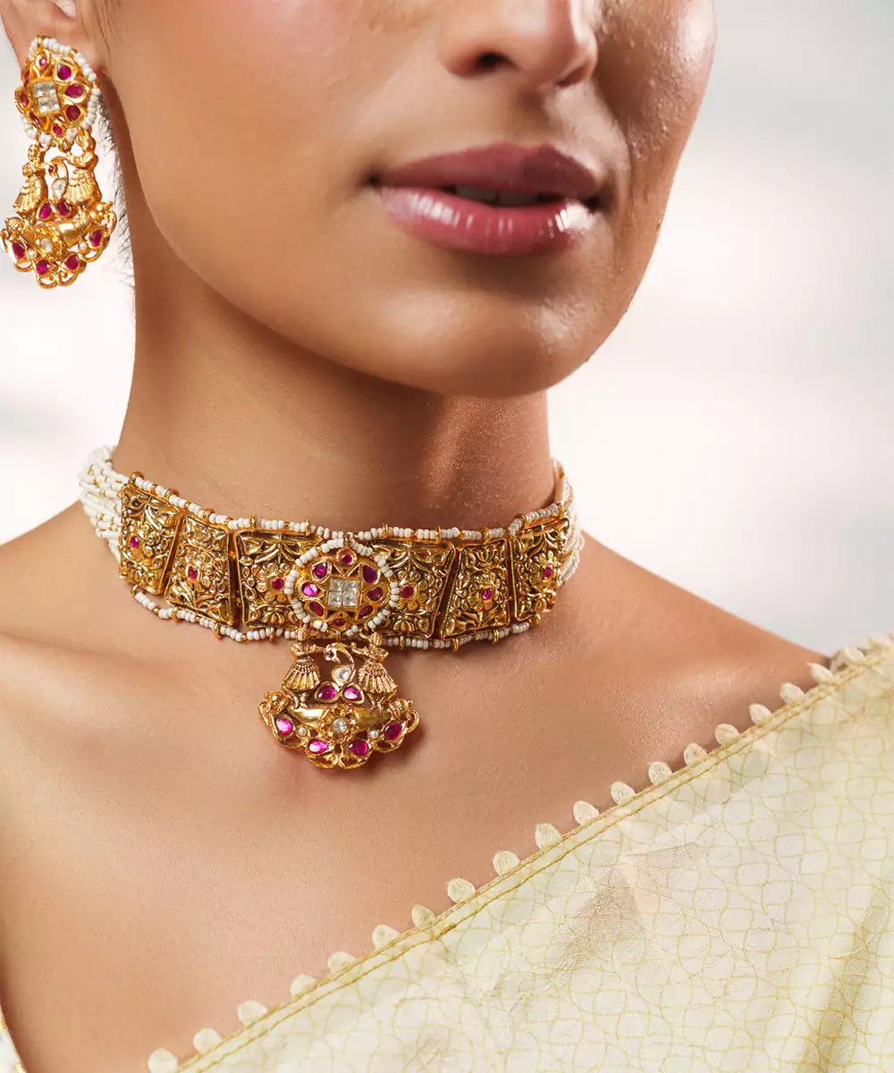This Gold Plated Kundan Pink Stone Choker Necklace Set Radiates Feminine Elegance And Regal Charm. Adorned With Delicately Set Pink Stones, It Features Intricate Craftsmanship And A Radiant Finish. Perfect For Weddings, Festive Occasions, Or Special Celebrations, It Adds A Graceful Pop Of Color And Timeless Sophistication To Any Ensemble.