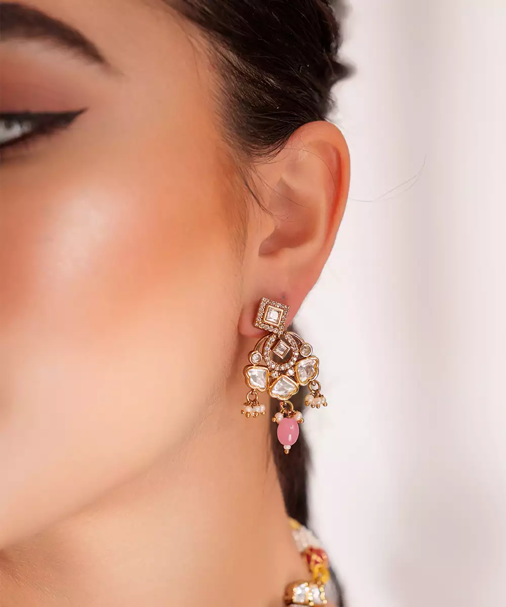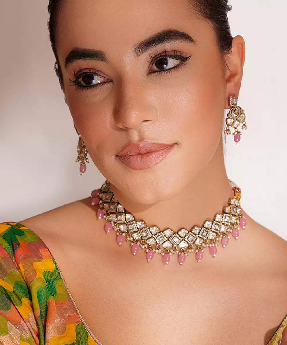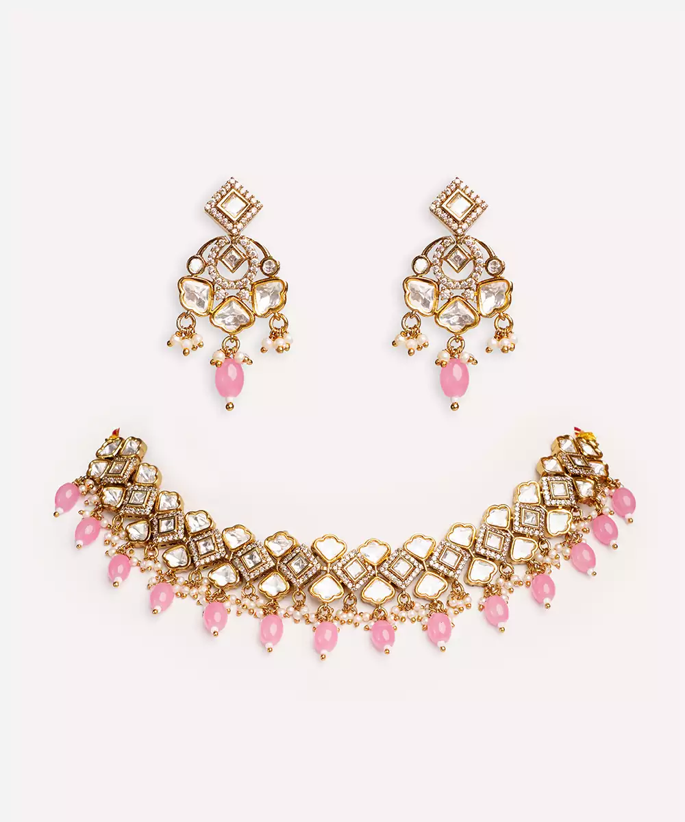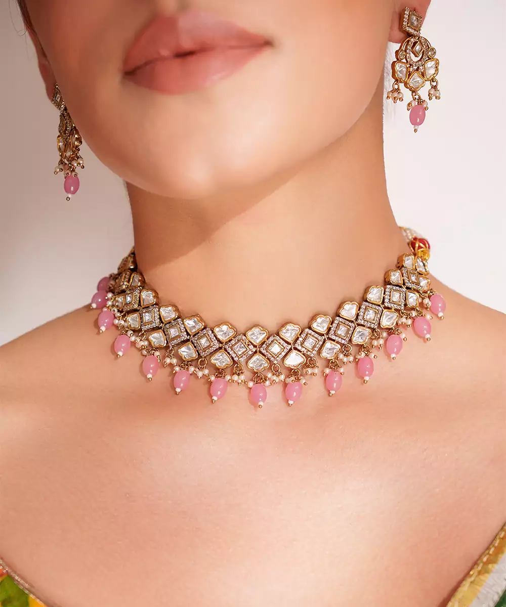 Dramatic Kundan Necklace In Two Tone Finish With Pink Pearls, Paired With Matching Earrings. Perfect To Make A Statement At Any Occasion.