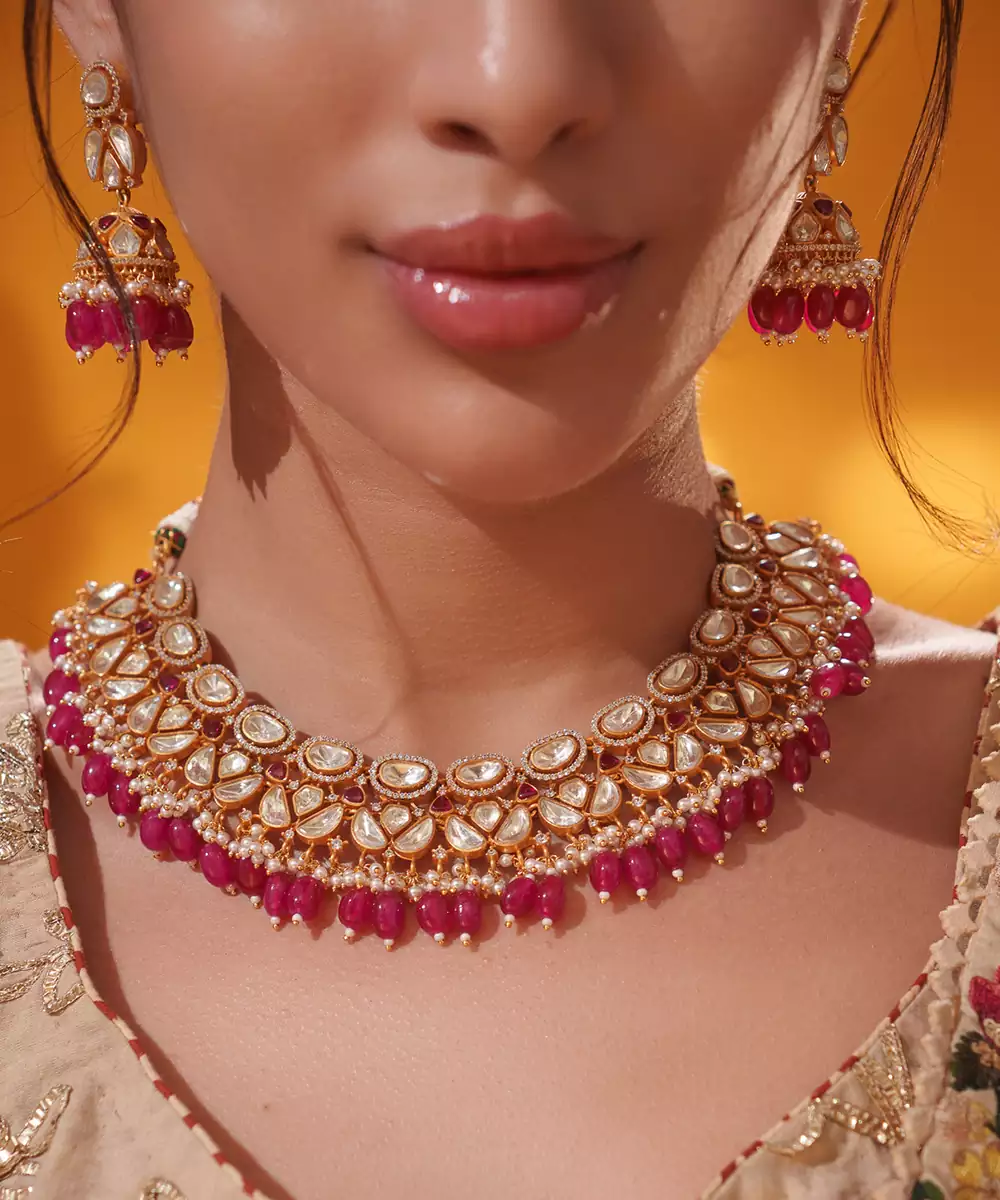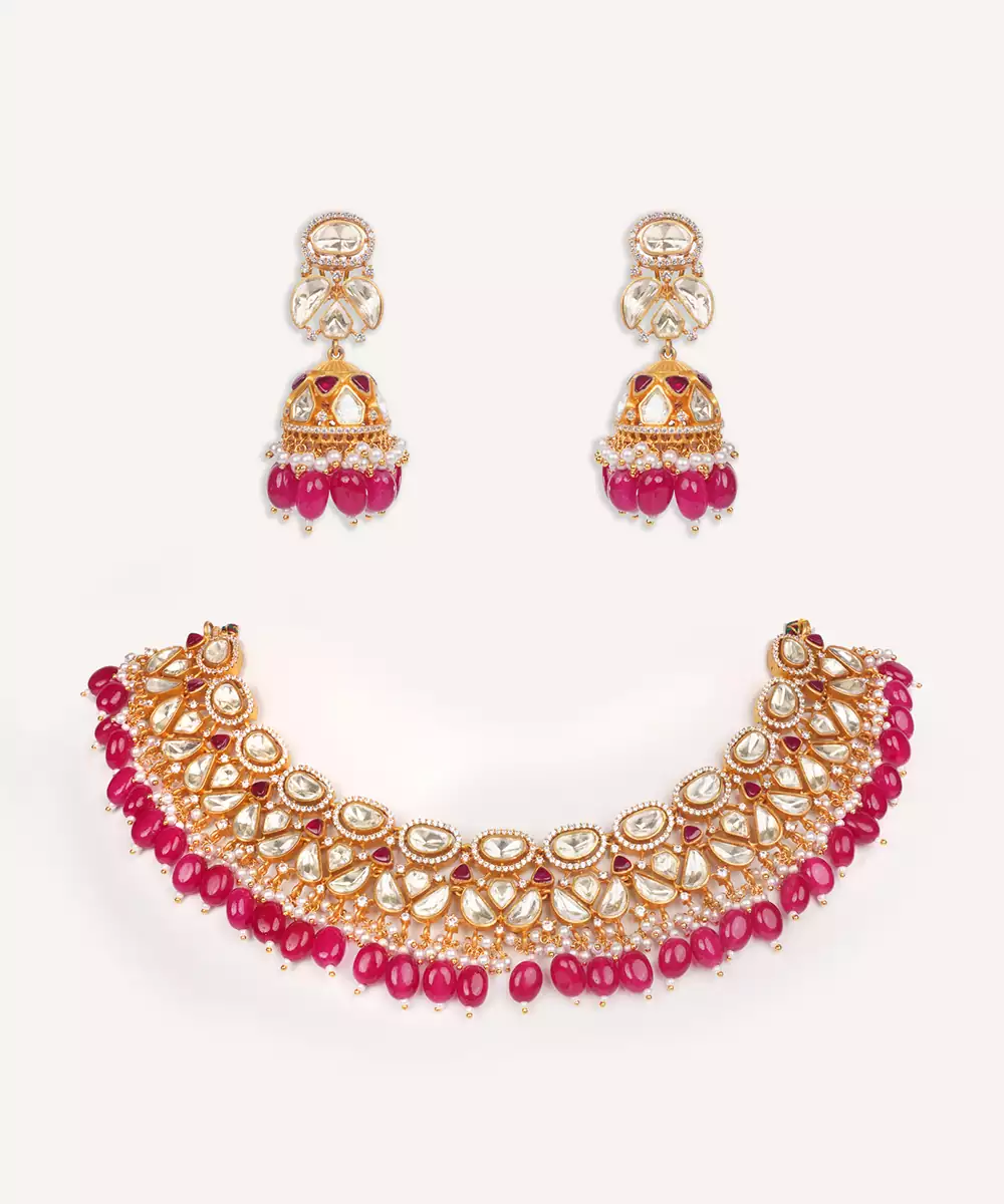 Dramatic Moissanite Set With Red Pearls Along With Matching Jhumki Earrings. Perfect To Make A Statement At Any Occasion.