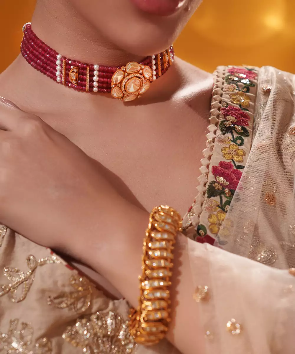Featuring A Stunning Fusion Of Heritage And Elegance, This Set Includes A Red Beaded Choker Adorned With A Central Moissanite Floral Motif. The Intricate Gold Detailing And Delicate Pearl Accents Elevate Its Regal Appeal. Paired With Matching Moissanite Earrings, This Set Is Perfect For Festive Or Bridal Occasions.