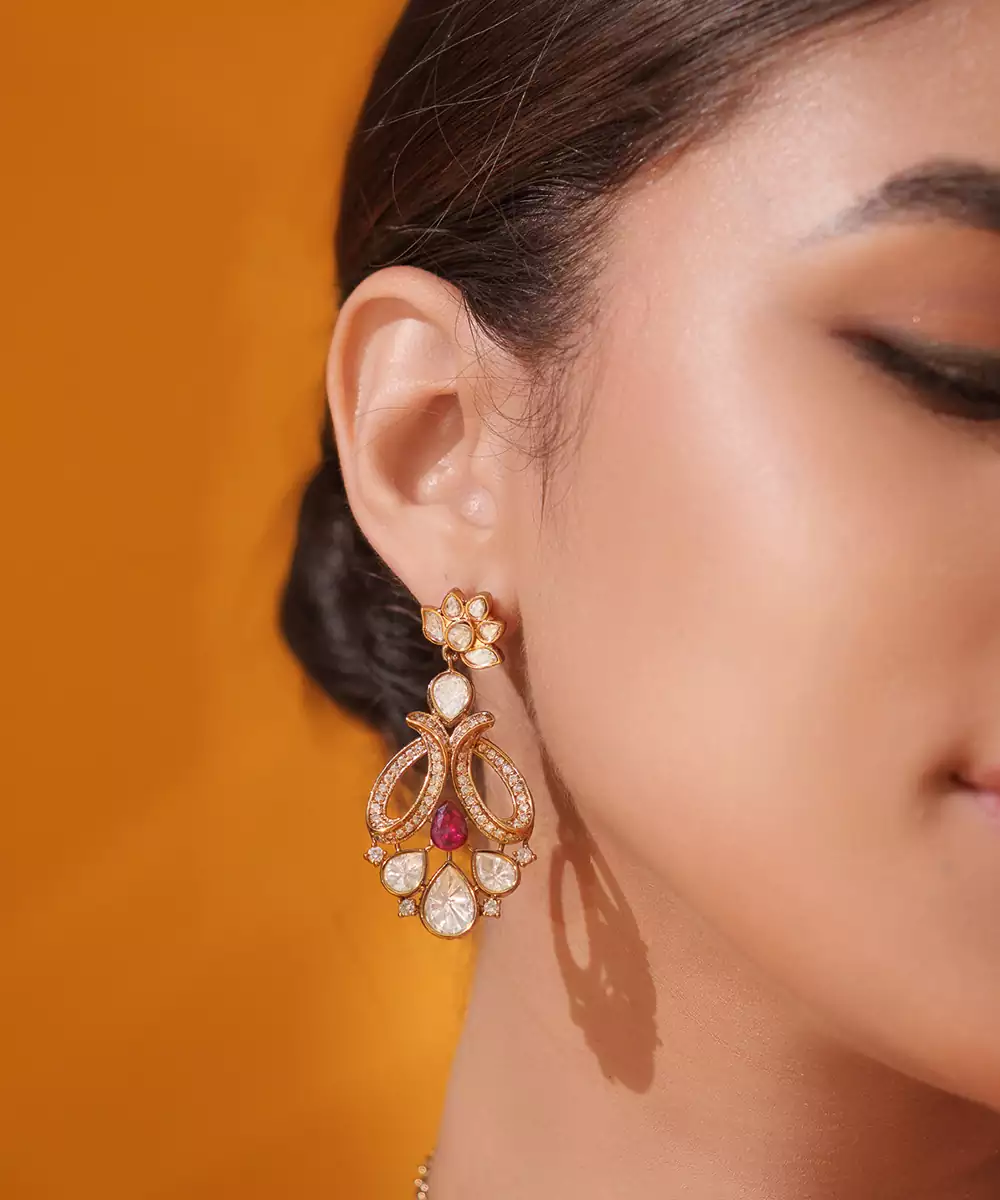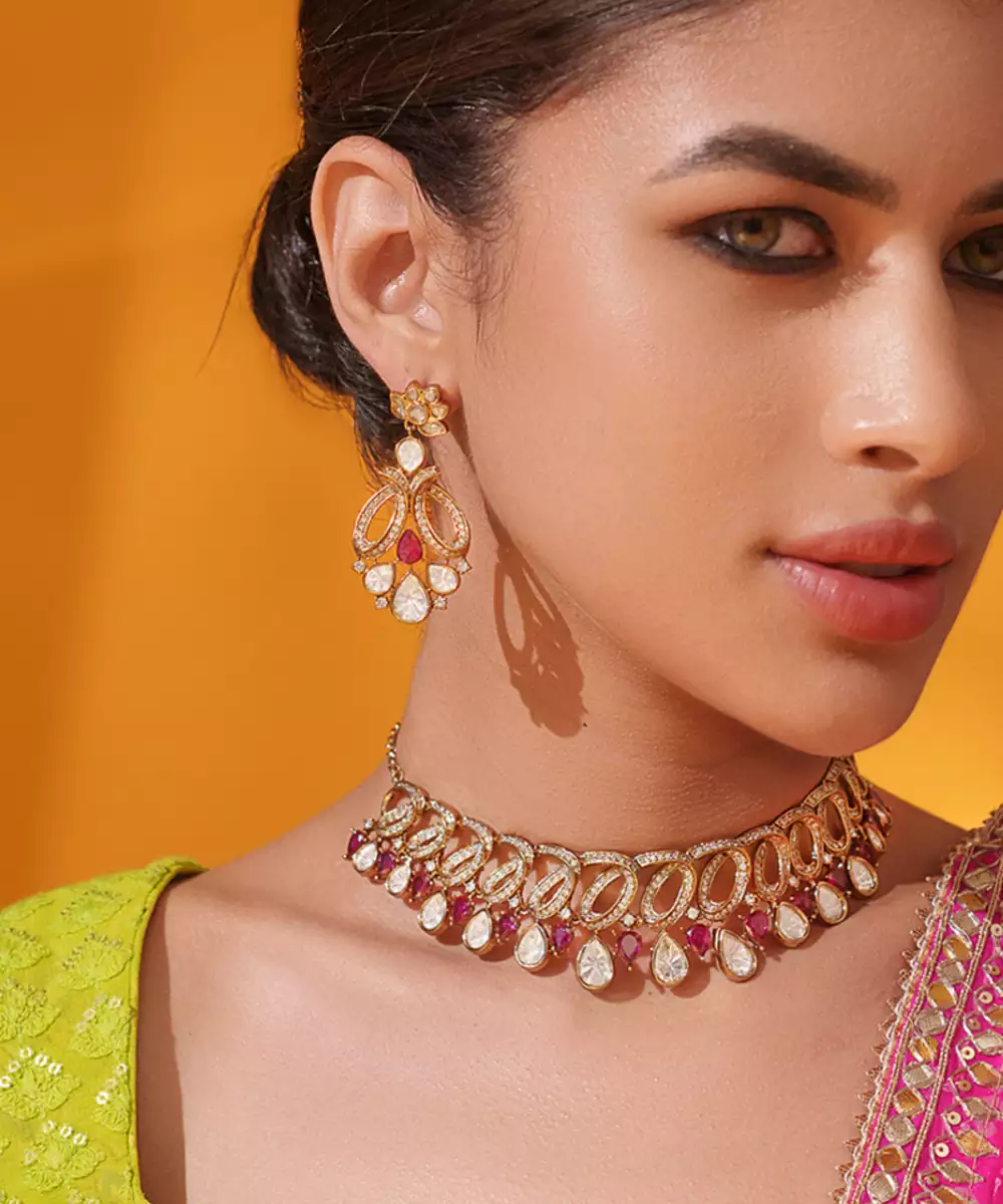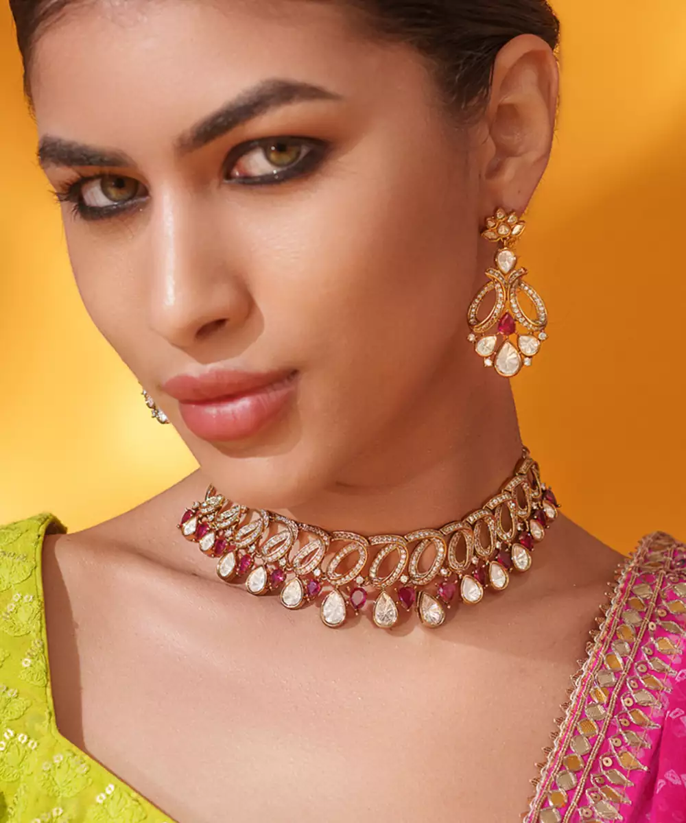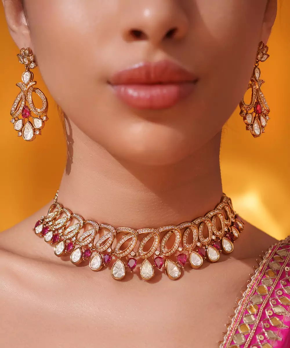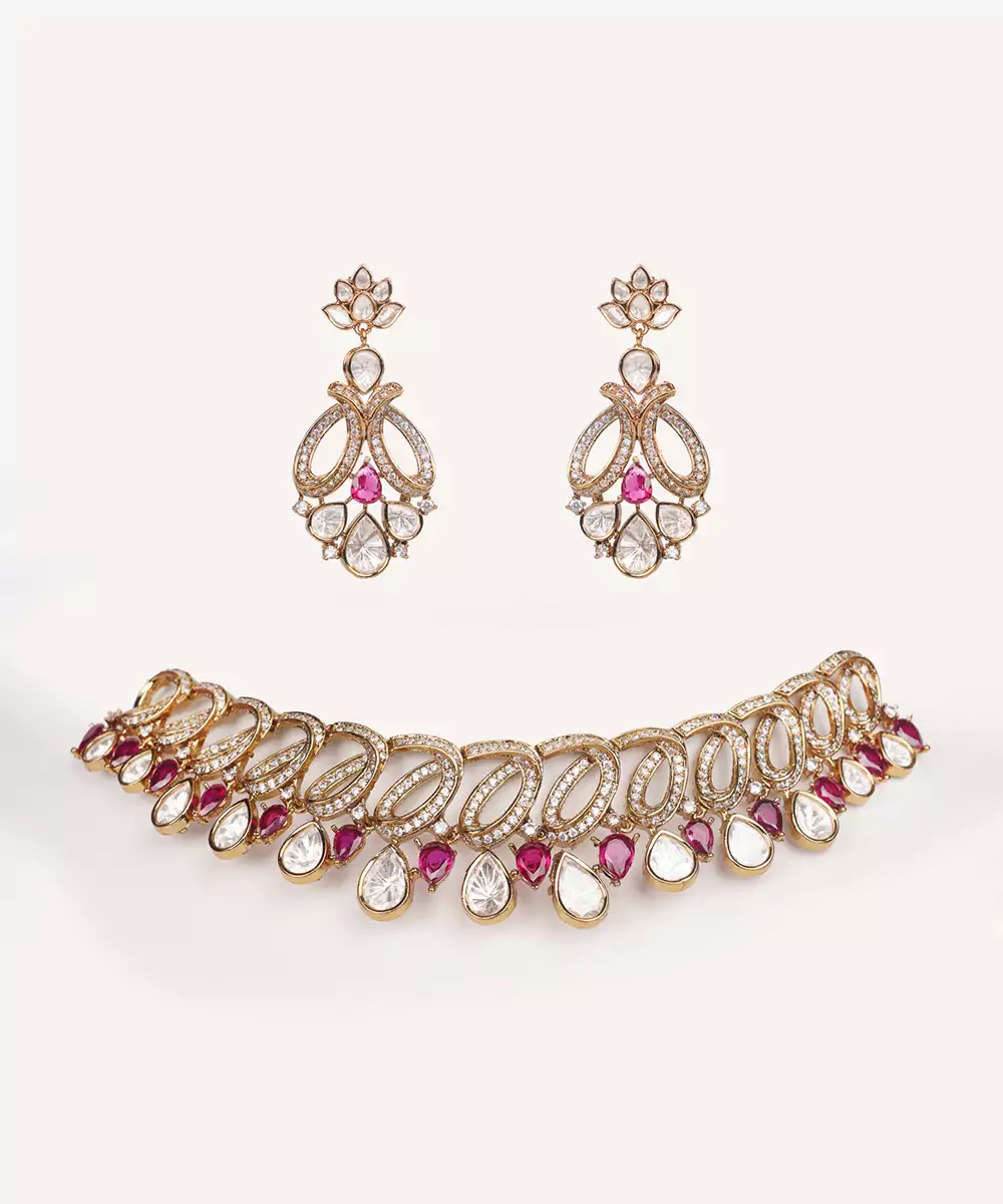 A Regal Necklace Set Adorned With Uncut Polkis In Two Tone Finish. The Touch Of Red Stones Adds A Refreshing Contrast, Making It A Perfect Blend Of Heritage Charm And Timeless Grace. It Comes With A Pair Of Matching Earrings. Perfect For Every Occasion.