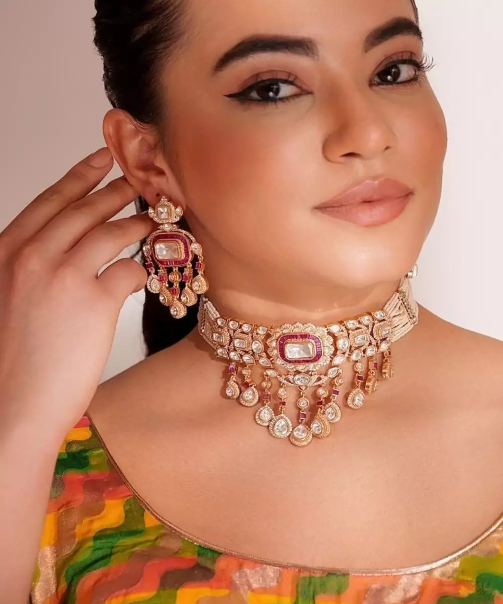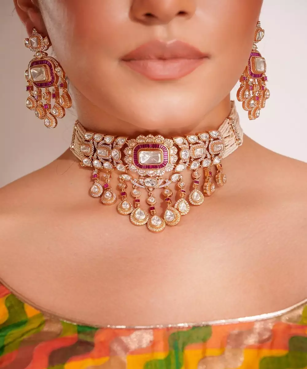 Featuring A Gold Finish Choker Studded With Kundan Polki, Set In Mix Metal. It Is Paired With Matching Earrings And Maangtikka. Perfect Wear For A Wedding Or Festive Occasion.