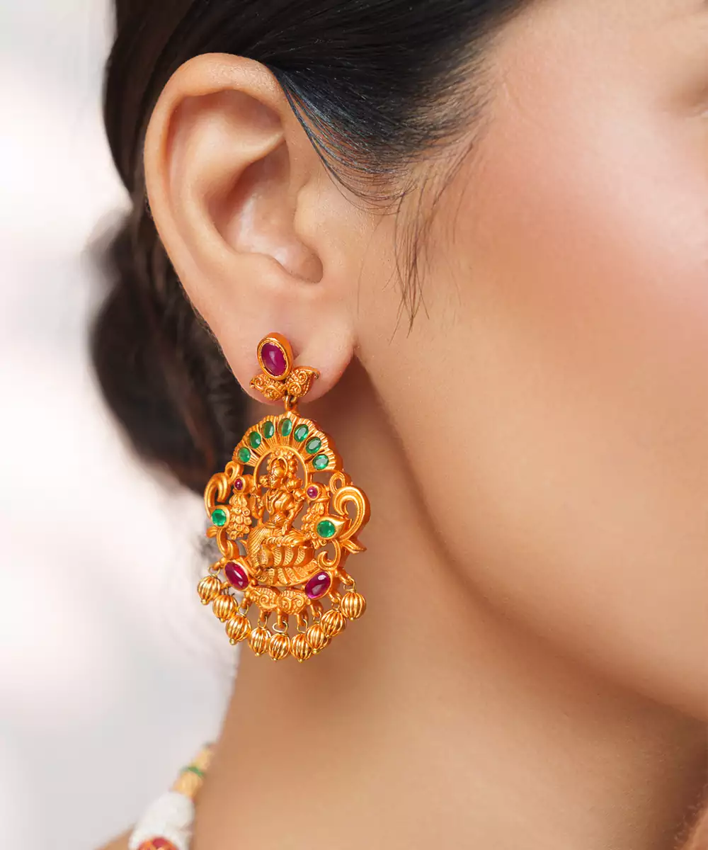 This Gold Plated Temple Choker Necklace Set Embodies Traditional Elegance And Intricate Craftsmanship. Featuring Exquisite Temple Inspired Motifs And A Radiant Gold Finish, It Exudes A Regal, Statement Appeal. Perfect For Weddings, Festive Occasions, Or Cultural Celebrations, It Beautifully Enhances Ethnic Ensembles With Timeless Charm, Grandeur, And Sophisticated Artistry.