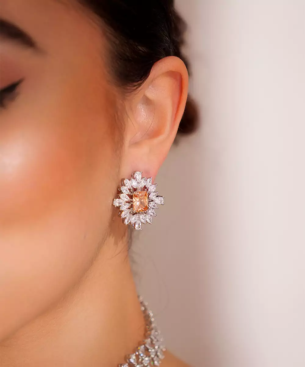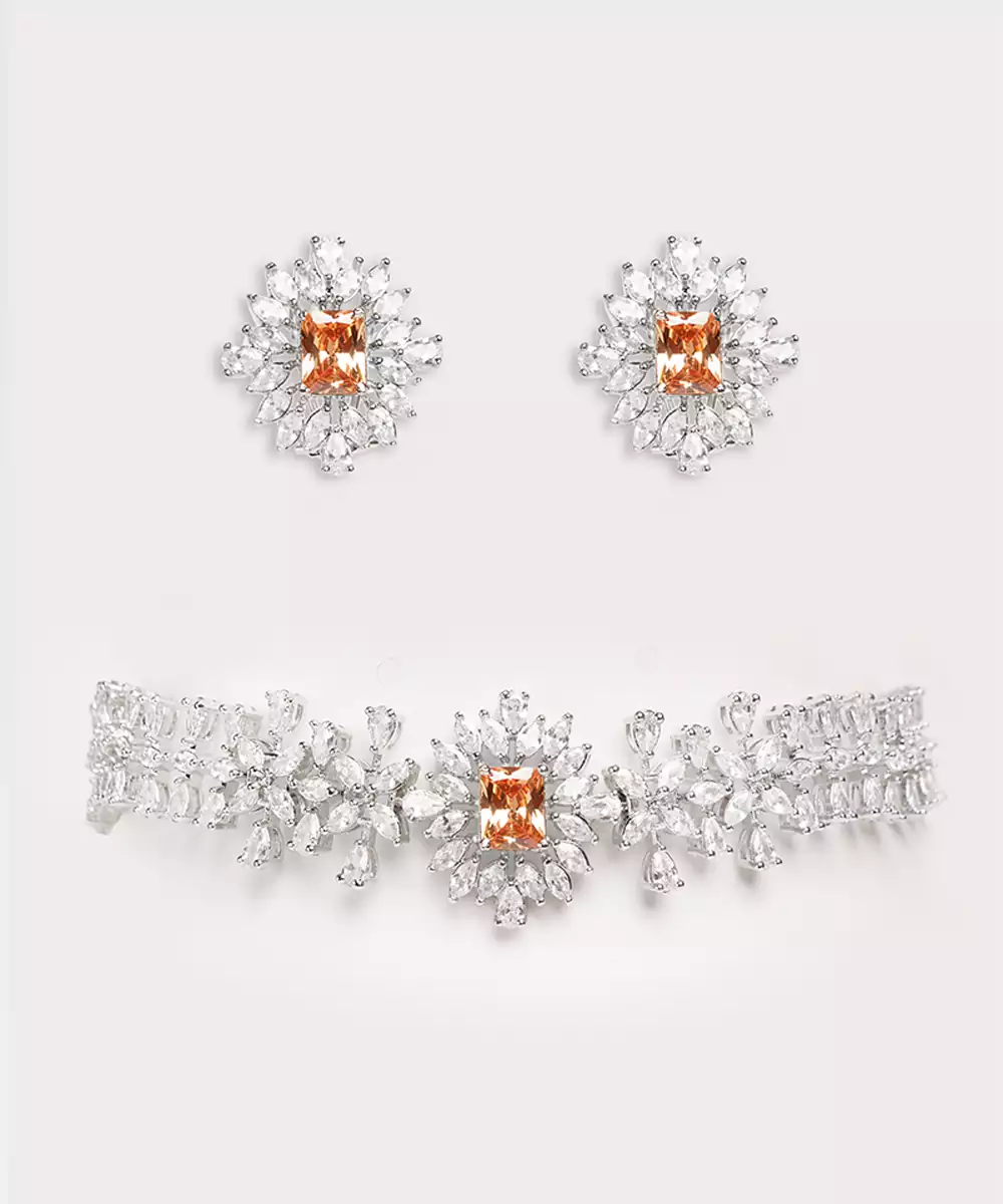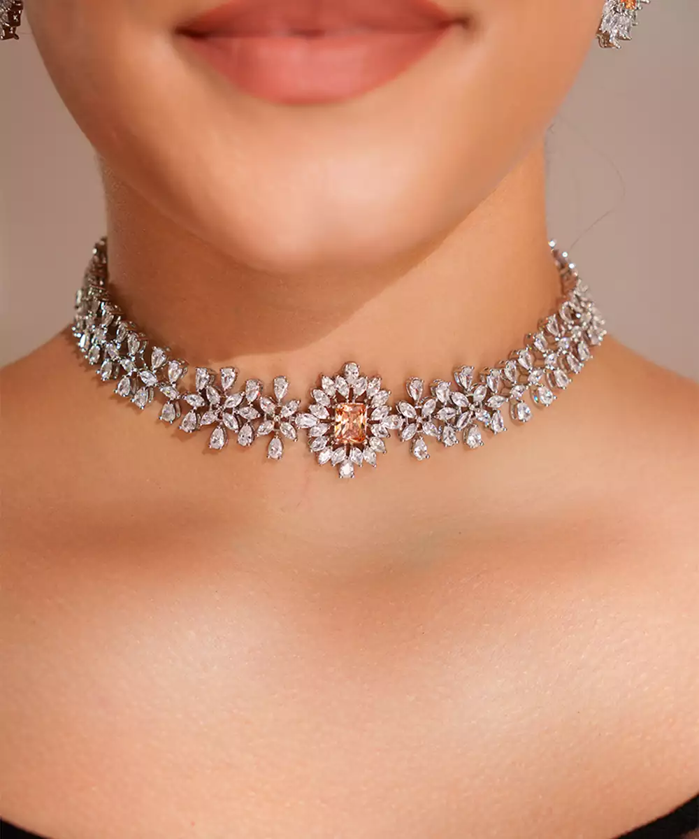 Featuring A White Finish Classy Diamond Choker With Peach Stone. It Comes With A Pair Of Matching Earrings. It Gives You A Luxurious And Sophisticated Appeal. Perfect For Weddings And Small Festivities.