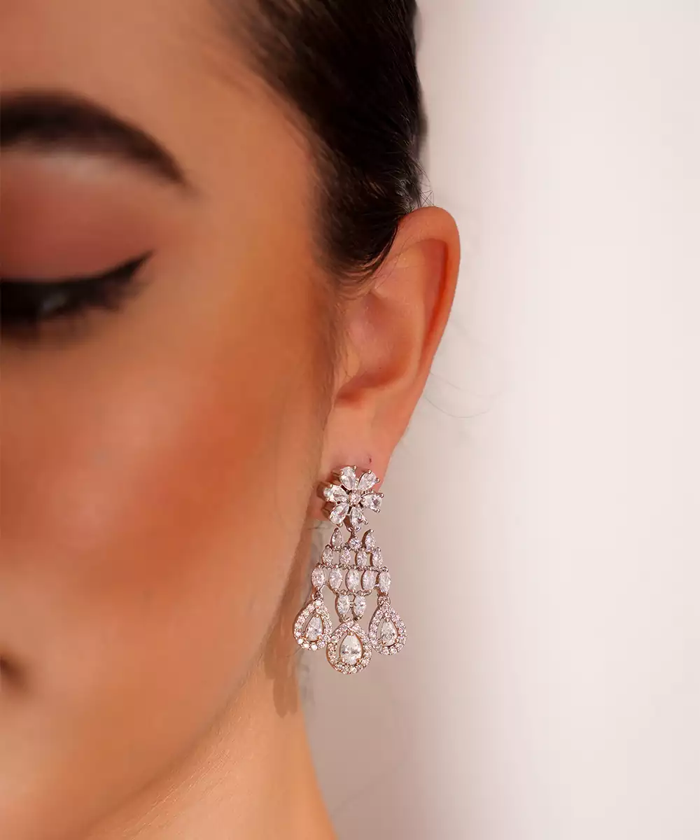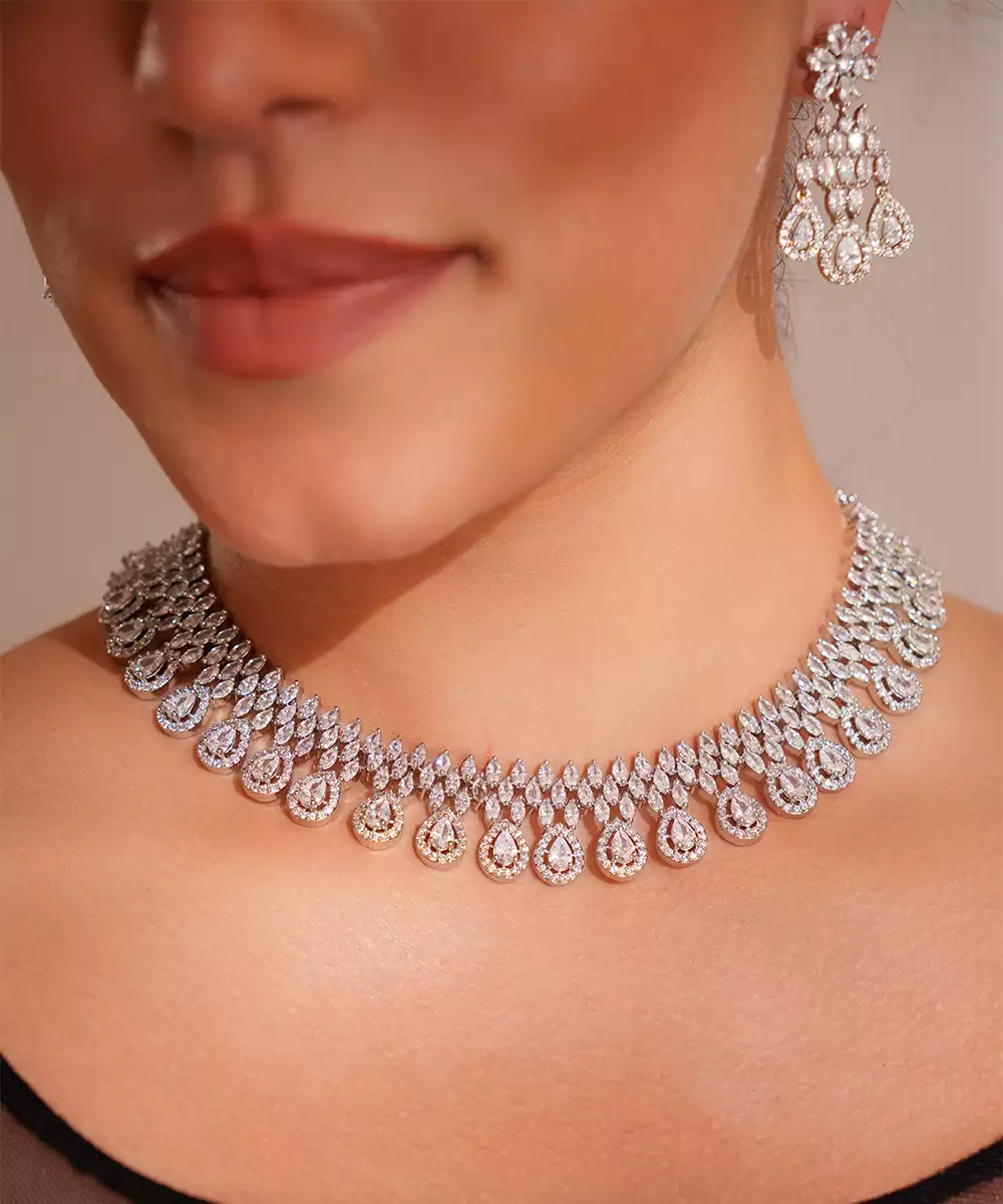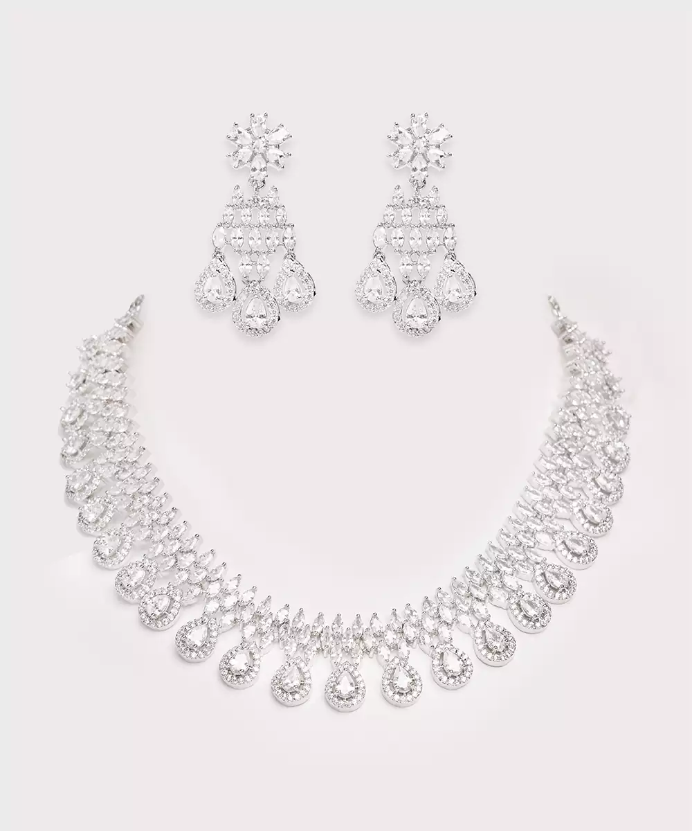 Featuring A White Finish Classy Diamond Necklace Set. It Comes With A Pair Of Matching Earrings. It Gives You A Luxurious And Sophisticated Appeal. Perfect For Every Occasion.