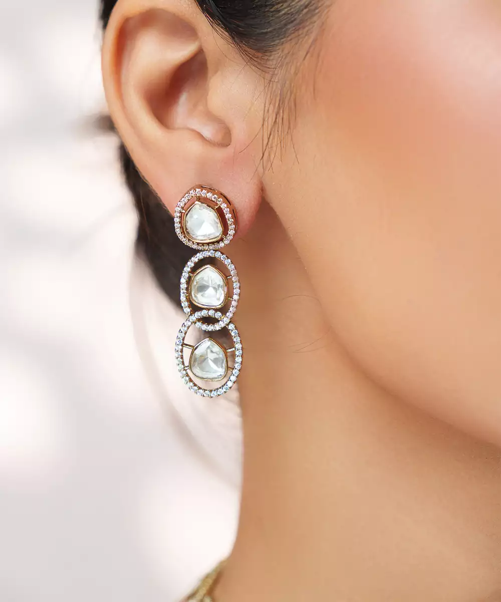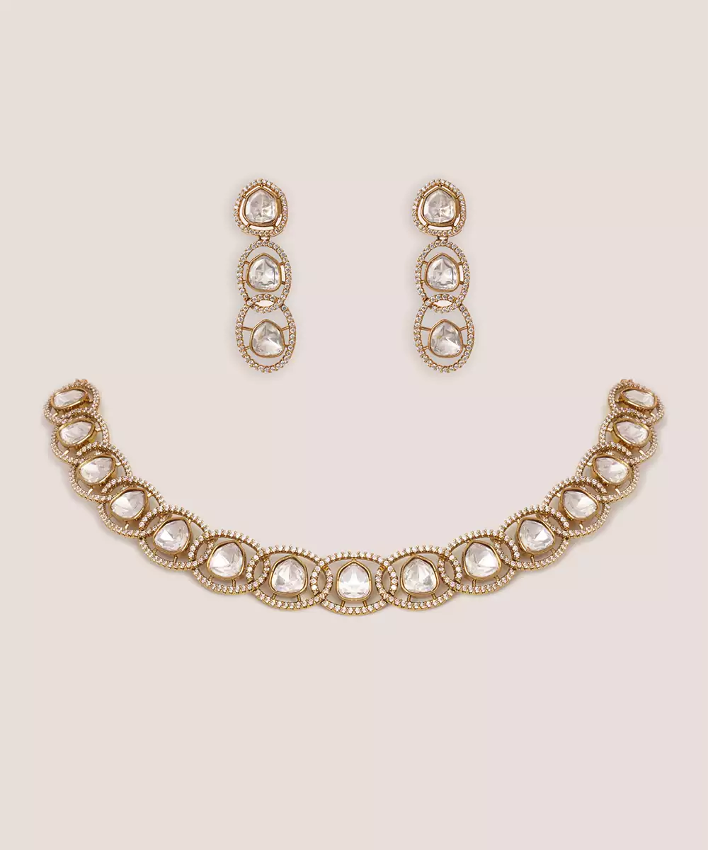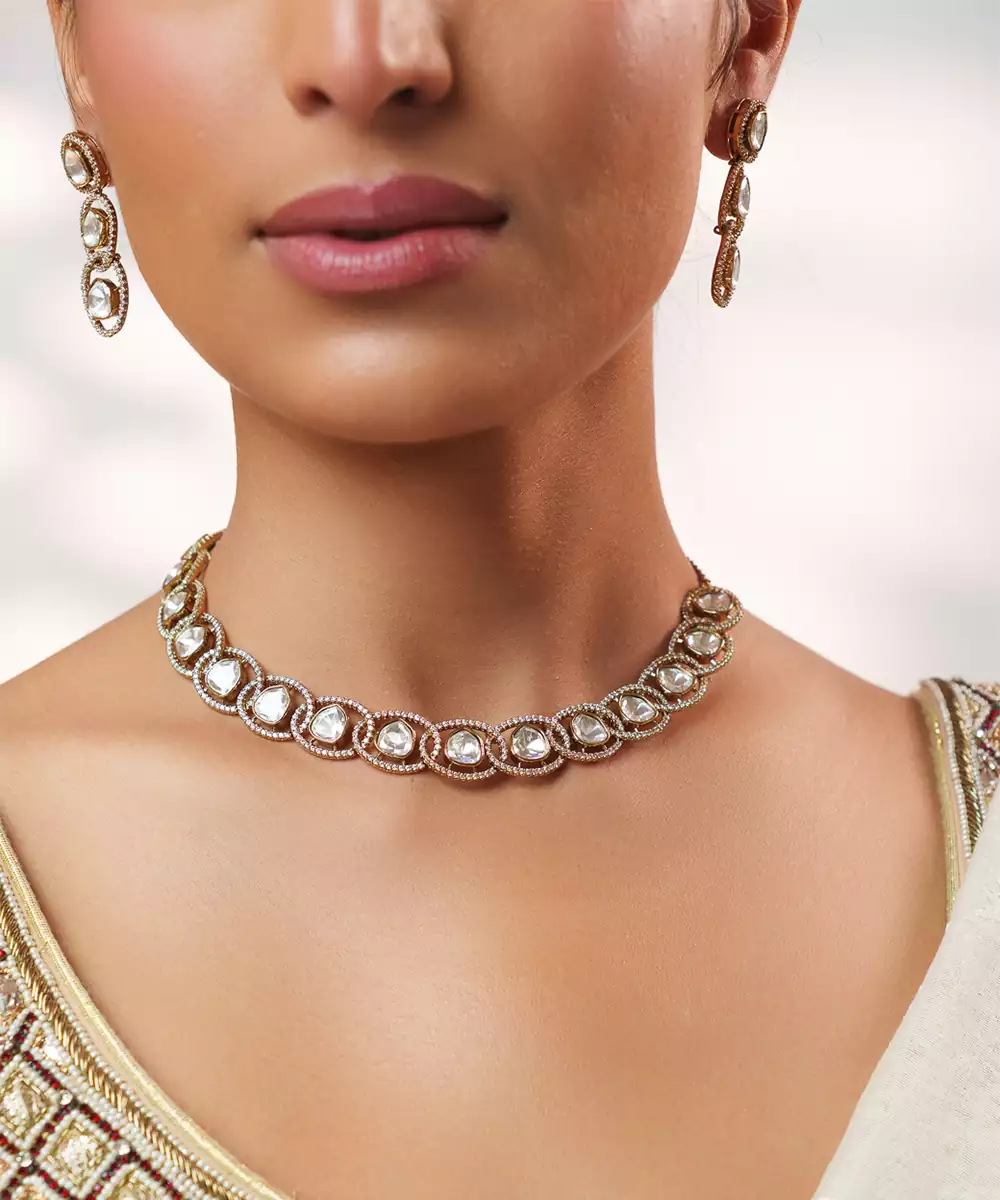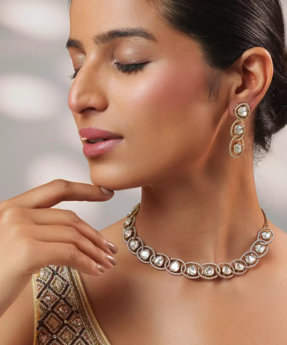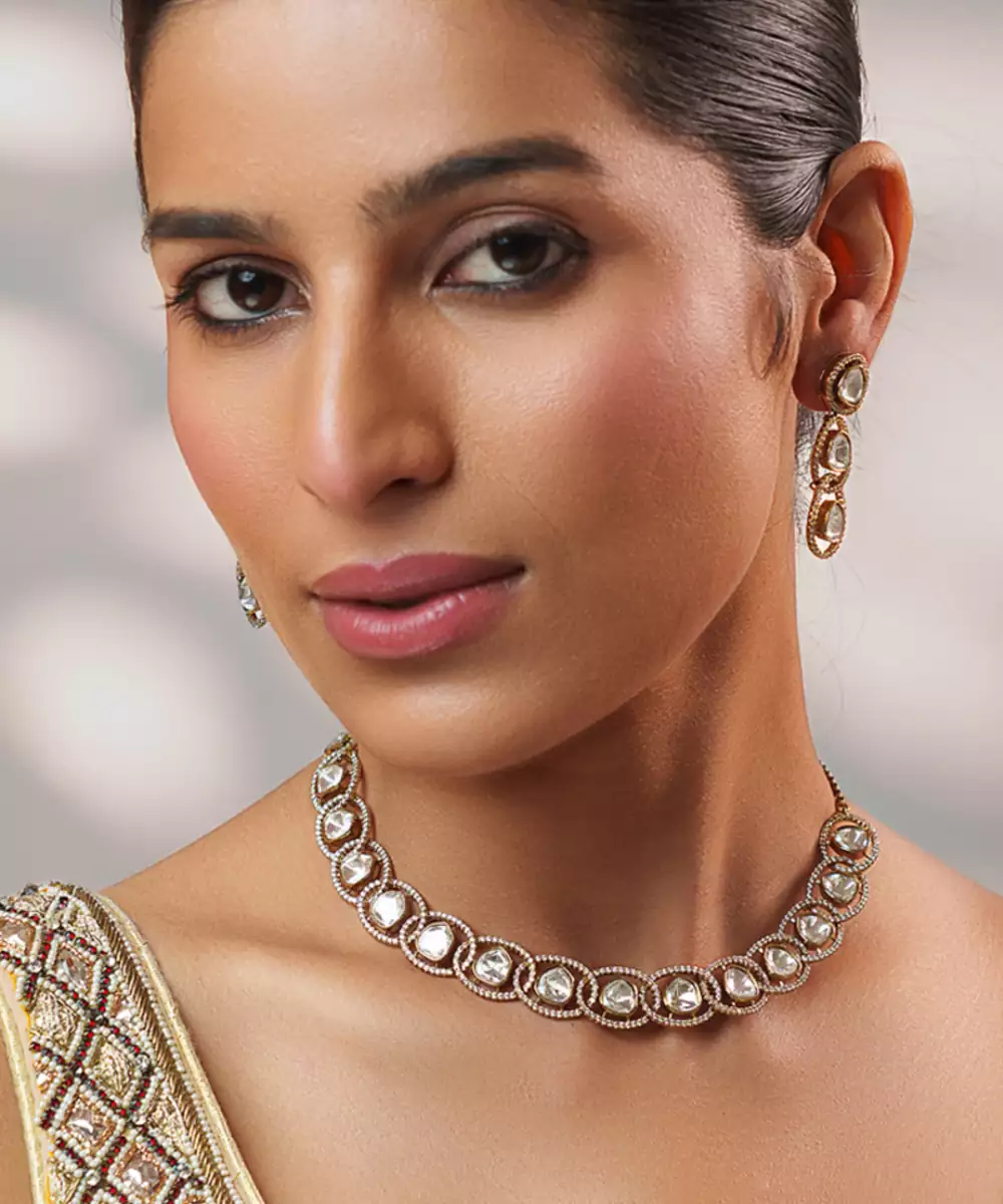 This Two Tone Plated Kundan Necklace Set Blends Traditional Artistry With Contemporary Elegance. Featuring Intricately Set Kundan Stones Enhanced By A Striking Dual Tone Finish, It Offers A Regal, Statement Appeal. Perfect For Weddings, Festive Occasions, Or Celebrations, It Elevates Ethnic Ensembles With Timeless Charm, Sophisticated Craftsmanship, And Refined Sophistication.
