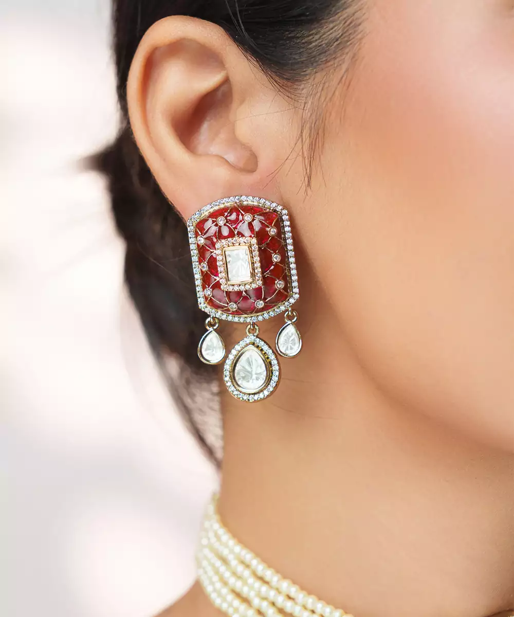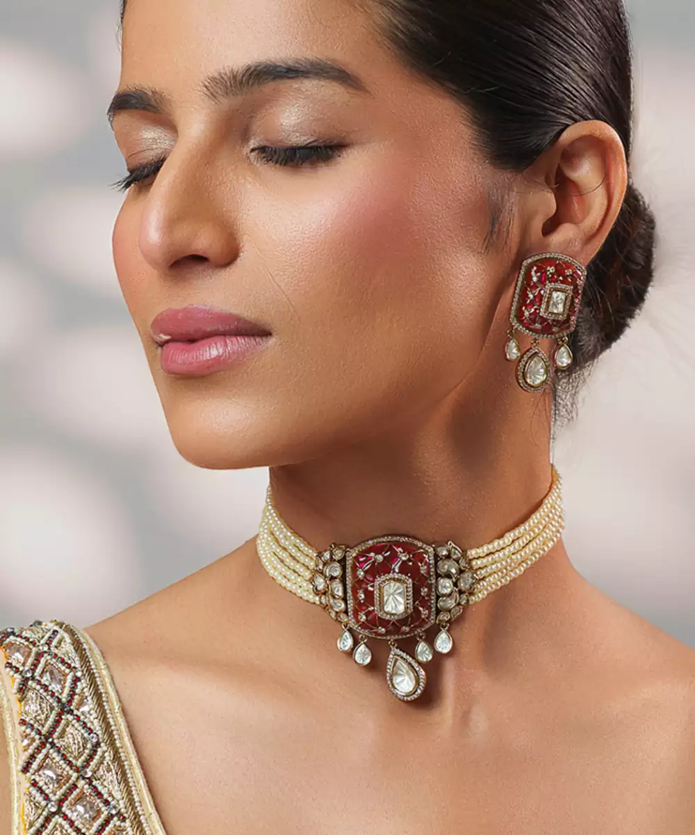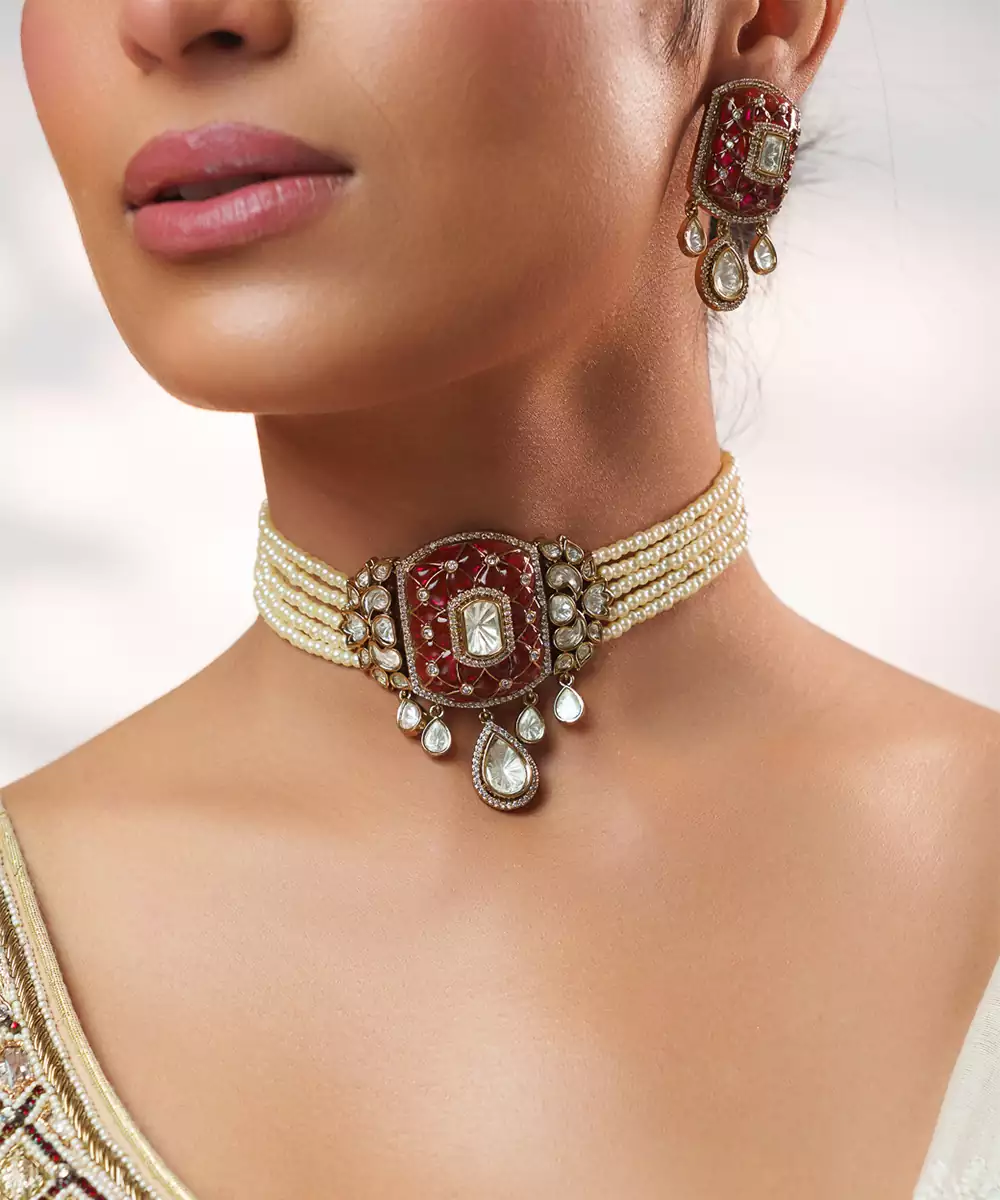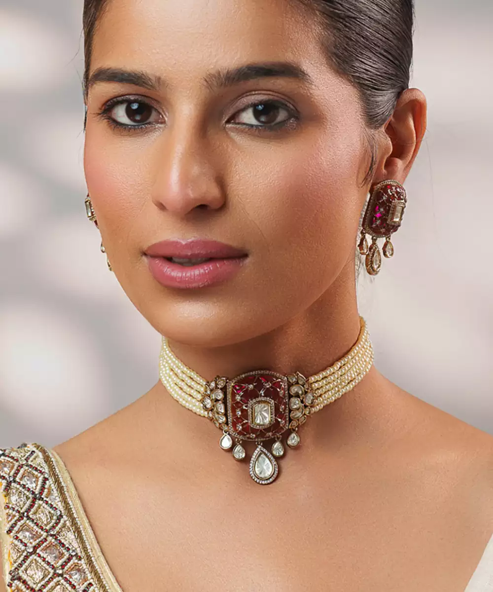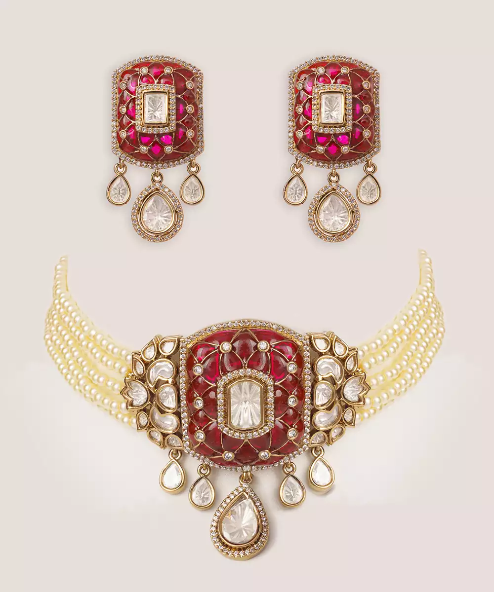 This Two Tone Plated Kundan Pink Stone Choker Necklace Set Showcases Regal Elegance And Intricate Craftsmanship. Adorned With Beautifully Set Green Stones And A Striking Dual Tone Finish, It Offers A Luxurious, Statement Appeal. Perfect For Weddings, Festive Celebrations, Or Special Occasions, It Enhances Traditional Ensembles With Rich Color, Timeless Charm, And Refined Sophistication.