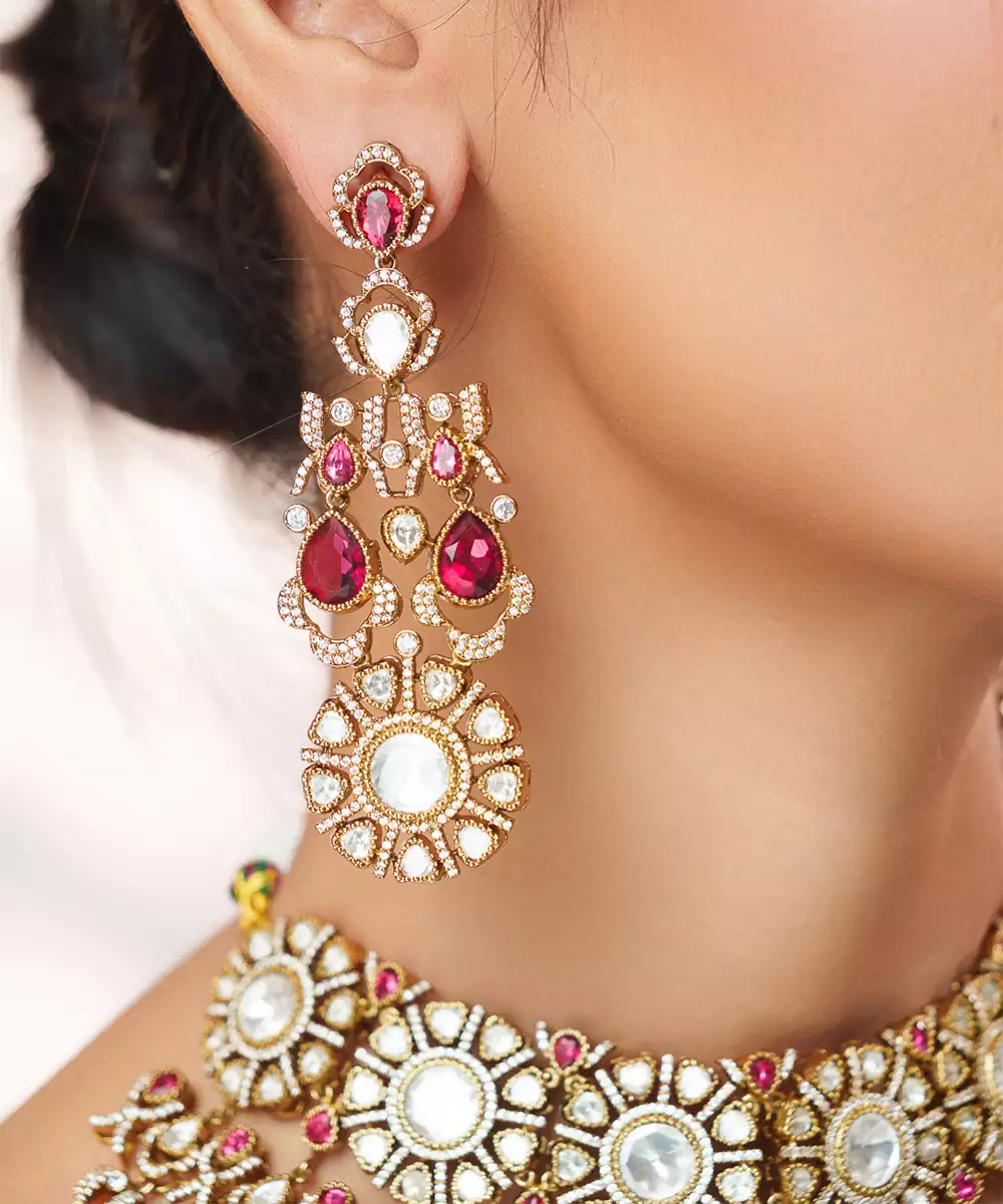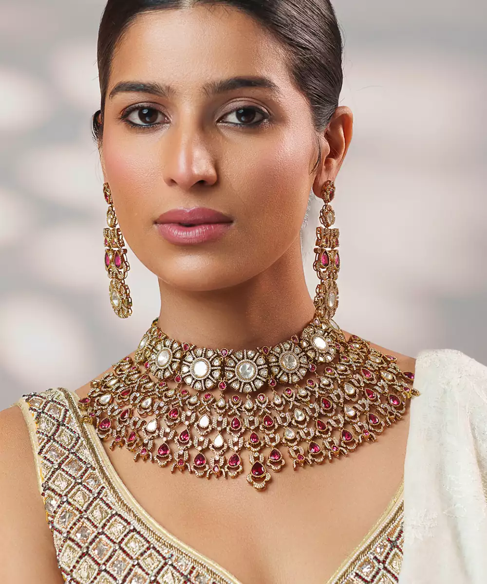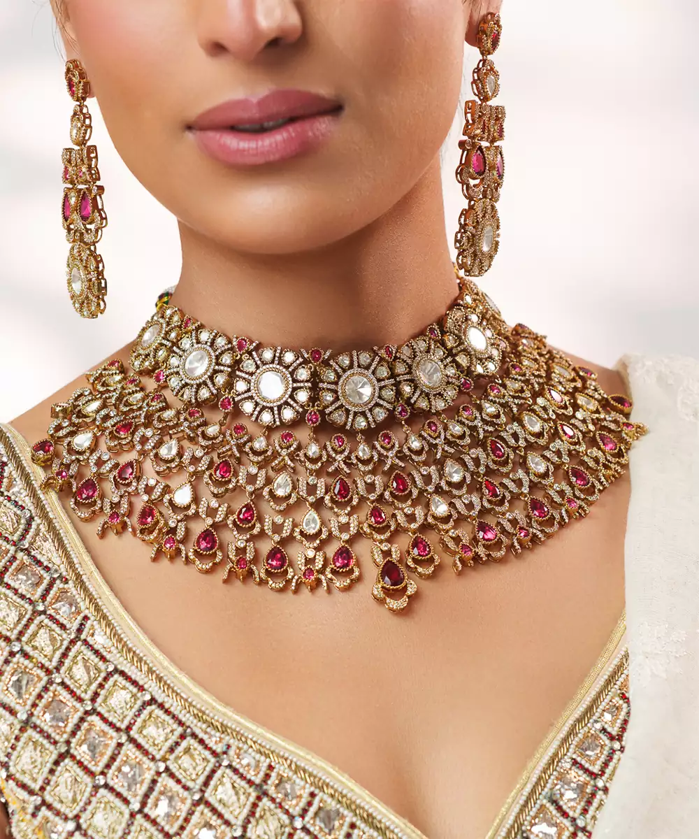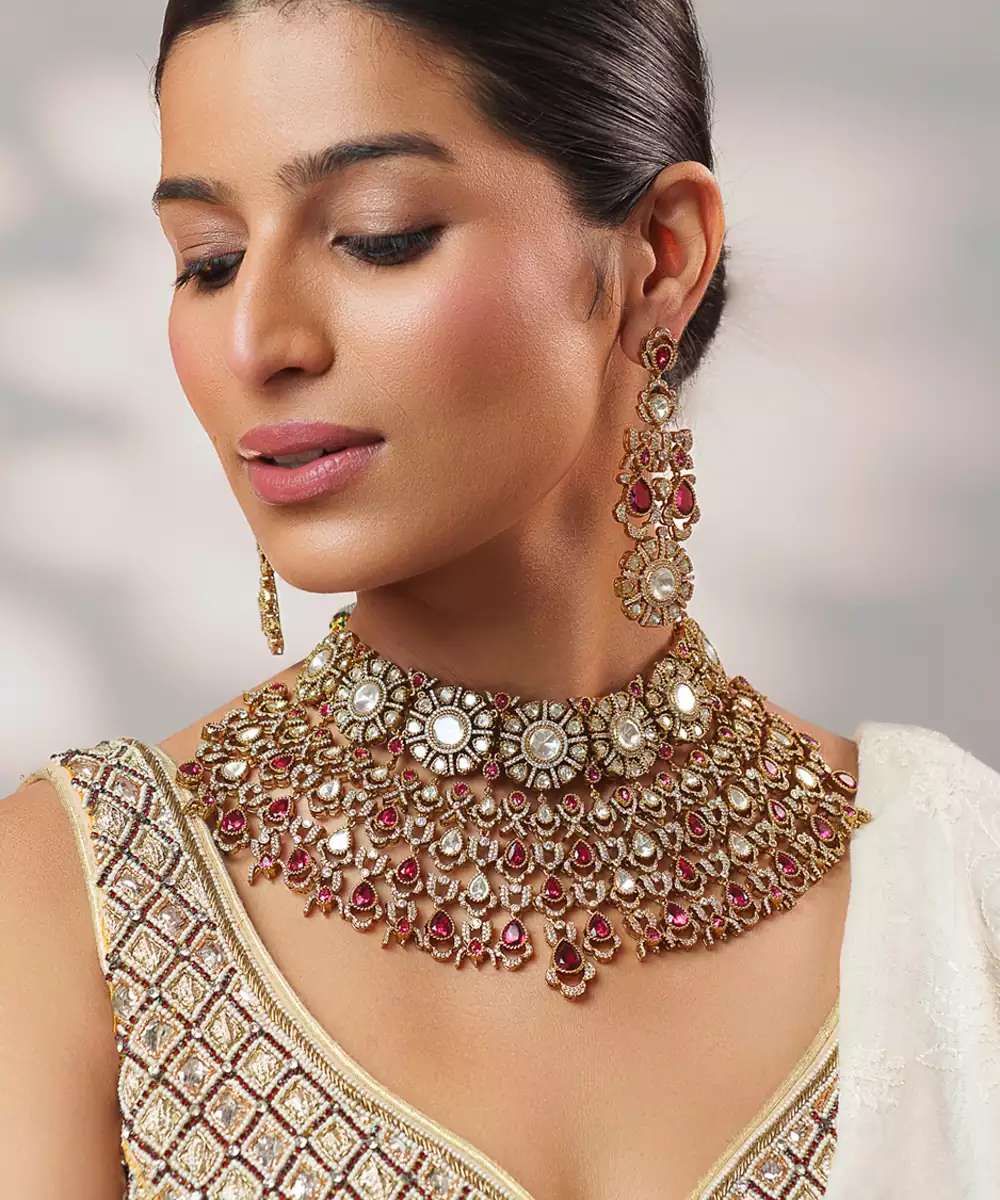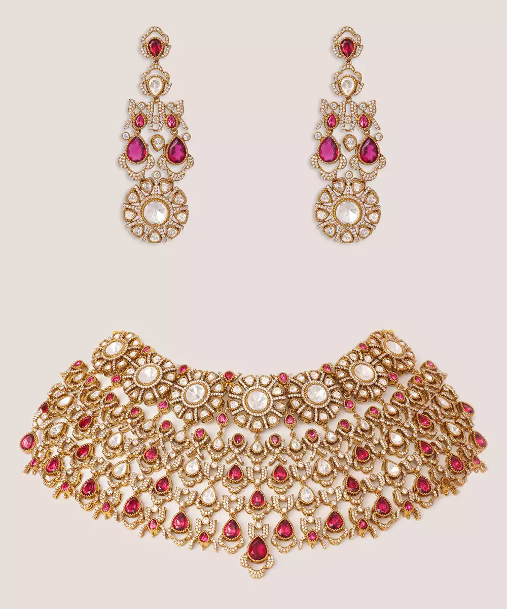 This Two Tone Plated Kundan Red Stone Necklace Set Exudes Regal Elegance And Traditional Charm. Crafted With Intricate Detailing, It Features Beautifully Set Green Stones Complemented By A Dual Tone Finish. Perfect For Weddings, Festive Occasions, Or Celebrations, It Enhances Ethnic Ensembles With A Rich, Sophisticated Appeal And Timeless Grace.