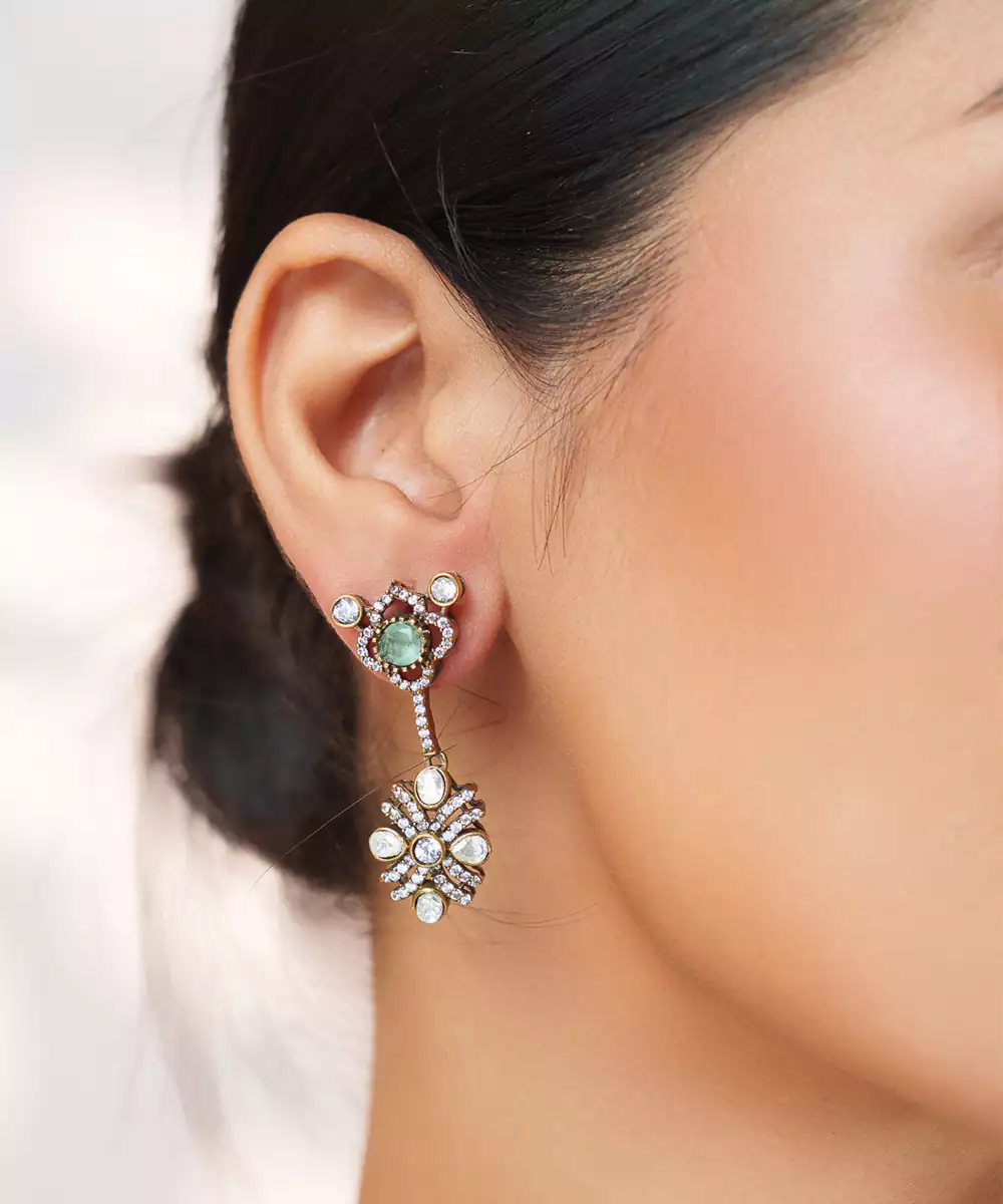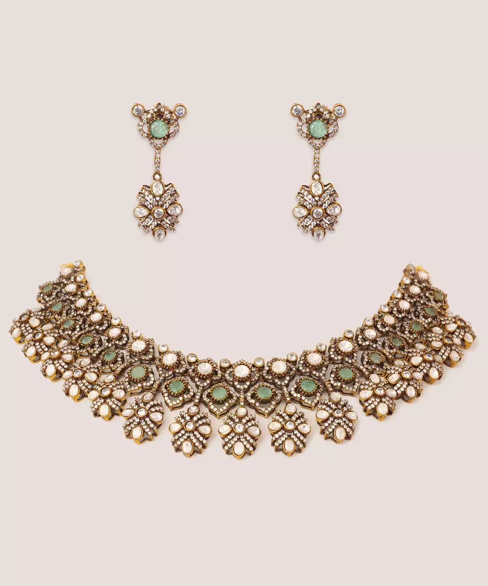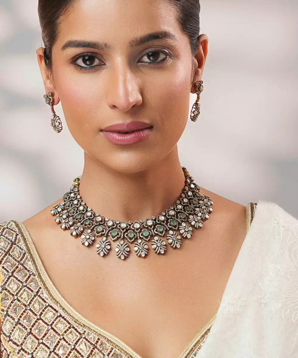 This Two Tone Plated Kundan Green Stone Necklace Set Exudes Regal Elegance And Traditional Charm. Crafted With Intricate Detailing, It Features Beautifully Set Green Stones Complemented By A Dual Tone Finish. Perfect For Weddings, Festive Occasions, Or Celebrations, It Enhances Ethnic Ensembles With A Rich, Sophisticated Appeal And Timeless Grace.