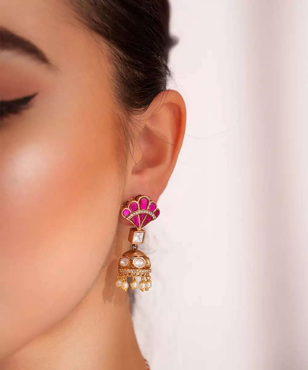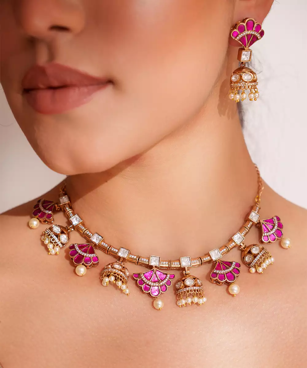 Featuring A Two Tone Finish Necklace Studded With Pink Stones, Set In Mix Metal. It Is Paired With Matching Earrings. Perfect Wear For A Wedding Or Festive Occasion.